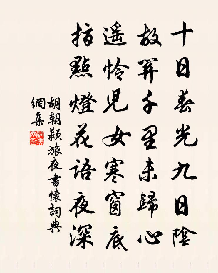 詩詞名句歷史字典書法欣賞書法字典國語詞典說文解字康熙字典古漢語字典標 題 作 者 詩 句 旅夜書懷作者:胡朝潁 朝代:宋代旅夜書懷原文十日春光九日陰,故關千里未歸心。遙憐兒女寒窗底,指點燈花語夜深。詩詞問答問:旅夜書懷的作者是誰?答:胡朝潁問:旅夜書懷寫於哪個朝代?答:宋代胡朝潁旅夜書懷書法欣賞旅夜書懷書法作品詩詞推薦寄同州田長史王建〔唐代〕除聽好語耳常聾,不見詩人眼底空。莫怪出城為長史,總緣山在白雲中。九日懷襄陽盧明甫〔宋代〕峴山不可見,風景令人愁。宜城多美酒,歸與葛強游。奉贈李八丈判官(曛)杜甫〔唐代〕我丈時英特,宗枝神堯後。珊瑚市則無,騄驥人得有。早年見標格,秀氣沖星斗。事業富清機,官曹正獨守。頃來江城子·填張春溪西湖竹枝詞張惠言〔清代〕碧雲無渡碧天沉,是湖心,是儂心。心底湖頭,路斷到如今。郎到斷橋須有路,儂住處,柳如金。南高峰上望郎登括水調歌林正大〔宋代〕落日峴山下,倒著接?回。傍人笑問山翁。日日醉歸來。三萬六千長日,一日杯傾三百,罍麴恐糟台。漢水鴨頭綠偶題徐夤〔唐代〕閒補亡書見廢興,偶然前古也填膺。秦宮猶自拜張祿,楚幕不知留范增。大道豈全關歷數,雄圖強半屬賢能。燕台雜興十二首方回〔宋代〕風高紫蘭摧,雪近 * 槁。物理有代謝,焉得長美好。古聖毓庶物,必欲使壽老。不幸凶短折,豈若保終考。莊生桂林宴交代董侍郎樂語口號李曾伯〔宋代〕同是虛皇老從臣,海山深處細論心。金蘭誼篤新藩翰,玉筍班趨舊禁林。對月不妨延桂影,思人惟有護棠陰。公歸上冢錢時〔宋代〕春到人家齊上冢,紙錢蒿裏白皚皚。獺魚豺獸難磨滅,豈是師門學得來。簡雲臥趙崇鉘〔宋代〕憶君心事如流水,流向江頭作暮潮。想得潮平沙有雪,白鏗鐵版和 * 。夢范參政陸游〔宋代〕夢中不知何歲月,長亭慘澹天飛雪。酒肉如山鼓吹喧,車馬結束有行色。我起持公不得語,但道不料今遽別。平生鼓吹曲曹勛〔宋代〕按節臨瀚海,舒軍輝朔方。幕中延揖客,馬首系降王。封君行負弩,天子賜干將。後乘騰沙漠,前驅過渭陽。簫鼓葉生歸縉雲楊億〔宋代〕出門西望長安笑,抱璞來求善價沽。惟罄囊裝買群籍,不持刺字謁當塗。鱸魚漸熟思歸切,羊酷初嘗得味無。送子感懷詩二章奉使中原署館壁韓熙載〔唐代〕仆本江北人,今作江南客。再去江北游,舉目無相識。金風吹我寒,秋月為誰白。不如歸去來,江南有人憶。未到聞子規釋斯植〔宋代〕十年已起故鄉情,客里淒涼不耐聽。啼到蜀天空有恨,水流依舊月還明。四皓二首王安石〔宋代〕四皓秦漢時,招招莫能致。紫芝可以飽,粱肉非所嗜。谷廣水渙渙,山長雲泄泄。與其貴而拘,不若賤而肆。厄台李廌〔宋代〕今古俱無忌憚情,厄台猶敢尚為名。裔孫不復重瞳聖,俗目俱同瞽叟盲。見慍仲由空骯髒,膾肝盜跖尚彭亨。聖人沁園春(壽弟相國)吳淵〔宋代〕喜我新歸,逢戎初度,關情更深。正晝掩柴扉,□尋隱遁,□舒槐府,戎正經綸。白石清泉,紫樞黃閣,□□□□移竹次林英伯韻四首林季仲〔宋代〕蒼苔斲破斧痕新,移傍頹檐慰病身。見我渾如舊相識,此君端是箇中人。孤高自比西山潔,澹泊寧甘南巷貧。夢斷題神霄宮壁李抱一〔宋代〕一粒金丹續命基,算來由我更由誰。神龜移入雲端去,彩鳳摶歸地母騎。溟涬浪中求白雪,崑崙山里采瓊枝。只消名句推薦馬不伏歷,不可以趨道;士不素養,不可以重國。班固《漢書·傳·眭兩夏侯京翼李傳》 人傷則離散,農傷則國貧。李大師、李延壽《南史·列傳·卷三十九》 紛披乍依迥,掣曳或隨風。李世民《詠興國寺佛殿前幡》 煙水茫茫,千里斜陽暮。山無數。亂紅如雨。秦觀《點絳唇·桃源》 扁舟去作江南客,旅雁孤雲。朱敦儒《採桑子·彭浪磯》 竹樹帶飛嵐,荇藻俱明麗。劉道著《湘江秋曉》 誰念西風獨自涼,蕭蕭黃葉閉疏窗,沉思往事立殘陽。納蘭性德《浣溪沙·誰念西風獨自涼》 不蔽人之善,不言人之惡劉向《戰國策·楚一·江乙為魏使於楚》 已知泉路近,欲別故鄉難。夏完淳《別雲間》 要問相思,天涯猶自短。晏幾道《清商怨·庭花香信尚淺》