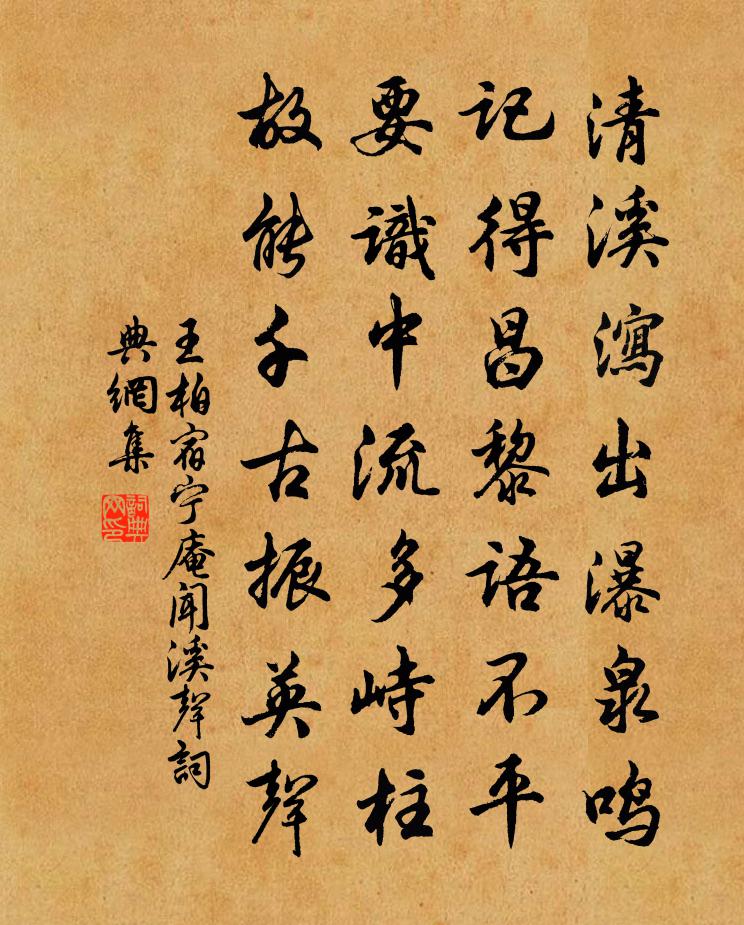 詩詞名句歷史字典書法欣賞書法字典國語詞典說文解字康熙字典古漢語字典標 題 作 者 詩 句 宿寧庵聞溪聲作者:王柏 朝代:宋代宿寧庵聞溪聲原文清溪瀉出瀑泉鳴,記得昌黎語不平。要識中流多峙柱,故能千古振英聲。詩詞問答問:宿寧庵聞溪聲的作者是誰?答:王柏問:宿寧庵聞溪聲寫於哪個朝代?答:宋代王柏宿寧庵聞溪聲書法欣賞宿寧庵聞溪聲書法作品詩詞推薦李與賢來訪,自言所居幽勝,甚似剡溪。因以楊萬里〔宋代〕山似剡溪溪似油,人如詩句句如秋。無邊春里花饒笑,有底忙時草喚愁。贈箕山僧張籍〔唐代〕久住空林下,長齋耳目清。 * 借客坐,石磹甃人行。似鶴難知性,因山強號名。時聞衣袖裡,暗掐念珠聲。送酒與莆萄與來石門陳著〔宋代〕山泉釀出苦醅硬,野蔓生來酸子圓。此味不投甜世界,遣教參透石翁禪。蝶戀花晏幾道〔宋代〕碧落秋風吹玉樹。翠節紅旌,晚過銀河路。休笑星機停弄杼。鳳幃已在雲深處。樓上金針穿繡縷。誰管天邊,隔歲和潘彥國見贈羅公升〔宋代〕風雨千山落葉秋,不知當歲泣尼丘。仲由有勇休憑虎,寧戚雖賢且飯牛。史筆謾貽來世恨,書生空替古人愁。憑君和趙員外良佐趙韓王故宅梅堯臣〔宋代〕開國勛庸大,重城邸第寬。枯楊映樓角,蔓草被牆端。不見分香妾,空餘鬥鴨闌。誰來悲孔雀,金翠羽毛殘。寄丘三公詩江淹〔南北朝〕昔我學冠劍。逢君在三川。何意風雨激。一訣異東西。菊秀空應奪。蘭芳幾時堅。常恐握手畢。黯如光絕天。安得小梅花賀鑄〔宋代〕思前別。記時節。美人顏色如花發。美人歸。天一涯。娟娟姮娥,三五滿還虧。翠眉蟬鬢生離訣。遙望青樓心欲絕合澗橋董嗣杲〔宋代〕危闌壓定活流重,誰識錢源繞梵宮。兩澗共歸橋底合,萬雷莫敵水聲雄。遊人移步心還恐,野衲棲禪耳欲聾。石倚和邃卿張學士暑夕余靖〔宋代〕危坐空齋暝色低,三金才伏火將西。煙蒙細草流螢度,月上疏林倦鵲棲。荃葛野裳交羽扇,桔槔鄰圃響蔬畦。中宵問蔡肇求李公麟畫觀音德雲蘇轍〔宋代〕好事桓靈寶,多才顧長康。何嘗為人畫,但可設奇將。久聚要當散,能分慰所望。清新二大士,畀我夜燒香。挽師虞卿三首劉宰〔宋代〕蚤歲謀生愧弟昆,一窗容膝眇乾坤。田園歲晚非能事,祗有詩書遺子孫。送茶與執禮以詩來謝和之胡寅〔宋代〕簞瓢曾不飽顏回,何事新茶轉海來。八餅尚懷經幄賜,一苞聊對嶺雲開。分君要使澆書腹,待客應須罷酒罍。自笑春懷顧況〔唐代〕園鶯啼已倦,樹樹隕香紅。不是春相背,當由己自翁。水調歌頭(壽梁多竹八十)趙必〔宋代〕百歲人能幾,七十世間稀。何況先生八十,蔗境美如飴。好與七松處士,更與梅花君子,永結歲寒知。菊節先五日杪歲徐集孫〔宋代〕幾多風月費招邀,傳舍侵尋一載僑。客久夢魂安澹泊,歲殘老態厭喧囂。晴空雪片飄梅瓣,冷地春光上柳條。世事家園示弟槱鄭樵〔宋代〕竹床讀史慣,土銼勿粘塵。灑掃王維德,澆鋤郭太仁。使才看著屐,有道驗時薪。小物汝知謹,同心作古人。天台梵才師長吉在都數以詩筆見授因答以轉句宋祁〔宋代〕比來緇侶頗言文,侷促啁啾寧足論。私地蛙鳴徒聒耳,長沙國小僅回身。對竹丘葵〔宋代〕此君無媚色,耿耿合予衷。外直形容瘦,中虛忿慾空。炎涼多變熊,瀟瀟獨清風。倖免斧斤患,蒼然保令終。鷓鴣天張掄〔宋代〕彩舞萱堂喜氣新。年年今日慶生辰。碧凝香霧籠清曉,紅入桃花媚小春。須酩酊,莫逡巡。九霞杯冷又重溫。壺天名句推薦家住層城臨漢苑,心隨明月到胡天。皇甫冉《春思》 皚如山上雪,皎若雲間月。卓文君《白頭吟》 潤逼琴絲,寒侵枕障,蟲網吹黏簾竹。周邦彥《大酺·越調春雨》 誰愛風流高格調,共憐時世儉梳妝。秦韜玉《貧女》 謫仙何處,無人伴我白螺杯。黃庭堅《水調歌頭·遊覽》 吾生也有涯,而知也無涯。莊子《莊子·內篇·養生主原文》 聚如丘山,散如風雨,迅如雷電,捷如鷹鶻宋濂、王褘《元史·列傳·卷四十四》 無作牛山悲,惻愴淚沾臆。李白《君子有所思行》 小人不激不勵,不見利不勸。王通《中說·卷一·王道篇》 波瀾誓不起,妾心古井水。孟郊《列女操 / 烈女操》