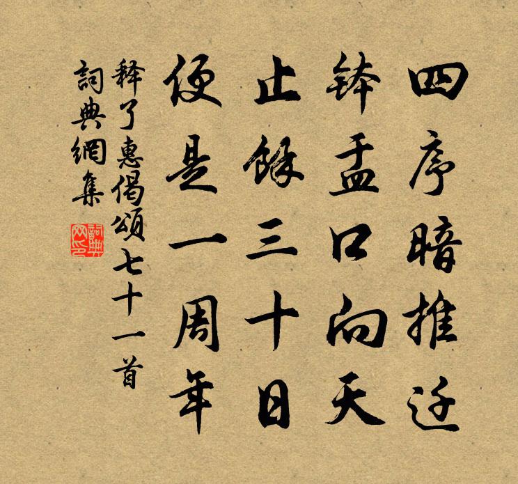 詩詞名句歷史字典書法欣賞書法字典國語詞典說文解字康熙字典古漢語字典標 題 作 者 詩 句 偈頌七十一首作者:釋了惠 朝代:宋代偈頌七十一首原文四序暗推遷,缽盂口向天。止餘三十日,便是一周年。詩詞問答問:偈頌七十一首的作者是誰?答:釋了惠問:偈頌七十一首寫於哪個朝代?答:宋代釋了惠偈頌七十一首書法欣賞偈頌七十一首書法作品詩詞推薦題木蘭廟杜牧〔唐代〕彎弓征戰作男兒,夢裡曾經與畫眉。幾度思歸還把酒,拂雲堆上祝明妃。雲津閣陳宓〔宋代〕山色月中猶見碧,溪流枕上更宜聲。身輕閣穩欣投宿,此是還家第一程。病馬五首呈鄭校書章三吳十五先輩曹唐〔唐代〕騄耳何年別渥窪,病來顏色半泥沙。四啼不鑿金砧裂,雙眼慵開玉箸斜。墮月兔毛乾觳觫,失雲龍骨瘦牙槎。平原林和叔山園九詠娛老姜特立〔宋代〕老來何事可娛嬉,堂枕崔嵬瞰綠漪。自有山光並水色,不須花貌與蛾眉。宮詞張公庠〔宋代〕黃羅雙幅裹降書,新拜昭容稱意無。真色不勞施粉黛,香閨虛掛十眉圖。夏日陸游〔宋代〕燕子生雛梅子黃,斷雲殘雨過林塘。孤舟正作笭箵夢,九陌難隨褦襶忙。團扇興來閒弄筆,寒泉漱罷獨焚香。太平論項賈似道〔宋代〕鱉小更短促, * 一片光。這般生像者,不養又何妨。答人見贈李復〔宋代〕形影何嘗問主賓,真風滿戶養頹齡。不從田父迷回駕,但有漁人笑獨醒。閒攝高雲遊沆瀣,靜收浮氣借光靈。出門皇太妃閣五首蘇軾〔宋代〕九門掛月未催班,清禁風和玉漏閒。崇慶早朝銀燭下,佩環聲在五雲間。還高冠潭口留別舍弟岑參〔唐代〕昨日山有信,只今耕種時。遙傳杜陵叟,怪我還山遲。獨向潭上酌,無人林下棋。東谿憶汝處,閒臥對鸕鶿。兩頭纖纖范成大〔宋代〕兩頭纖纖小秤衡,半白半黑月未明。腷腷膊膊扣戶聲,磊磊落落金盤冰。詠水上雙白鳥張嵲〔宋代〕夜雨山水清,朝暉淨崖壁。飛來雙白鳥,未省平生識。鴐鵝謝清姿,鷗鳥慚素質。低昂信波濤,顧盼矜羽翮。鮮明送茂侍者釋智愚〔宋代〕木葉辭柯霜氣清,虎頭戴角出禪扃。東西南北無人處,急急歸來話此情。湯丞相生日二十韻韓元吉〔宋代〕寶曆千齡會,神槎八月流。人知挺生傑,天欲中興周。文筆超三古,聲名溢九州。宏才自伊呂,餘事豈慶劉。繄昔江南雜詠陳維崧〔清代〕雞狗騷然,朝驚北陌暮南阡。印響西風猩作記,如鬼,老券排家驗鈐尾。殘句:吾聞調羹槿黃庭堅〔宋代〕吾聞調羹槿,異味及粉榆。暗香(壽停雲翁七十。其年,雲山風有亭火後重建)彭子翔〔宋代〕停雲望極。問秀溪何似,英溪風月。劫火灰飛,又見雕檐照寒碧。何事歸來歸去,似熙載、江南江北。還又向、殊少年游晏幾道〔宋代〕西樓別後,風高露冷,無奈月分明。飛鴻影里,搗衣砧外,總是玉關情。王孫此際,山重水遠,何處賦西征。金閨劉晁之家園六詠佇棹姜特立〔宋代〕青溪一曲似清湘,刳木臨流制小航。莫怪時時來佇棹,一生心事水雲鄉。句何英〔宋代〕羊腸有路地多險,馬脊無人天一隅。自從二水分新舊,南北煙波各自愁。名句推薦榮所眾羨,亦引眾怨。來俊臣《羅織經·固榮卷第六》 國家將興,必有禎祥;國家將亡,必有妖孽。子思《中庸·第二十四章》 少年不識愁滋味,愛上層樓。愛上層樓,為賦新詞強說愁。辛棄疾《醜奴兒·書博山道中壁》 可惜一溪風月,莫教踏碎瓊瑤。蘇軾《西江月·頃在黃州》 攜壺酌流霞,搴菊泛寒榮。李白《九日》 白水滿春塘,旅雁每迥翔。沈約《詠湖中雁》 勿言草卉賤,幸宅天池中沈約《詠新荷應詔》 寶奩明月不欺人,明日歸來君試看。嚴仁《玉樓春·春思》 出師一表通今古,夜半挑燈更細看。陸游《病起書懷》 福來有由,禍來有漸。陳壽《三國志·吳書·吳主五子傳》