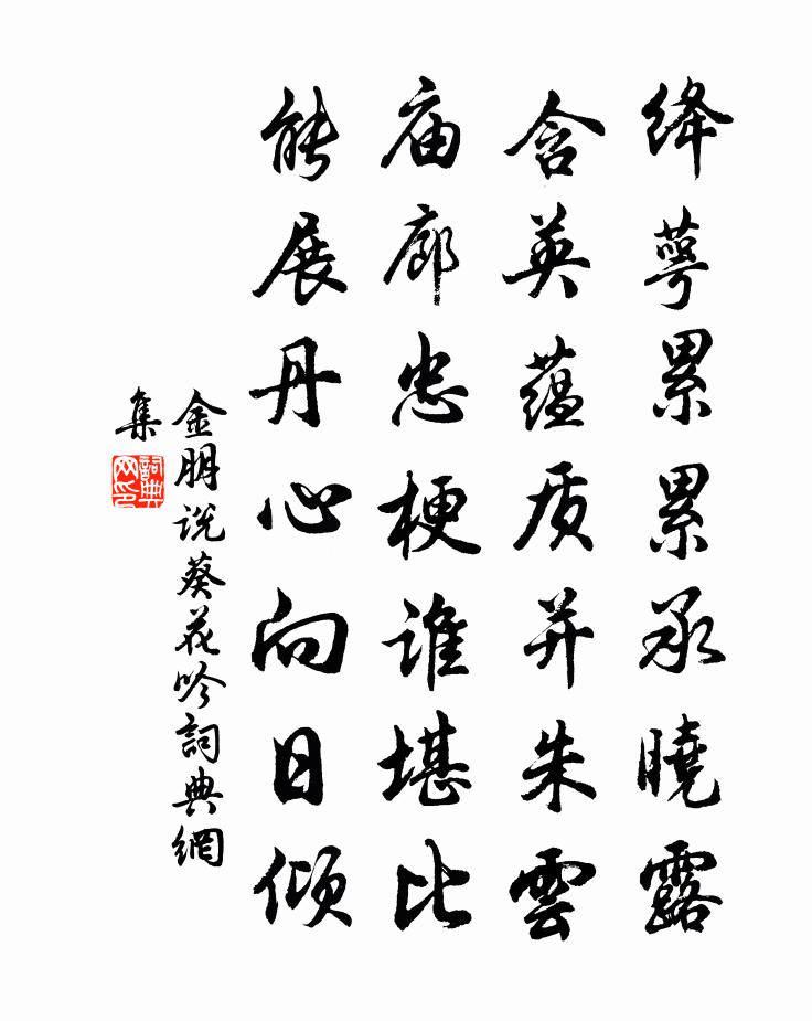 詩詞名句歷史字典書法欣賞書法字典國語詞典說文解字康熙字典古漢語字典標 題 作 者 詩 句 葵花吟作者:金朋說 朝代:宋代葵花吟原文絳萼累累承曉露,含英蘊質並朱雲。廟廊忠梗誰堪比,能展丹心向日傾。詩詞問答問:葵花吟的作者是誰?答:金朋說問:葵花吟寫於哪個朝代?答:宋代金朋說葵花吟書法欣賞葵花吟書法作品詩詞推薦圓靈水鏡佚名〔唐代〕浮光上東洛,揚彩滿圓靈。明滅淪江水,盈虛逐砌蓂。不分沙岸白,偏照海山清。練色臨窗牖,蟾光靄戶庭。成輪灑泉子潘閬〔宋代〕長憶孤山。山在湖心如黛簇。僧房四面向湖開。輕棹去還來。芰荷香噴連雲閣。閣上清聲檐上鐸。別來塵土污人衣題易道傳心圖王柏〔宋代〕圖書表里用功深,此道相傳直到今。書里有圖圖有句,圖中即是聖人心。泛舟潏水君俞用韓泛南溪韻作詩三首遂和李復〔宋代〕山虧一簣功,泉廢九仞跡。精神去不回,虛牝黃金擲。沂舟望南麓,近岸多巨石。溪流曲折多,波喧奔湍激。野竹偈五首釋善清〔宋代〕不出三門九十日,大都只要此心休。此心休了全無事,天下名山任意游。折桂令·擬張鳴善倪瓚〔元代〕草茫茫秦漢陵闕,世代興亡,卻便似月影圓缺。山人家堆案圖書,當窗松桂,滿地薇蕨。侯門深何須刺謁?白雲自八獄第一百二文天祥〔宋代〕勞生共乾坤,何時有終極。燈影照無睡,今夕復何夕。從軍詩五首·其一王粲〔兩漢〕從軍有苦樂,但問所從誰。所從神且武,焉得久勞師。相公征關右,赫怒震天威。一舉滅獯虜,再舉服羌夷。西收冬日孟郊〔唐代〕老人行人事,百一不及周。凍馬四蹄吃,陟卓難自收。短景仄飛過,午光不上頭。少壯日與輝,衰老日與愁。日愁本意和倪雲林原韻陳維崧〔清代〕風光三月連櫻筍,美人躊躇白日靜。小屏空翠颭東風,不見其餘見衫影。無端料峭春閨冷,忽憶青驄別鄉井。長將西江月(十之三)夏元鼎〔宋代〕太一畫前是道,全憑龍虎成丹。九還七返保長年。好個逍遙閒漢。日詣金門玉殿,青衣引贊無言。迴風混合萬神安女竹枝歌陳杰〔宋代〕南園一株雨前茶,阿婆手種黃玉芽。今年團欒且同摘,明年大姊阿誰家。和元規拜違張繼先〔宋代〕才到巍峨畔,還登翠碧重。調青賡白雪,琴靜撫黃鐘。履踐古人道,追遊仙者蹤。自來多福力,想念各疏慵。何處與蔣秘別二十六年田棐二十年羅拯十年始見之梅堯臣〔宋代〕我今五十二,常苦離別煎。屈指數離別,正去一半年。三君異出處,相見有後先。蔣最會遇早,羅倍晚於田。仕宦女冠子·元夕蔣捷〔宋代〕蕙花香也。雪晴池館如畫。春風飛到,寶釵樓上,一片笙簫,琉璃光射。而今燈漫掛。不是暗塵明月,那時元夜。深春許渾〔唐代〕故里千帆外,深春一雁飛。乾名頻慟哭,將老欲何歸。未谷拋還憶,交親晚更稀。空持望鄉淚,沾灑寄來衣。游淡山岩王資仁〔宋代〕淡山之景真尋幽,我來為款窮冥搜。嵌岩呀豁自呈露,天匠巧斲非人謀。撐空突兀幾仞,奇偉萬狀不可侔。群仙秘歇後宰相金朋說〔宋代〕歇後詩人何志誠,自量心跡甚詳明。世多覬竇穿窬者,對爾寧無愧赧情。先天易吟三十首方回〔宋代〕水平民不溺,谷播世無飢。氣數如寒暑,能無理轉移。西江月尹志平〔元代〕我愛秋陽天氣,一指雲路無迷。何勞身外覓曹溪。了見三身四智。莫問天機深遠,休尋大道無為。目前認得這些兒名句推薦日入室中暗,荊薪代明燭。陶淵明《歸園田居·其五》 志之難也,不在勝人,在自勝。韓非及後人《韓非子·喻老》 卻看妻子愁何在,漫捲詩書喜欲狂杜甫《聞官軍收河南河北》 羅幕輕寒,燕子雙飛去。晏殊《蝶戀花·檻菊愁煙蘭泣露》 芳洲拾翠暮忘歸,秀野踏青來不定。張先《木蘭花·乙卯吳興寒食》 欲訴奇愁無可訴,算興亡、已慣司空見。梁啓超《金縷曲·丁未五月歸國旋復東渡卻寄滬上諸君子》 送子軍中飲,家書醉里題。岑參《磧西頭送李判官入京》 殷勤昨夜三更雨,又得浮生一日涼。蘇軾《鷓鴣天·林斷山明竹隱牆》 清夜何湛湛,孤燭映蘭幕。江淹《銅爵妓》 雪霜凌厲而見殺,來歲不改其性也黃庭堅《書幽芳亭記》
