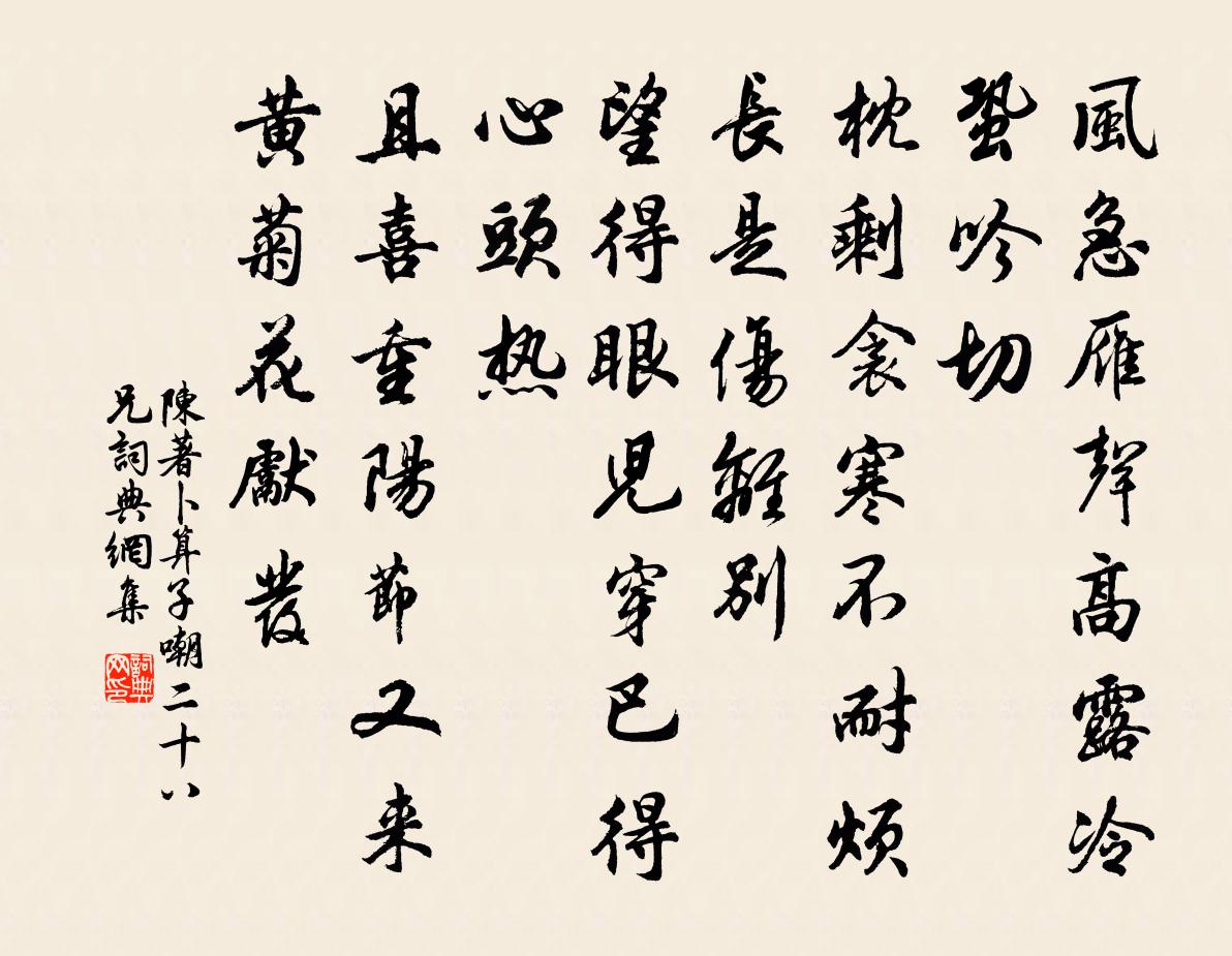 詩詞名句歷史字典書法欣賞書法字典國語詞典說文解字康熙字典古漢語字典標 題 作 者 詩 句 卜運算元(嘲二十八兄)作者:陳著 朝代:宋代卜運算元(嘲二十八兄)原文風急雁聲高,露冷蛩吟切。枕剩衾寒不耐煩,長是傷離別。望得眼兒穿,巴得心頭熱。且喜重陽節又來,黃1/1菊花先發。詩詞問答問:卜運算元(嘲二十八兄)的作者是誰?答:陳著問:卜運算元(嘲二十八兄)寫於哪個朝代?答:宋代問:卜運算元(嘲二十八兄)是什麼體裁?答:詞陳著卜運算元(嘲二十八兄)書法欣賞卜運算元(嘲二十八兄)書法作品詩詞推薦丙戌人日與內侄汪景淵同飲於宜晚二首陳著〔宋代〕憶昔兒嬉祖母旁,如今甲子一周強。盡窗三世親親話,分付兒孫此意長。書與士瞻上人十首仇遠〔宋代〕末俗由來不貴儒,愚夫愚婦恣揶揄。束書合向山林隱,絕跡莫登名利途。膝下有孫貧亦樂,門前無債醉如泥。鹹平春山艾性夫〔宋代〕春山不可畫,煙雨近江樓。藤老依松活,泉迂避石流。懶雲低渡竹,細草亂沿溝。欲打巴禽去,家居聽亦愁。山中吟釋文珦〔宋代〕受性不分拿,處身常落魄。難以事王侯,唯堪友猨鶴。遂爾辭國都,終然住林壑。渴則飲澗豀,飢則茹薇藿。煙霞李端叔命駕神仙二帖岳珂〔宋代〕姑溪之水清且漪,青山之源衍而汰。鍾此奇士,亦一雋快。風議磅礴,筆鋒嶮怪。蓋已具書體之五雲,不但得發遣次韻邑宰徐何慊出示所作五首陳著〔宋代〕誰其知我獨春秋,小試毫芒大用留。二 * 關社稷,八主地位傲公侯。儒家本色饒青眼,仕路焦心早白頭。笑殺京兆眉劉方平〔唐代〕新作蛾眉樣,誰將月里同。有來凡幾日,相效滿城中。絕句葛秋崖〔宋代〕二十四友金谷宴,千三百里錦帆游。人間無此春風樂,樂極人間無此愁。以堰事走永康宿金馬早行見雪山排霄極明麗因程公許〔宋代〕雨響清客夢,雨晴催客行。迥野曉寥落,界天玉崢嶸。銀海眩雙照,瓊鉤對孤明。英雲強吐吞,杲日還晶熒,邂逅讀前輩詩文有感陸游〔宋代〕我無前輩千鈞筆,造物爭功謝不能。已分文章歸委靡,可憐意氣尚憑陵。鸞旗廣殿晨排仗,鐵馬黃河夜踏冰。此事慶清朝史達祖〔宋代〕墜絮孳萍,狂鞭孕竹,偷移紅紫池亭。餘花未落,似供殘蝶經營。賦得送春詩了,夏帷攛斷綠陰成。桑麻外,乳鳩重陽前二日喜雨答泗州郭從事宋祁〔宋代〕晚秋嘉樹潤焦原,楚老相歡萬井喧。須信甘膏皆帝力,使君虛憑黑熊軒。送僧歸護國寺張士遜〔宋代〕一言已了忘筌誼,諸祖休傳壞色衣。只履遠過蔥嶺去,片雲高傍石橋歸。海宮有請杯慵度,塵劫無涯錫倦飛。元帥醉落魄/一斛珠李呂〔宋代〕休休莫莫。當年不負西湖約。一技初見橫籬落。嚼蕊聞香,長是醉鄉落魄。而今對酒空斟酌。老來多病情非昨。誰息夫人廟羅隱〔唐代〕百雉摧殘連野青,廟門猶見昔朝廷。一生雖抱楚王恨,千載終為息地靈。蟲網翠環終縹緲,風吹寶瑟助微冥。玉顏次韻和復古春日五絕句司馬光〔宋代〕東城絲綱蹴紅毬,北里瓊樓唱石州。堪笑迂儒竹齋里,眼昏逼紙看蠅頭。雜曲歌辭長安少年行僧皎然〔唐代〕翠樓春酒蝦蟆陵,長安少年皆共矜。紛紛半醉綠槐道,蹀躞花驄驕不勝。生查子王千秋〔宋代〕睡起髻雲松,枕印香腮嫩。愁思到眉尖,齒軟嘗新杏。都無魚雁書,又過鶯花陣。寬盡縷金衣,說與伊爭信。和沈節推韻杜范〔宋代〕點檢春光向幾多,埋頭官事暗中過。蕭蕭鬢影霜先入,匝匝襟塵鏡未磨。盟會誰令寒晉楚,篇詞自幸識陰何。休文樹稼諺佚名〔唐代〕樹稼,達官怕。名句推薦浮雲不系名居易,造化無為字樂天李忱《吊白居易》 紫菊宜新壽,丹萸辟舊邪。趙彥昭《奉和九日幸臨渭亭登高應制》 一切法無我無人無眾生無壽者。鳩摩羅什譯《金剛經·究竟無我》 願為西南風,長逝入君懷。曹植《七哀詩》 少年俠氣,交結五都雄。賀鑄《六州歌頭·少年俠氣》 因人成事,其功不難。魏徵《隋書·列傳·卷七》 山下孤煙遠村,天邊獨樹高原。王維《田園樂七首·其五》 匹馬南來渡浙河,汴城宮闕遠嵯峨。于謙《岳忠武王祠》 萬里無人收白骨,家家城下招魂葬。張籍《征婦怨》 為報今年春色好。花光月影宜相照。李清照《蝶戀花·上巳召親族》