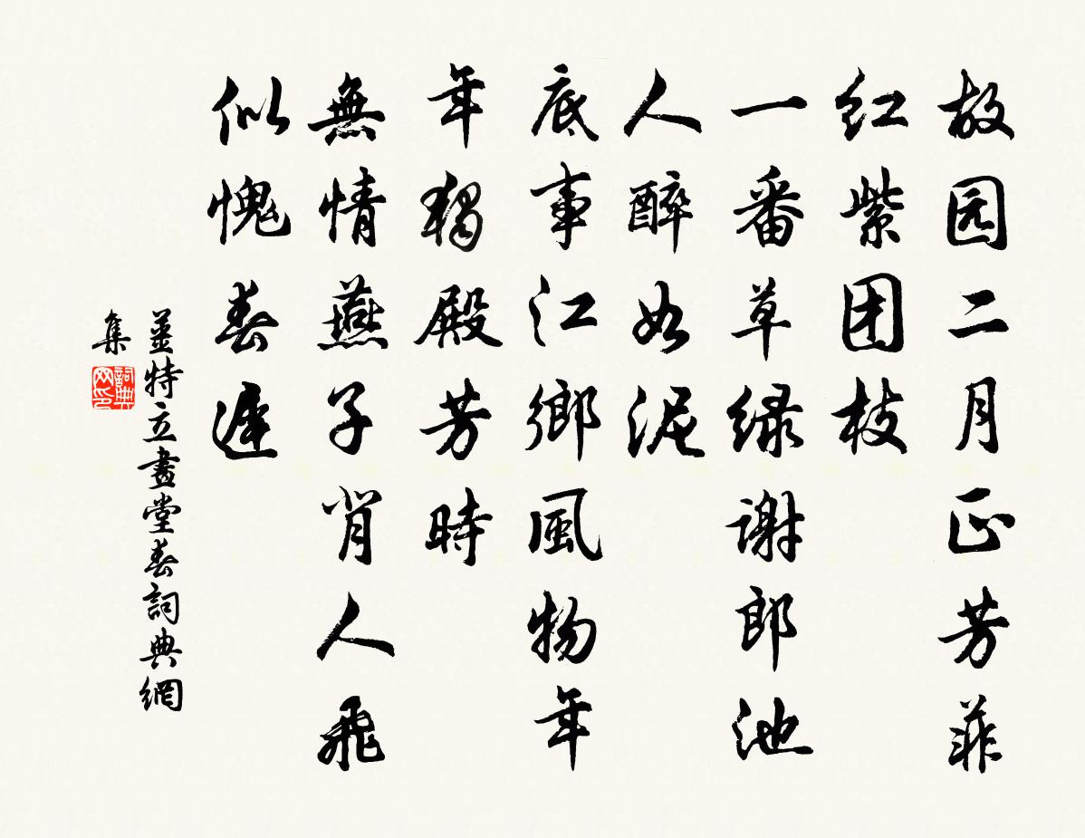 詩詞名句歷史字典書法欣賞書法字典國語詞典說文解字康熙字典古漢語字典標 題 作 者 詩 句 畫堂春作者:姜特立 朝代:宋代畫堂春原文故園二月正芳菲。紅紫團枝。一番草綠謝郎池。人醉如泥。底事江鄉風物,年年獨殿芳時。無情燕子背人飛。似愧春遲。詩詞問答問:畫堂春的作者是誰?答:姜特立問:畫堂春寫於哪個朝代?答:宋代問:畫堂春是什麼體裁?答:詞姜特立畫堂春書法欣賞畫堂春書法作品詩詞推薦訪陳復齋寺丞於私第戴復古〔宋代〕以時為出處,真有古人風。奉母易為孝,事君難盡忠。閒居非傲世,直氣尚摩空。語及朝廷事,乾坤萬感中。玉樓春 壽何平章劉敏中〔元代〕泰山高壓群山小。齊魯百城青未了。豈知山更有聰山,暫出雨雲周八表。說山才說聰山好。便覺泰山功烈少。聰山靈芝寺避暑因攜茶具汎湖共成十絕張鎡〔宋代〕一色琉璃碧簟橫,更無觴豆引飛蠅。從渠日氣如湯烈,不礙盆中數尺冰。孤雁許渾〔唐代〕昔年雙頡頏,池上靄春暉。霄漢力猶怯,稻粱心已違。蘆洲寒獨宿,榆塞夜孤飛。不及營巢燕,西風相伴歸。贈慈上人趙汝鐩〔宋代〕踏遍叢林後,歸來隱石崖。任梅斜到牖,聽竹長侵街。掛壁塵堆笠,穿山雲惹鞋。真機須要悟,餘事是持齋。華陽作貽祖三詠儲光羲〔唐代〕朝行敷水上,暮出華山東。高館宿初靜,長亭秋轉空。日余久淪汩,重此聞霜風。淅瀝入溪樹,颼飀驚夕鴻。悽然偶題曹鄴〔唐代〕白玉先生多在市,青牛道士不居山。但能共得丹田語,正是忙時身亦閒。送劉子和教授赴贛州兼簡府主洪景廬二首周必大〔宋代〕伊昔青衿地,於今絳帳師。家聲傳叔贛,宦學類先之。久已鴞音革,居然鱣服宜。誰開丞相閣,此士獨非奇。謁金門(為尤郎中延之壽)丘崈〔宋代〕花雨潤。煙鎖玉爐香韻。笑度華年春不盡。壽觴寒食近。甲子才周一瞬。爭羨珠顏青鬢。咫尺朝元仙路穩。碧雲新頌古一百二十一首釋宗杲〔宋代〕入門便喝,全無巴鼻。引得兒孫,弄粥飯氣。熙寧元年八月十九日過湖州東林沈山用石榴…自號回山人呂岩〔唐代〕西鄰已富憂不足,東老雖貧樂有餘。白酒釀來緣好客,黃金散盡為收書。燈市感舊林景熙〔宋代〕舊夢仙山駕海鰲,飛梅如剪柳如繅。千門疑是繁星落,九陌不知明月高。零亂遺鈿空宿草,昇平疊鼓散春濤。寒燈高祖試劍石李新〔宋代〕拔山蓋世何為者,三尺青龍不切泥。且向斷崖聊一試,如聞鬼母夜悲啼。曲江解舟釋紹嵩〔宋代〕動靜非常態,此行風正秋。巉巉孤棹起,渺渺大江流。蟬噪日將落,煙生山欲浮。無心與時競,吟憑釣魚舟。重山論易贈吳叔達陳藻〔宋代〕似汝論三易,何人閱五車。白頭長作侶,黃石即為家。頌證道歌證道歌釋印肅〔宋代〕假饒毒藥也閒閒,一吸西江尚不難。達磨曾經無損缺,後遺只履葬熊山。水龍吟(寄興)張榘〔宋代〕暮天絲雨輕寒,二分春色看看過。梅花謝了,蒼苔萬點,香殘粉污。猶喜牆頭,一枝嬌裊,杏腮微露。算幾回逗曉昨訪箳篂聞有繡帨之宴回車戲呈季茂岳珂〔宋代〕昨朝華宴想清歡,今日床頭未整冠。已奶酒腸孤夜醉,更驚病骨 * 。多情條脫參差是,一抹琵琶錯雜彈。老眼題李粹伯晦庵曾協〔宋代〕天道有訊息,物理兼屈伸。鳥匿定將擊,龍蟄以存身。卷舒雖不同,為用常相因。老聃晞髮時,恝然似非人。岐體僧舍小泊葉茵〔宋代〕屏息小胡床,心魔已受降。香留煙出戶,雲過雨來窗。自許參禪觀,誰能折慢幢。山童求說偈,竹景落寒江。名句推薦一上一上又一上,一上直到高山上。唐寅《登山詩》 念往昔,繁華競逐,嘆門外樓頭,悲恨相續。王安石《桂枝香·登臨送目》 師之所處,荊棘生焉。大軍之後,必有凶年。老子《老子·道經·第三十章》 福滿須防有禍,凶多料必無爭。佚名《增廣賢文·下集》 不知細葉誰裁出,二月春風似剪刀。賀知章《詠柳 / 柳枝詞》 橫槊題詩,登樓作賦,萬事空中雪文天祥《酹江月·和友驛中言別》 春陰垂野草青青,時有幽花一樹明。蘇舜欽《淮中晚泊犢頭》 相思黃葉落,白露濕青苔。李白《長相思三首》 爭渡,爭渡,驚起一灘鷗鷺。李清照《如夢令·常記溪亭日暮》 善刪者字去而意留,善敷者辭殊而義顯。劉勰《文心雕龍·熔裁》