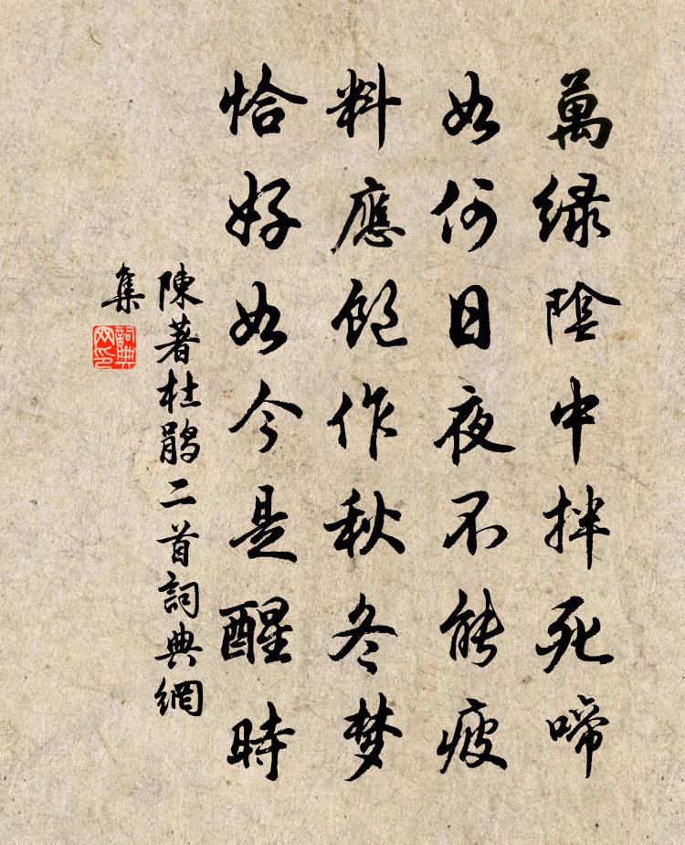 詩詞名句歷史字典書法欣賞書法字典國語詞典說文解字康熙字典古漢語字典標 題 作 者 詩 句 杜鵑二首作者:陳著 朝代:宋代杜鵑二首原文萬綠陰中拌死啼,如何日夜不能疲。料應飽作秋冬夢,恰好如今是醒時。詩詞問答問:杜鵑二首的作者是誰?答:陳著問:杜鵑二首寫於哪個朝代?答:宋代陳著杜鵑二首書法欣賞杜鵑二首書法作品詩詞推薦堂後梅王遂〔宋代〕阿母親栽白玉堂,分明雪色變青黃。不須徙倚橫枝看,留作江南第一香。蘇州有感宋伯仁〔宋代〕秋意滿姑蘇,扁舟憶五湖。鈴聲邊報急,帆影客心孤。野港青如染,遙山澹欲無。英雄應念我,時事滿銀須。燕歸梁(高平調)張先〔宋代〕夜月啼烏促亂弦。江樹遠無煙。缺多圓少奈何天。愁只恐、下關山。粉香生潤,衣珠弄彩,人月兩蟬娟。留連殘夜村居高鼎〔清代〕草長鶯飛二月天,拂堤楊柳醉春煙。兒童散學歸來早,忙趁東風放紙鳶。倚天閣袁燮〔宋代〕西川劍閣偉岡巒,雖得崢嶸苦未寬。豈意危欄臨楚望,獲瞻喬嶽峙江乾。雌雄並立排鋒刃,紫翠相縈繡帨鞶。珍重白雲向空盡(一作周成詩)焦郁〔唐代〕白雲升遠岫,搖曳入晴空。乘化隨舒捲,無心任始終。欲銷仍帶日,將斷更因風。勢薄飛難定,天高色易窮。影收窗前種小梅樹今年未著花但春來綠陰亂眼每過鄭剛中〔宋代〕水邊移得竹邊栽,樹小條新花未開。綠葉參差須細看,尚疑低處有青梅。別子靜卻送之霅謝翱〔宋代〕獨往知吾事,語離何所求。故家無別業,殘夢下扁舟。積葉吳宮冷,吟猿顧渚秋。那能不相待,羈旅負清游。旅寓安南杜審言〔唐代〕交趾殊風候,寒遲暖復催。仲冬山果熟,正月野花開。積雨生昏霧,輕霜下震雷。故鄉逾萬里,客思倍從來。呈宜之兄八首趙蕃〔宋代〕雪抵東野縣,晴值安豐車。坐定取談兄,示以咫尺書。贈野老陳陶〔唐代〕何年種芝白雲里,人傳先生老萊子。消磨世上名利心,澹若岩間一流水。浣溪沙呂勝己〔宋代〕直系腰圍鶴間霞。雙垂項帕鳳穿花。新妝全學內人家。惠性芳心誰得似,饒嗔□惡也還他。只消凡事與饒些。七夕池上泛舟四首張鎡〔宋代〕柳系荃橈句未成,撥船微動碧香迎。琉璃處鬃無瑕翳,不放池西一葉生。示諸孫蘇轍〔宋代〕少年真力學,玄月閉書帷。老去渾無賴,心空自不知。交遊誰識面,文字略存詩。笑向諸孫說,疏慵非汝師。用胡衛道贈姚居士韻洪咨夔〔宋代〕牢落淮南賦小山,霜風容易老人顏。揚瀾左蠡天垂碧,夢與盟鷗共往還。紫薇陸游〔宋代〕鐘鼓樓前官樣花,誰令流落到天涯?少年妄想今除盡,但愛清樽浸晚霞。經王先生故居趙嘏〔唐代〕晚波東去海茫茫,誰識蓬山不死鄉。弄玉已歸蕭史去,碧樓紅樹倚斜陽。蝶戀花彭元遜〔宋代〕微雨燒香餘潤氣,新綠愔愔,乳燕相依睡。無復捲簾知客意,楊柳更欲因風起。舊夢蒼茫雲海際。強作歡娛,不覺和此陽先生感興詩二十首劉黻〔宋代〕智巧役一世,往往悲古愚。觸蠻榮利場,白日事浮虛。情流失固有,意騖希本無。相與龍斷登,獨不捷徑趨。是非偈頌一百零二首釋紹曇〔宋代〕橫該豎抹,古路封苔。聖凡情盡,馬腹驢胎。不用閉門防俗客,愛閒能有幾人來。名句推薦催促年光,舊來流水知何處。廖世美《燭影搖紅·題安陸浮雲樓》 海棠未雨,梨花先雪,一半春休。王雱《眼兒媚·楊柳絲絲弄輕柔》 忙日苦多閒日少,新愁常續舊愁生。陸游《浣溪沙·和無咎韻》 綠杯紅袖趁重陽。人情似故鄉。晏幾道《阮郎歸·天邊金掌露成霜》 仍憐故鄉水,萬里送行舟。李白《渡荊門送別》 春江潮水連海平,海上明月共潮生。張若虛《春江花月夜》 乃知兵者是兇器,聖人不得已而用之。李白《戰城南》 日暮漢宮傳蠟燭,輕煙散入五侯家。韓翃《寒食》 高峰入雲,清流見底陶弘景《答謝中書書》 風塵荏苒音書絕,關塞蕭條行路難。杜甫《宿府》