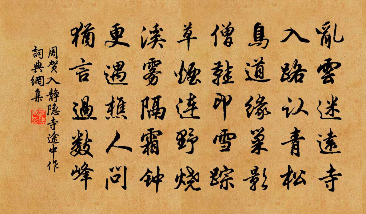 詩詞名句歷史字典書法欣賞書法字典國語詞典說文解字康熙字典古漢語字典標 題 作 者 詩 句 入靜隱寺途中作作者:周賀 朝代:唐代入靜隱寺途中作原文亂雲迷遠寺,入路認青松。鳥道緣巢影,僧鞋印雪蹤。草煙連野燒,溪霧隔霜鍾。更遇樵人問,猶言過數峰。詩詞問答問:入靜隱寺途中作的作者是誰?答:周賀問:入靜隱寺途中作寫於哪個朝代?答:唐代問:入靜隱寺途中作是什麼體裁?答:五律周賀入靜隱寺途中作書法欣賞入靜隱寺途中作書法作品注釋全唐詩:卷503-39詩詞推薦獻中書潘舍人李中〔唐代〕運葉半千數,天鍾許國臣。鵬霄開羽翼,鳳闕演絲綸。顧問當清夜,從容向紫宸。立言成雅誥,正意敘彝倫。樸素比同彥平謁希顏千里昆仲千里留醉短項翁彥平樂備〔宋代〕君不見便腹邊先生,齁齁晝眠貯五經。又不見長頭朵都尉,喋喋問字聒人耳。兩人挾策煩天機,俱忘其羊乃其理。虎北口王珪〔唐代〕來無方馬去無輪,天險分明限一津。願得玉龍橫十萬,榆關重識故封人。頌古四十五首釋慧遠〔宋代〕馬面驢腮無處雪,海竭山摧天地裂。老古錐,太孤絕。龜毛拂去眼中塵,兔角杖敲空裹月。奉和聖制送宇文融安輯戶口應制張說〔唐代〕至德臨天下,勞情遍九圍。念茲人去本,蓬轉將何依。外避征戍數,內傷親黨稀。嗟不逢明盛,胡能照隱微。柏台題蜀州修覺寺宋祁〔宋代〕蜀嶂紛重沓,祇園隱寂寥。花供法界雨,江助梵音朝。海水聞鐘下,天風引磬遙。少陵佳句後,物色付吾僚。滬帥曹太博生日四首魏了翁〔宋代〕犖犖聖門心事長,悠悠客路鬢毛蒼。東南人物寥寥甚,扶植斯文我所望。中閣禪院留元崇〔宋代〕初來羅浮山,萬變駭林壑。更作招提游,佳處在中閣。忽然天地間,一縱千里目。未論雲頂上,此景占仍獨。近聞晨起二首(後首一題作山齋秋晚)許渾〔唐代〕桂樹綠層層,風微煙露凝。檐楹銜落月,幃幌映殘燈。蘄簟曙香冷,越瓶秋水澄。心閒即無事,何異住山僧。殘月一春屢有陽明之約雨輒尼之將旋幕侍外舅來游施樞〔宋代〕裂石未嘗關,毋將俗眼觀。虛中元有受,造蘊亦何難。羽客能談道,雲房識候丹。只應仙有分,風響步虛壇。郊廟歌辭。享太廟樂章。肅和佚名〔唐代〕月禮已周,雲和將變。爰獻其醑,載遷其奠。明德逾隆,非馨是薦。澤沾動植,仁覃宇縣。曉入秘書省,過三橋楊萬里〔宋代〕船底吳儂尚宴眠,一船炊飯數船煙。行人各自東西岸,抵死回頭看兩邊。贈護國寺山上宏道者顧逢〔宋代〕三十年趺坐,何曾下此山。忘形超物外,無夢到人間。窗暗月來照,門開風自關。虎狼情亦狎,夜夜廟前還。登梅岡望金陵贈族侄高座寺僧中孚李白〔唐代〕鐘山抱金陵,霸氣昔騰發。天開帝王居,海色照宮闕。群峰如逐鹿,奔走相馳突。江水九道來,雲端遙明沒。時遷送趙撫乾趙班劉克莊〔宋代〕貴重元身外物輕,薦書慫恿入都城。金閨得路通初籍,玉座臨軒再唱名。岩邑古人難錦制,長官叔世少琴聲。今皇三姝媚·過都城舊居有感吳文英〔宋代〕湖山經醉慣。漬春衫、啼痕酒痕無限。又客長安,嘆斷襟零袂,涴塵誰浣。紫曲門荒,沿敗井、風搖青蔓。對語東白紵歌二首王建〔唐代〕天河漫漫北斗璨,宮中烏啼知夜半。新縫白紵舞衣成,來遲邀得吳王迎。低鬟轉面掩雙袖。玉釵浮動秋風生。酒多玉連環(憶李謫仙)馮偉壽〔宋代〕謫仙往矣,問當年、飲中儔侶,於今誰在。歡沈香醉夢,胡塵日月,流浪錦袍宮帶。高吟三峽動,舞劍九州隘。玉過張至秘校莊歐陽修〔宋代〕田家何所樂,籉笠日相親。桑條起蠶事,菖葉候耕辰。望歲占風色,寬徭知政仁。樵漁逐晚浦,雞犬隔前村。泉溜奉酬元相公上元徐凝〔唐代〕出擁樓船千萬人,入為台輔九霄身。如何更羨看燈夜,曾見宮花拂面春。名句推薦明朝游上苑,火速報春知。武則天《臘日宣詔幸上苑 / 催花詩》 男兒西北有神州,莫滴水西橋畔淚。劉克莊《玉樓春·戲林推》 嚴妝欲罷囀黃鸝,飛上萬年枝。和凝《喜遷鶯·曉月墜》 守身必謹嚴,凡足以戕吾身者宜戒之王永彬《圍爐夜話·第九八則》 桃花春水淥,水上鴛鴦浴。韋莊《菩薩蠻》 正江令恨別,庾信愁賦劉辰翁《蘭陵王·丙子送春》 天行健;君子以自強不息。佚名《易傳·象傳上·乾》 非其地而樹之,不生也。劉向《說苑·雜言》 夫嚴家無悍虜,而慈母有敗子。韓非及後人《韓非子·顯學》 塞上長城空自許,鏡中衰鬢已先斑。陸游《書憤五首·其一》