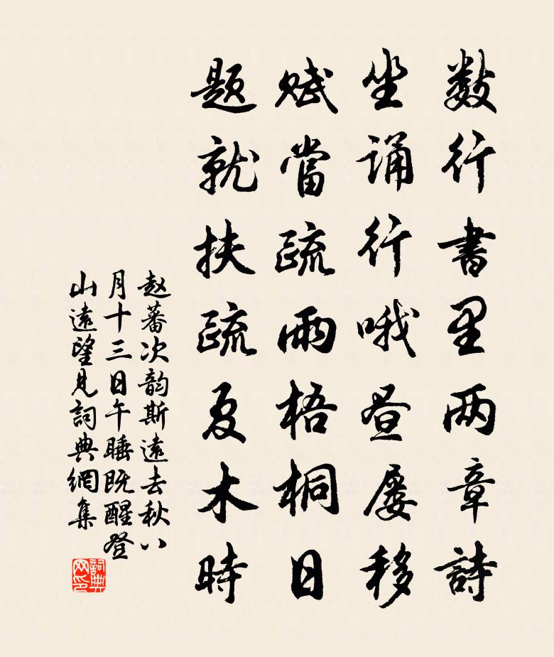 詩詞名句歷史字典書法欣賞書法字典國語詞典說文解字康熙字典古漢語字典標 題 作 者 詩 句 次韻斯遠去秋八月十三日午睡既醒登山遠望見作者:趙蕃 朝代:宋代原文數行書里兩章詩,坐誦行喔晝屢移。賦當疏雨梧桐日,題就扶疏夏木時。詩詞問答問:《次韻斯遠去秋八月十三日午睡既醒登山遠望見》的作者是誰?答:趙蕃問:該詩寫於哪個朝代?答:宋代書法欣賞次韻斯遠去秋八月十三日午睡既醒登山遠望見書法作品詩文賞析【原題】:次韻斯遠去秋八月十三日午睡既醒登山遠望見懷詩詞推薦題城南書院三十四詠張栻〔宋代〕今年少雨菊花遲,青蕊方開三兩枝。但是悠然真意在,青山何處不相宜。玉樓春(海棠題寅齋掛軸)高觀國〔宋代〕燕脂染出春風錦。生怕黃昏人有恨。雨難揩淚玉環嬌,煙不遮愁紅袖冷。醉魂吹斷香魂靜。拂拂翠眉羞帶粉。最憐送筍菰與方德潤大琮石史遙求霜毫王邁〔宋代〕玉版丰標清更臞,紫姑道味頗甘腴。遣渠問訊紫薇老,後省廚供有此無。詠史詩故宜城胡曾〔唐代〕武安南伐勒秦兵,疏鑿功將夏禹並。誰謂長渠千載後,水流猶入故宜城。南園題(一本少起四句,注云闕題)羅隱〔唐代〕搏擊路終迷,南園且灌畦。敢言逃俗態,自是樂幽棲。葉長春松闊,科圓早薤齊。雨沾虛檻冷,雪壓遠山低。竹好浣溪沙·小院閒窗春色深李清照〔宋代〕小院閒窗春色深。重簾未卷影沈沈。倚樓無語理瑤琴。遠岫出山催薄暮,細風吹雨弄輕陰。梨花欲謝恐難禁。蝶戀花(醉宿鄭氏閣)朱松〔宋代〕清曉方塘開一鏡。落絮飛花,肯向春風定。點破翠奩人未醒。餘寒猶倚芭蕉勁。擬托行雲醫酒病。簾卷閒愁,空占詆燕王令〔宋代〕金屋人嬌奈燕何,暮簾好卷放來過。今年已見燕無數,何況明年燕更多。清平樂晏幾道〔宋代〕笙歌宛轉。台上吳王宴。宮女如花倚春殿。舞綻縷金衣線。酒闌畫燭低迷。彩鴛驚起雙棲。月底三千繡戶,雲間十九日懷友趙希桐〔宋代〕江蟹初肥天欲霜,莫雲紅樹寫秋光。西風攜手登臨地,今日黃花兩處香。後寓嘆陸游〔宋代〕貂蟬未必出兜鍪,要是蒼鷹憶下韝。彭澤往歸端為酒,輕車已老豈須侯?千年精衛心平海,三日於菟氣食牛。會與再送蒙仲二首劉克莊〔宋代〕昔人曾嘆擇棲難,今子翱遊二相間。對弈未妨看露布,論詩未合上齋壇。沉來鐵鏁真兒戲,吟退氈裘卻凱還。班固如夢令(春思)方岳〔宋代〕知是誰家燕子。直恁惺松言語。深入繡簾來,無奈落花飛絮。春去。春去。且道乾卿何事。題安城趙寬之慈順堂楊萬里〔宋代〕天潢龍種與人殊,五鳳仍傳萬卷書。象服在堂萱草暖,彩衣上壽捸舉初。雪中密竹能抽筍,水底寒江更躍魚。趙氏潭州詩二首譚申〔宋代〕湘南湘北水悠悠,佳處中間冠十州。楚客離騷收不盡,唐人題跋尚分流。我來江上重尋日,景入詩中為點頭。有聞帳中香以為熬蠍者戲用前韻二首黃庭堅〔宋代〕我讀蔚宗香傳,文章不減二班。誤以甲為淺俗,卻知麝要防閒。和萬年成少府寓直錢起〔唐代〕赤縣新秋夜,文人藻思催。鐘聲自仙掖,月色近霜台。一葉兼螢度,孤雲帶雁來。明朝紫書下,應問長卿才。臨江仙(日暮舟中,月明,寒甚,憶暖春圍爐趙長卿)趙長卿〔宋代〕日欲低時江景好,暮山紫翠重重。釣筒收盡碧潭空。一船霜夜月,兩岸荻花風。遙憶暖春新向火,黃昏下了簾櫳。偈頌四十一首釋普寧〔宋代〕每年三月十八,憶著痛恨入骨。巨福山上望凌霄,萬重山海煙波闊。謾爇一炷兜羅木,唵,噴噴{左口右發}{左偈頌二十五釋智遇〔宋代〕迦葉當時性燥,下得一椎。莫道文殊三處度夏,直饒黃面老子別有神通,也須腦門著地。名句推薦息徒蘭圃,秣馬華山。嵇康《贈秀才入軍·其十四》 山明水淨夜來霜,數樹深紅出淺黃。劉禹錫《秋詞二首》 家貧出孝子,國亂顯忠臣!佚名《增廣賢文·下集》 想得玉人情,也合思量我。孫光憲《生查子·窗雨阻佳期》 蚤是傷春夢雨天,可堪芳草更芊芊。韋莊《長安清明》 社下燒錢鼓似雷,日斜扶得醉翁回。范成大《春日田園雜興》 相思了無益,悔當初相見。朱彝尊《憶少年·飛花時節》 西風來勸涼雲去,天東放開金鏡。史達祖《齊天樂·中秋宿真定驛》 遨歡任落風前帽,促飲爭吹酒上花。宋祁《九日置酒》 尋河愁地盡,過磧覺天低。岑參《磧西頭送李判官入京》