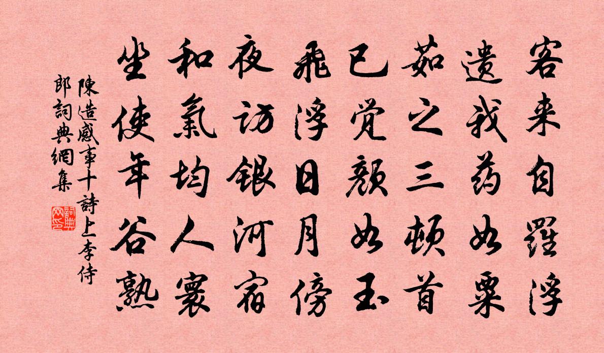 詩詞名句歷史字典書法欣賞書法字典國語詞典說文解字康熙字典古漢語字典標 題 作 者 詩 句 感事十詩上李侍郎作者:陳造 朝代:宋代感事十詩上李侍郎原文客來自羅浮,遺我藥如粟。茹之三頓首,已覺顏如玉。飛浮日月傍,夜訪銀河宿。和氣均人寰,坐使年穀熟。詩詞問答問:感事十詩上李侍郎的作者是誰?答:陳造問:感事十詩上李侍郎寫於哪個朝代?答:宋代陳造感事十詩上李侍郎書法欣賞感事十詩上李侍郎書法作品詩詞推薦次韻盧致遠祈雨喜應陳著〔宋代〕四郊多少出雲山,六月如何得雨慳。天意茫茫知不外,秋成岌岌有無閒。人非稼穡誰為命,職在蛟龍可聽閒。終藉送前鄠縣李少府雍陶〔唐代〕近出圭峰下,還期又不賒。身閒多宿寺,官滿未移家。罷釣臨秋水,開尊對月華。自當蓬閣選,豈得臥煙霞。游稽山王炎〔宋代〕失腳來苕霅,春風一棹還。尋幽探禹穴,問訊到稽山。意在煙霞外,身居井邑間。桃花應冷笑,頭白不能閒。大明鐃歌鼓吹曲十三篇楊維楨〔元代〕於王氣,塗之岡。五百祀,皇陵藏。火流烏,星流紅,駕生聖人應天祥。聖人生,六合一統天下昌。汝阿彌,言語送陸秀才歸覲省戎昱〔唐代〕武陵何處在,南指楚雲陰。花萼連枝近,桃源去路深。啼鶯徒寂寂,征馬已駸駸。堤上千年柳,條條掛我心。磨崖碑江瓊〔宋代〕元水部磨崖碑,為唐中興作也。唐事已矣,而碑崖□□獨存。本朝諸賢相與題詠,如張宛邱時有遊人打碑賣之句。又次大人韻李流謙〔宋代〕卜築城南幾歲華,滿川煙雨富桑麻。武陵未用逃秦俗,盤谷從來屬李家。橫拓小溪通畫楫,剩栽疎竹間梅花。更饒清思詩江淹〔南北朝〕白露滋金瑟。清風盪玉琴。空閨饒遠念。虛堂生夜陰。茲夕一何哀。明月沒西林。世人重時暮。道土情亦深。願乘和奇父叔夏雪五首胡寅〔宋代〕善游不必慕閻敖,避雨休尋夏後皋。共喜九天羲馭整,要登千仞祝融高。交情自分居龍尾,酒算何妨劇蝟毛。聞道聽王氏話歸州昭君廟李遠〔唐代〕獻之閒坐說歸州,曾到昭君廟裡游。自古行人多怨恨,至今鄉土盡風流。泉如珠淚侵階滴,花似紅妝滿岸愁。河畔柳枝詞汪莘〔宋代〕繰出菸絲輕裊裊,掃成雪帚重垂垂。風流舉世無過柳,總合殷勤把一枝。送師孫昧禪人釋法薰〔宋代〕十五為僧二十歸,途中莫比在家時。老僧留浙汝回蜀,三昧從來古不知。寄涇北都運待制施正臣宋祁〔宋代〕我作東南守,君為河朔行。旌旂向江步,笳鼓入邊聲。共結光華遇,難禁離索情。惟應指羊酪,未肯下蒪羹。鵲橋仙 強村叢書用善本書室藏鈔默庵文集本安熙〔元代〕徘徊尊俎。徜徉笑語。俯仰乾坤今古。世間豪傑數元龍,想未識、聖門風度。也非學圃。也非懷土。靜看落花風雨菩薩蠻 寄都下友人許有壬〔元代〕憑高日望金台路。黃沙盡處空煙樹。歲晚足蕭疏。雁聲無夜無。簿書臨俗態。人道儒酸在。何以慰相思。半年無好夜下征虜亭李白〔唐代〕船下廣陵去,月明徵虜亭。山花如繡頰,江火似流螢。柏東司空圖〔唐代〕冥得機心豈在僧,柏東閒步愛騰騰。免教世路人相忌,逢著村醪亦不憎。向年舟自三山上延平和人韻兩絕朱槔〔宋代〕春風一夢收桃李,雙燕不知愁絕時。臥向蓬窗飽聽雨,無人識此是新詩。立春日雪和趙端質韻王之道〔宋代〕春寒有信不逾期,肯為衰顏獨見欺。白雪已輸梅斗早,綠樽尤與火相宜。擷來野蔌和萱草,分得江魚貫柳枝。刺史次韻徐秀才十首陳造〔宋代〕毅毅掛榻翁,孺子來如家。長安聚蚊兒,車馬紛囂嘩。裔孫會兩窮,韶顏映蒼華。長嘯敘孔李,驚翻籬角鴉。名句推薦羅袂從風輕舉,愁殺採蓮女!毛文錫《應天長·平江波暖鴛鴦語》 蜀天常夜雨,江檻已朝晴。杜甫《水檻遣心二首》 不見穿針婦,空懷故國樓。孟浩然《他鄉七夕》 寒來暑往,秋收冬藏。周興嗣《千字文·全文》 回眸一笑百媚生,六宮粉黛無顏色。白居易《長恨歌》 江上雪,獨立釣漁翁。李綱《望江南·江上雪》 過春風十里,盡薺麥青青。姜夔《揚州慢·淮左名都》 君子博學而日參省乎己,則知明而行無過矣。荀子《荀子·勸學》 送客自傷身易老,不知何處待先生。劉滄《贈道者》 傍鄰聞者多嘆息,遠客思鄉皆淚垂。李頎《聽安萬善吹觱篥歌》