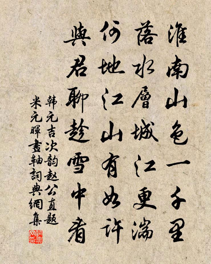 詩詞名句歷史字典書法欣賞書法字典國語詞典說文解字康熙字典古漢語字典標 題 作 者 詩 句 次韻趙公直題米元暉畫軸作者:韓元吉 朝代:宋代次韻趙公直題米元暉畫軸原文淮南山色一千里,落水層城江更湍。何地江山有如許,與君聊趁雪中看。詩詞問答問:次韻趙公直題米元暉畫軸的作者是誰?答:韓元吉問:次韻趙公直題米元暉畫軸寫於哪個朝代?答:宋代問:韓元吉的名句有哪些?答:韓元吉名句大全韓元吉次韻趙公直題米元暉畫軸書法欣賞次韻趙公直題米元暉畫軸書法作品詩詞推薦寄題華藏院清軒蔡襄〔宋代〕湖邊無地有塵埃,況復虛明向此開。山色每隨朝氣變,水光長共夕陽來。船行天上遊人散,樹沒雪中宿鳥回,一到乞荊浩畫大愚〔唐代〕六幅故牢健,知君恣筆蹤。不求千澗水,止要兩株松。樹下留盤石,天邊縱遠峰。近岩幽濕處,惟藉墨煙濃。雨花台盧壽老〔宋代〕輶車行曉快新游,更上雨花台上頭。看不厭人渾是景,清無極處奈何秋。地完龍虎堂堂立,江泊鯨鯢滾滾流。一帶承天院陳舜俞〔宋代〕建昌門外小禪居,竹檻松窗靜有餘。全近江湖添悵望,乍離城市易清虛。人思求友聽啼鳥,僧愛忘筌看得魚。不為對食戲作陸游〔宋代〕黃昏來扣野人扉,笑語欣欣意不遲。葑火正紅煨芋美,不妨秉炬雪中歸。象李嶠〔唐代〕鬱林開郡畢,維揚作貢初。萬推方演夢,惠子正焚書。執燧奔吳戰,量舟入魏墟。六牙行致遠,千葉奉高居。答李生曾國藩〔清代〕我年廿四登鄉貢,始與劉蓉相追陪。延津雙創忽會合,深夜掛壁鳴風雷。勛名自謂凌管樂,文采何曾怯鄒枚。豈知正月十五日與兄弟清坐燈下不飲取黃精荔子甘李彌遜〔宋代〕滿床緗帙照清燈,碧眼相看老弟兄。不見柳枝羅酒脯,旋燒榾柮煮黃精。米元章臨筆精日寒二帖贊岳珂〔宋代〕義獻之跡,臨者米也。遡觀欣書,乃二體也。隨珠卞璧,萃此紙也。以鑒得之,亦可紀也。春秋終講伏蒙知府諫議臨視學舍宴勞諸生謹成朱長文〔唐代〕泰山先生久冥寞,世把春秋束高閣。腐儒退隱三十年,獨玩遺經思筆削。濫居師席愧匪才,日演微言更歲籥。欲遵失調名左譽〔宋代〕帷雲剪水,滴粉搓酥。和襲美館娃宮懷古五絕陸龜蒙〔唐代〕三千雖衣水犀珠,半夜夫差國暗屠。猶有八人皆二八,獨教西子占亡吳。一宮花渚漾漣漪,俀墮鴉鬟出繭眉。可料失調名蘇軾〔宋代〕揭起裙兒,一陣油鹽醬醋香。題醴泉驛二首李曾伯〔宋代〕過錯役三才,憂端萬有斯。君恩知欲報,子難痛何追。我馬方瘏矣,秋陽更暴之。原言行役者,當暑戒驅馳。宿銅陵寺題壁張耒〔宋代〕僧房秋夜月明天,下馬擁裘人悄然。老僧何事亦晨起,清磬一聲驚客眠。夜雨陸游〔宋代〕寒雨連三夕,幽居只數椽。家貧輕過節,身老怯增年。日月悲歌里,關山淚眼邊。梅花自開落,嘆息為誰妍?送王誠之舍人使北方得揮字洪邁〔宋代〕歲晏滯急景,霜雪日霏霏。家居尚無奈,何況披征衣。舍人使持節,正爾辭帝畿。揚鞭出門去,言面無幾微。中朝省試日上崔侍郎四首劉得仁〔唐代〕衣上年年淚血痕,只將懷抱訴乾坤。如今主聖臣賢日,豈致人間一物冤。如病如痴二十秋,求名難得又難休。回看夏日五鼓起戲書陸游〔宋代〕老雞喔喔桑樹顛,明星磊磊茅屋邊。我興視夜不復眠,坐看朝暾浴虞淵。開窗清風來穆然,拂幾洗研整蠹編。火雲巫山一段雲 瀟湘夜雨李齊賢〔元代〕潮落蒹葭浦,煙沉橘柚洲。黃陵祠下雨聲秋。無限古今愁。漠漠迷漁火,蕭蕭滯客舟。箇中誰與共清幽。唯有一沙名句推薦林中有奇鳥,自言是鳳凰。阮籍《詠懷八十二首·其七十九》 紅樹青山日欲斜,長郊草色綠無涯。歐陽修《豐樂亭遊春·其三》 回首暮雲遠,飛絮攪青冥。蘇軾《水調歌頭·昵昵兒女語》 澄江平少岸,幽樹晚多花。杜甫《水檻遣心二首》 水滿池塘花滿枝。亂香深里語黃鸝。趙令疇《浣溪沙·水滿池塘花滿枝》 將失權,不操其勢,亦如魚龍脫於江湖,欲求游洋之勢,奔濤戲浪,何可得也。諸葛亮《將苑·卷一·兵權》 重重蕊葉相憐,似青帔艷妝神仙侶。曹勛《夾竹桃花·詠題》 大丈夫處世,當努力建功立業,著鞭在先。今若不取,為他人所取,悔之晚矣。羅貫中《三國演義·第六十回》 秋送新鴻哀破國,晝行飢虎齧空林。鄭思肖《二礪》 困花壓蕊絲絲雨,不堪只共愁人語。徐燦《菩薩蠻·春閨》