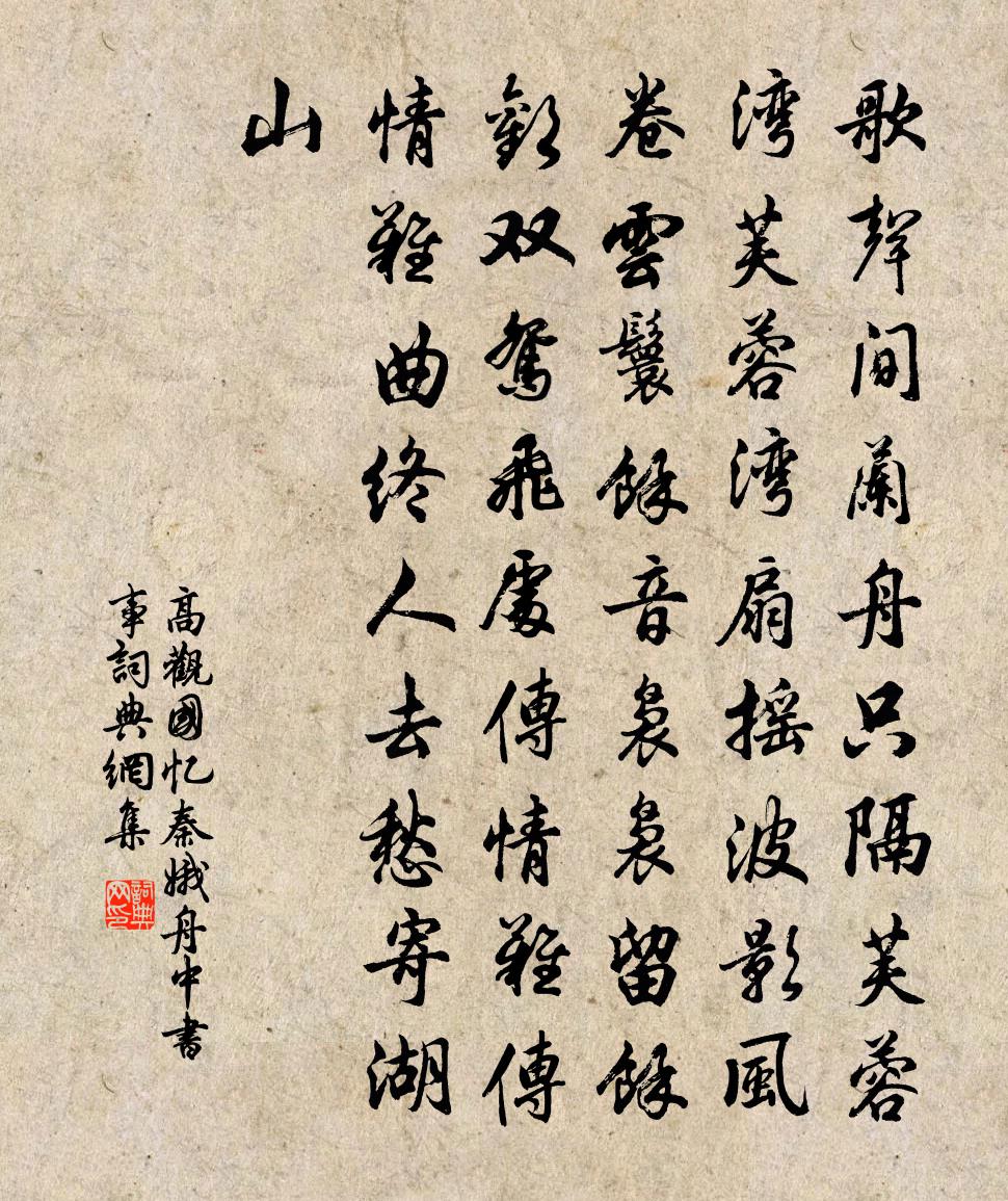 歌聲間。蘭舟只隔芙蓉灣。芙蓉灣。扇搖波影,風捲雲鬟。