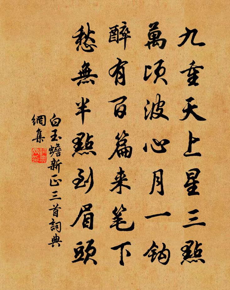 詩詞名句歷史字典書法欣賞書法字典國語詞典說文解字康熙字典古漢語字典標 題 作 者 詩 句 新正三首作者:白玉蟾 朝代:宋代新正三首原文九重天上星三點,萬頃波心月一鉤。醉有百篇來筆下,愁無半點到眉頭。詩詞問答問:新正三首的作者是誰?答:白玉蟾問:新正三首寫於哪個朝代?答:宋代問:新正三首是什麼體裁?答:七絕白玉蟾新正三首書法欣賞新正三首書法作品詩詞推薦九月十六日夜夢駐軍河外遣使招降諸城覺而有陸游〔宋代〕殺氣昏昏橫塞上,東並黃河開玉帳。晝飛羽檄下列城,夜脫貂裘撫降將。將軍櫪上汗血馬,猛士腰間虎文韔。階前平山堂趙善括〔宋代〕平山堂對妙高峰,極目郊原萬里同。杳靄四垂天不盡,縈紆一帶水無窮。城闉遙隔芙蓉浦,欄檻幾經楊柳風。想見水龍吟劉志淵〔元代〕閒人閒樂琴書味。行胡朗反貨藥囊符水。頓然識破,沾名作解,蹉跎真計。枯木岩前累。要撅劣、諸緣總棄。剔開初晴對月張耒〔宋代〕平生愛明月,豈以解煩燠。及茲霜夜對,任使體生粟。冰天凝紺冷,氛祲避不觸。煌煌七金徽,但掛寒斗曲。蕭蕭和趙晦之司戶三首鄭剛中〔宋代〕文士務悅目,常患器局卑。余雖嗜古勁,而乏撫媚姿。袖繹起深愧。漸摩賴良規。溫言謾相訹,何以慰所思。絕句二首陳師道〔宋代〕里中饋杏得嘗新,馬上逢花始見春。勤苦著書如作吏,世間枉是最閒人。定西番韋莊〔唐代〕挑盡金燈紅燼,人灼灼,漏遲遲,未眠時。斜倚銀屏無語,閒愁上翠眉。悶殺梧桐殘雨,滴相思。劉文蔚久苦目眚昨日乘涼來過共談先天圖義一家鉉翁〔宋代〕心以靜而虛,眼以動而應。心如明月懸太空,眼如當戶掛清鏡。月光不受微雲乾,鏡光或為塵土暝。學問之道貴澄挽葛夫人二首劉克莊〔宋代〕銀台曾奮塗歸筆,我亦留花批逆鱗。早共裂麻沮裴相,晚某負耒作滕民。兒斑衣從雙旌貴,母繡簾迎萬戶春。方擁夫遠征吳泳〔宋代〕采蘩蠶浴春蠶,夫蠶婿今遠離蠶。貧無金釵別,愁有玉箸垂。朝同火伴去,莫獨衾裯隨。百夫十夫長,千里萬里期秋醉歌張為〔唐代〕金風颯已起,還是招漁翁。攜酒天姥岑,自彈嶧陽桐。脫卻登山履,赤腳翹青筇。泉聲掃殘暑,猿臂攀長松。翠微金陵晚眺傅若金〔元代〕金陵古形勝,晚望思迢遙。白日余孤塔,青山見六朝。燕迷花底巷,鴉散柳陰橋。城下秦淮水,年年自落潮。句胡綰〔宋代〕楚王台榭荊榛里,屈指江山俎豆中。六友詩寄林景雲留壽國林道初俞季淵節友劉黻〔宋代〕節友獨愛秋,相得匪遲暮。受氣惟至正,睟見黃與素。飽諳風露味,甘守煙霞痼。如何千載人,僅一淵明遇。秋旦陸游〔宋代〕將旦溪風急,新秋天宇寬。涼生豎裁褐,爽入縮縫冠。拊翼雞頻唱,爭枝雀正讙。一簞吾已足,芋豆亦加餐。送王侍御往東川,放生池祖席杜甫〔唐代〕東川詩友合,此贈怯輕為。況復傳宗近,空然惜別離。梅花交近野,草色向平池。倘憶江邊臥,歸期願早知。挽趙東岩簡叔彥侯四首王邁〔宋代〕建炎戎馬滿神京,殿撰橫身活一城。時宰忌功無表勸,老天福善自分明。人稱簪紱一門盛,公是瑛瑤間世生。珍重京城王安石〔宋代〕三年衣上禁城塵,撫事怊然愧古人。明月滄波秋萬頃,扁舟長寄夢中身。人靈吟邵雍〔宋代〕天地生萬物,其間人最靈。既為人之靈,須有人之情。若無人之情,徒有人之形。送邢桂州王維〔唐代〕鐃吹喧京口,風波下洞庭。赭圻將赤岸,擊汰復揚舲。日落江湖白,潮來天地青。明珠歸合浦,應逐使臣星。名句推薦湖光秋月兩相和,潭面無風鏡未磨。劉禹錫《望洞庭》 在天成象,在地成形。脫脫《宋史·志·卷五十二》 目送征鴻飛杳杳,思隨流水去茫茫。孫光憲《浣溪沙·蓼岸風多橘柚香》 高築牆,廣積糧張廷玉《明史·列傳·卷二十四》 甚時躍馬歸來,認得迎門輕笑。時彥《青門飲·寄寵人》 長夏村墟風日清,檐牙燕雀已生成。張耒《夏日三首·其一》 酒闌歌罷玉尊空,青缸暗明滅。李清照《好事近·風定落花深》 為惡而畏人知,惡中猶有善路;為善而急人知,善處即是惡根。洪應明《菜根譚·概論》 天地生君子,君子理天地。荀子《荀子·王制》 勸君莫打枝頭鳥,子在巢中望母歸。白居易《鳥》