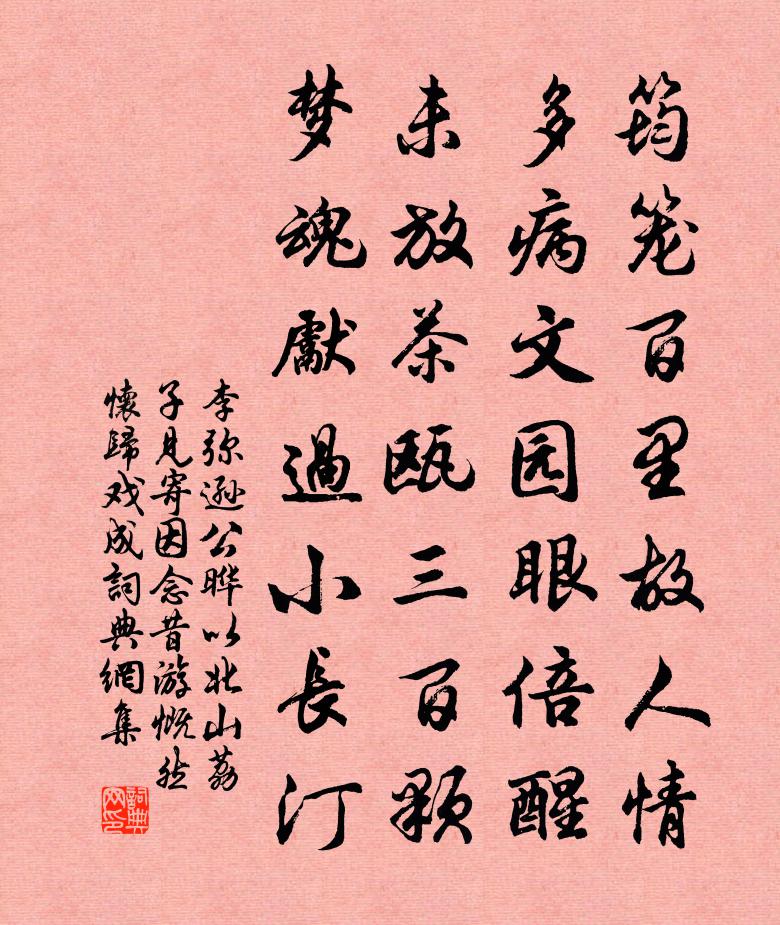 詩詞名句歷史字典書法欣賞書法字典國語詞典說文解字康熙字典古漢語字典標 題 作 者 詩 句 公曄以北山荔子見寄因念昔游慨然懷歸戲成作者:李彌遜 朝代:宋代原文筠籠百里故人情,多病文園眼倍醒。未放茶甌三百顆,夢魂先過小長汀。詩詞問答問:《公曄以北山荔子見寄因念昔游慨然懷歸戲成》的作者是誰?答:李彌遜問:該詩寫於哪個朝代?答:宋代書法欣賞公曄以北山荔子見寄因念昔游慨然懷歸戲成書法作品詩詞推薦湖州戴表元〔宋代〕一飽懸天不待求,幾人乾白少年頭。君看滾滾東流水,到海成淵始懶流。尋天目徐君皎然〔唐代〕常見仙翁變姓名,豈知松子號初平。逢人不道往來處,賣藥還將雞犬行。獨鶴天邊俱得性,浮雲世上共無情。三花憶秦娥(為曹氏胭脂閣嘆)劉辰翁〔宋代〕春如昨。曉風吹透胭脂閣。胭脂閣。滿園茅草,冷煙城郭。青衫淚盡樓頭角。佳人夢斷花間約。花間約。黃昏細雨棫樸佚名〔先秦〕芃芃棫樸,薪之槱之。濟濟辟王,左右趣之。濟濟辟王,左右奉璋。奉璋峨峨,髦士攸宜。淠彼涇舟,烝徒楫之。仲春雜書二首趙蕃〔宋代〕二月倏已盡,一春余幾多。不知花過矣,誰問病如何。水調歌頭(壽丘漕·九月初三)李劉〔宋代〕端正九秋月,今夜始生明。揚輝毓秀,飄然海上跨長鯨。認得靈均初度,直用望舒為御,重耀紫樞庭。何事乘槎使望海潮折元禮〔金代〕地雄河嶽,疆分韓晉,潼關高壓秦頭。山倚斷霞,江吞絕壁,野煙縈帶滄州。虎旆擁貔貅。看陣雲截岸,霜氣橫秋秋晚日少陵原游山泉之什楊發〔唐代〕喧濁侵肌性未沈,每來雲外恣幽尋。塵衣更喜秋泉潔,倦跡方依竹洞深。暫過偶然應系分,有期終去但勞心。唯憐秋雨未已客懷不佳夜誦少陵遣興詩至生涯能幾章甫〔宋代〕憶買京口船,飄飄適荊楚。覽古吊興亡,亦有會心侶。歲月能幾何,已作幽明阻。筋骸幸無恙,未害且逆旅。觀崇德墨竹歌黃庭堅〔宋代〕夜來北風元自小,何事吹折青琅玕。數枝灑落高堂上,敗葉蕭蕭煙景寒。乃是神工妙手欲自試,襲取天巧不作難。小市陸游〔宋代〕小市狂歌醉墮冠,南山山色跨牛看。放翁胸次誰能測,萬里秋空未是寬。季父習靜哀詩四首劉克莊〔宋代〕關洛源流遠,乾淳輩行尊。一檠常對卷,貳簋亦開樽。縞素幾空巷,玄纁不及門。異時遺逸傳,誰定訪丘園。梅花喜神譜欲開八枝宋伯仁〔宋代〕燈火迫新涼,志士功名重。十年窗下愁,會見金蓮寵。隨隱為祝南山賦黃庚〔宋代〕蹤跡何拘似白雲,不專丘壑避紅塵。田堪耕稼即莘野,水可釣魚皆渭濱。無礙滯心寧擇地,有幽閒處便容身。一筇東冶亭馬之純〔宋代〕舊時只說東西冶,今日轉為長短亭。無奈梅花臨水白,可堪柳色向人青。十分瀲灩苦難把,三疊涼誰忍聽。不道離舟泛洞庭(一作過洞庭湖)杜甫〔唐代〕蛟室圍青草,龍堆擁白沙。護江盤古木,迎棹舞神鴉。破浪南風正,收帆畏日斜。雲山千萬疊,底處上仙槎。周宗廟歌 皇夏庾信〔南北朝〕雄圖屬天造。宏略遇羣飛。風雲猶聽命。龍躍遂乘機。百二當天險。三分拒樂推。函谷風塵散。河陽氛霧晞。濟弱首夏二首方回〔宋代〕曬繭未繰絲,晴天麥最宜。樹陰常獨立,禽語不吾疑。苦筍烹勝肉,新茶嗅醒脾。薰風吹此句,突過一春詩。聞歌二絕葛立方〔宋代〕初唱城堙雁影寒,玉喉窈窱嚲雲簪。小叢底處傳歌樣,供奉梨園人姓南。二使者游東山酒後寄詩走筆次韻張栻〔宋代〕壯歲幾成山水癖,年來袖手不能豪。忽傳燈底詩篇好,但想雲間屐齒高。名句推薦風水人間不可無,也須陰騭兩相扶。馮夢龍《醒世恆言·卷一》 巧笑倩兮,美目盼兮。佚名《碩人》 秋叢繞舍似陶家,遍繞籬邊日漸斜。元稹《菊花》 欲將心事付瑤琴。岳飛《小重山·昨夜寒蛩不住鳴》 卻嫌脂粉污顏色,淡掃蛾眉朝至尊。張祜《集靈台·其二》 知君用心如日月,事夫誓擬同生死。張籍《節婦吟·寄東平李司空師道》 帝王之道,以寬仁為大。令狐德棻《周書·本紀·卷四》 戚姬髡髮入舂市,萬古共悲辛。李白《中山孺子妾歌》 淮水東邊舊時月,夜深還過女牆來。劉禹錫《金陵五題·石頭城》 春山碧樹秋重綠,人在武陵溪。劉基《眼兒媚·秋思》