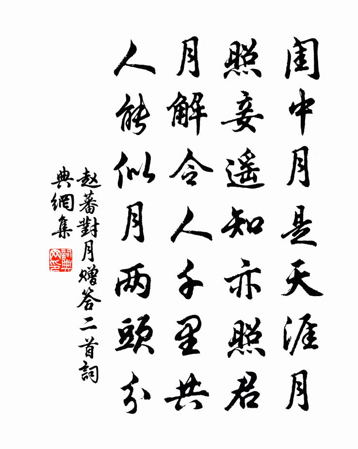 詩詞名句歷史字典書法欣賞書法字典國語詞典說文解字康熙字典古漢語字典標 題 作 者 詩 句 對月贈答二首作者:趙蕃 朝代:宋代對月贈答二首原文閨中月是天涯月,照妾遙知亦照君。月解令人千里共,人能似月兩頭分。詩詞問答問:對月贈答二首的作者是誰?答:趙蕃問:對月贈答二首寫於哪個朝代?答:宋代趙蕃對月贈答二首書法欣賞對月贈答二首書法作品詩詞推薦沁園春(題吳明仲竹坡)嚴參〔宋代〕竹焉美哉,愛竹者誰,曰君子歟。向佳山水處,築宮一畝,好風煙里,種玉千餘。朝引輕霏,夕延涼月,此外塵埃季夏郊墅即事程公許〔宋代〕力貧藏得五車書,趁就炎歊曬壁魚。安得身間饒目力,年年鉛槧課三餘。秋峽杜甫〔唐代〕江濤萬古峽,肺氣久衰翁。不寐防巴虎,全生狎楚童。衣裳垂素髮,門巷落丹楓。常怪商山老,兼存翊贊功。筠州曾使君寄貺中州新芽賦此以謝張栻〔宋代〕日長燕寢無公事,忽憶故人云水邊。包裹甘芳慰幽獨,使君風味故依然。次韻朱萬卿五首陳造〔宋代〕風義陶朱裔,斗南地此流。懸知禁廚臠,不賦畔牢愁。筆落無千載,談間散百憂。盡抄新樂府,惜欠雪兒謳。同楊仲禮和袁集賢上都詩柳貫〔元代〕出塞行瞻日,趨朝喜近天。離宮開苑囿,馳道絕風煙。瑤水巡非遠,峒山歷更綿。甘泉多法從,獻賦憶當年。和宋伯仁韻李景雷〔宋代〕自笑馮唐老示侯,短衣匹馬異鄉游。臥聞破屋蕭蕭雨,坐聽西風葉葉秋。鄴下已非公幹在,周南徒嘆子長留。丈夫句武三思〔唐代〕雲螭非易匹,月駟本難儔。(詠馬,見《海錄碎事》)寶香院王奕〔宋代〕山如螺髻塔如簪,三面江環一徑深。曉霧拂岩凝蜃氣,夜潮歸壑聽龍吟。戀涼人坐臨流石,帶暝禽投隔岸林。獨憾次韻九兄秋吟五首蘇泂〔宋代〕江平無意作波瀾,野曠山多入畫欄。一段秋吟到幽渺,回頭三伏也風寒。偶步劉子翬〔宋代〕偶步忘歸遠,心閒逸興增。山深知有寺,路盡不逢僧。山行見月作趙蕃〔宋代〕東坡老翁,有言莫酬。涼天佳月,即為中秋。鷓鴣天(別許侍郎奕即席賦)魏了翁〔宋代〕公在春官我已歸。公來東蜀我居西。及公自遂移潼日,正我由潼使遂時。如有礙,巧相違。人生禁得幾分飛。只祈詠塵駱賓王〔唐代〕凌波起羅襪,含風染素衣。別有知音調,聞歌應自飛。彩雲軒蔡元厲〔宋代〕洞府神仙此是家, * 曾駐五雲車。峰前三尺寒泉水,猶有白蓮開舊花。邯鄲南亭觀妓李白〔唐代〕歌鼓燕趙兒,魏姝弄鳴絲。粉色艷日彩,舞袖拂花枝。把酒顧美人,請歌邯鄲詞。清箏何繚繞,度曲綠雲垂。平原次知縣兄曹娥渡句蘇泂〔宋代〕自絕雙魚養,愁登老檜亭。斷雲知意緒,流水付年齡。撫穉頭空白,逢人眼未青。貪生不既晚,無地學威靈。送陳益之架閣陳傅良〔宋代〕論事不欲如戎兵,欲如衣冠佩玉嚴重而寬平。作文不欲如組繡,欲如疎林茂麓窈窕而敷榮。楨幹盍亦煩繩墨,滋味送曾仲錫通判如京師蘇軾〔宋代〕邊城歲暮多風雪,強壓春醪與君別。玉帳夜談霜月苦,鐵騎曉出冰河裂。斷蓬飛葉卷黃沙,只有千林{髟蒙}松花送劉知新往襄陽賈島〔唐代〕此別誠堪恨,荊襄是舊遊。眼光懸欲落,心緒亂難收。花木三層寺,煙波五相樓。因君兩地去,長使夢悠悠。名句推薦黃鸝驚夢破,青鳥喚春還。張弘范《臨江仙·憶舊》 東城漸覺風光好。宋祁《玉樓春·春景》 若要俏,添重孝。馮夢龍《警世通言·卷三十五》 令公桃李滿天下,何用堂前更種花。白居易《奉和令公綠野堂種花》 無作牛山悲,惻愴淚沾臆。李白《君子有所思行》 故不登高山,不知天之高也;不臨深溪,不知地之厚也;荀子《勸學》 臥看滿天雲不動,不知雲與我俱東。陳與義《襄邑道中》 腸斷月明紅豆蔻,月似當時,人似當時否?納蘭性德《鬢雲松令·枕函香》 專勝者未必克,挾疑者未必敗。范曄《後漢書·列傳·烏桓鮮卑列傳》 團扇不搖風自舉,盈盈翠竹,纖纖白薴,不受些兒暑。文徵明《青玉案·庭下石榴花亂吐》