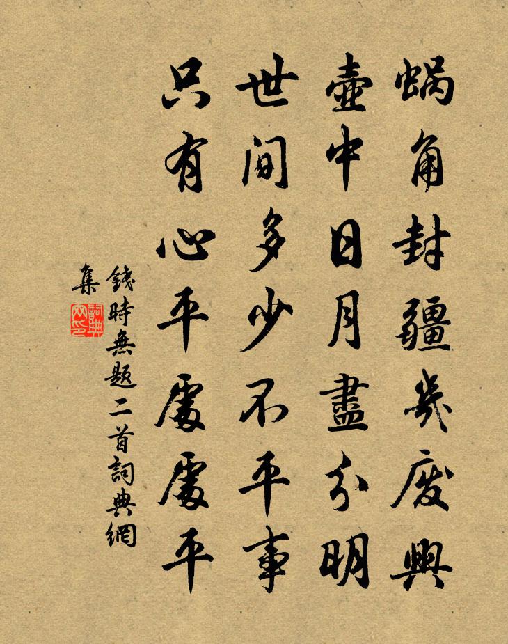 詩詞名句歷史字典書法欣賞書法字典國語詞典說文解字康熙字典古漢語字典標 題 作 者 詩 句 無題二首作者:錢時 朝代:宋代無題二首原文蝸角封疆幾廢興,壺中日月盡分明。世間多少不平事,只有心平處處平。詩詞問答問:無題二首的作者是誰?答:錢時問:無題二首寫於哪個朝代?答:宋代錢時無題二首書法欣賞無題二首書法作品詩詞推薦偶成楊公遠〔宋代〕抱膝長吟更短歌,百年身世易蹉跎。事逢如意從來少,詩不驚人空自多。暖日烘時花著子,東風吹後草成莎。看渠頌古四十四首釋師範〔宋代〕一擲神杯定吉凶,再占重卜轉靈通。分明見了今年事,卻說明年事不同。無量壽佛贊釋慧開〔宋代〕乾屎橛兮麻三斤,當陽拈出少知音。詩人不識自家佛,卻向丹青畫處尋。喜見單君范八句陳著〔宋代〕世衰交道薄,相好獨金蘭。見面驚雙瘦,知心話百難。老饕蔥本暖,清坐杏花寒。明日休輕別,流年水赴灘。廞庭自三山送荔枝分韻得緗字劉學箕〔宋代〕炎精孕秀儲氣詳,荔枝結實魁群芳。我有猶子客南服,千里眷念情不忘。星馳走寄一千顆,伏暑火熾勞取將。筠籃金菊對芙蓉(重陽)辛棄疾〔宋代〕遠水生光,遙山聳翠,霽煙深鎖梧桐。正零瀼玉露,淡盪金風。東籬菊有黃花吐,對映水、幾簇芙蓉。重陽佳致,岩桂范成大〔宋代〕風簾疏爽月徘徊,悵望家人把酒杯。病著幽窗知幾日,瓶花兩見木犀開。山中懷友薩都剌〔元代〕自是麒麟種,卑棲又幾年。胡廬南雪下,短褐北風前。歲莫山林瘦,天高雨露偏。惟應丈夫志,未受故人憐。先天易吟三十首方回〔宋代〕萬世復萬世,人心無改時。此理本非古,伏羲先得之。景靈宮恭謝駕回丞相以下皆簪花阮秀實〔宋代〕宮花密映帽檐新,誤蝶疑蜂逐去塵。自是近臣偏得賜,繡鞍扶上不勝春。送人游武陵湘中齊己〔唐代〕為子歌行樂,西南入武陵。風煙無戰士,賓榻有吟僧。山繞軍城疊,江臨寺閣層。遍尋幽勝了,湘水泛清澄。宿關西客舍寄東山嚴、許二山人時天寶初…見有高道舉征岑參〔唐代〕雲送關西雨,風傳渭北秋。孤燈然燃客夢,寒杵搗鄉愁。灘上思嚴子,山中憶許由。蒼生今有望,飛詔下林丘。秋懷寇準〔宋代〕落日留不住,默然空淚零。敗莎侵陋巷,疏葉滿閒庭。有趣窮風雅,無機敵杳冥。浮榮安足戀,歸去亂山青。謝徽上人見惠二龍障子,以短歌酬之齊己〔唐代〕我見蘇州崑山金城中,金城柱上有二龍。老僧相傳道是僧繇手,尋常入海共龍斗。又聞蜀國玉局觀有孫遇跡,盤屈潞守歐陽叔弼召登鼎軒暑飲李復〔宋代〕崇軒寫物體模分,爽拔風攜顥氣升。玉粲消憂思眺聽,本初持飲滌煩蒸。金烏不轉銅壺箭,碧碗時分玉井冰。每見金童捧露盤姬翼〔元代〕夢幻閻浮,舍故趨新,倏忽化機潛換。天地一丘墟,會心冥沖漠,野雲舒捲。寄跡虛舟,鑒形止水,風激遊絲斷。六月五日苦暑張耒〔宋代〕朱夏忽雲季,金流火方燃。遲遲朱輪出,濯濯高雲鮮。困翮守茂樾,游魚伏深泉。炎炎萬物息,聒耳唯鳴蟬。白羽浮槎山釋用孫〔宋代〕山為浮來海莫沈,蕭梁曾此布黃金。梵僧親指耆闍路,帝女歸傳達磨心。地控好峰排萬仞,澗餘流水落千尋。靈蹤和劉後村梅花百詠方蒙仲〔宋代〕簾圍玉館愁吟盡,錦藉瑤瓶怕摘殘。姑息梅花詎須爾,山家何處有朱欄。句元絳〔宋代〕過廬都失眼前人。名句推薦所向泥活活,思君令人瘦。杜甫《九日寄岑參》 萬物靜觀皆自得,四時佳興與人同。程顥《秋日》 春如舊。人空瘦。淚痕紅浥鮫綃透。陸游《釵頭鳳·紅酥手》 欲治身,先治心;欲責人,先責己。宋濂、王褘《元史·列傳·卷二》 東園載酒西園醉,摘盡枇杷一樹金。戴復古《初夏遊張園》 尋常一樣窗前月,才有梅花便不同。杜耒《寒夜》 凡與敵戰,三軍必要得其地利,則可以寡敵眾,以弱勝強。佚名《百戰奇略·第四卷·地戰》 笙歌散後酒初醒,深院月斜人靜。司馬光《西江月·寶髻松松挽就》 系我一生心,負你千行淚。柳永《憶帝京·薄衾小枕涼天氣》 相思無因見,悵望涼風前。李白《折荷有贈》