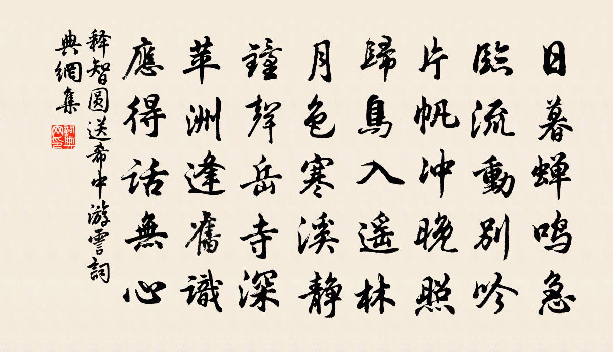 詩詞名句歷史字典書法欣賞書法字典國語詞典說文解字康熙字典古漢語字典標 題 作 者 詩 句 送希中游霅作者:釋智圓 朝代:宋代送希中游霅原文日暮蟬鳴急,臨流動別吟。片帆沖晚照,歸鳥入遙林。月色寒溪靜,鐘聲岳寺深。苹洲逢舊識,應得話無心。詩詞問答問:送希中游霅的作者是誰?答:釋智圓問:送希中游霅寫於哪個朝代?答:宋代釋智圓送希中游霅書法欣賞送希中游霅書法作品詩詞推薦送直閣杜君章守齊晁補之〔宋代〕杜公文史不讀律,平反世稱徐有功。官為列卿位亦顯,皋陶事與禮樂同。書生骫骳笑法令,弦歌不媿陵陂中。眾賢敬贊月林觀禪師陳貴謙〔宋代〕示現人間忍辱仙,單提獨弄祖師禪。生涯一缽無安處,惟有聲名萬古傳。送戴帥初信州教授方回〔宋代〕伏羲之後幾萬年,堯舜八聖孟一賢。誰學其學傳其傳,□明簡氣生戴先。上庠文聲撐青天,高揭蘭闈十名前。□□和任漕開宴值雨吳芾〔宋代〕正是千花萬卉開,一時景物亦佳哉。良辰已幸陪龍節,盛宴仍容飫豹胎。雖喜風光環幾席,其如煙雨暗池台。明朝出山相贊釋可湘〔宋代〕峭巍巍,孤迥迥。棄王宮,棲雪嶺。分明凍得眼生星,幡然踏破千峰頂。往復無間釋重顯〔宋代〕日出卯,萬國香花競頭走。邯鄲學步笑傍觀,豈知凶禍逐其後。春雨如膏喻鳧〔唐代〕冪冪斂輕塵,濛濛濕野春。細光添柳重,幽點濺花勻。慘澹遊絲景,陰沈落絮辰。回低飛蝶翅,寒滴語禽身。灑岳子直畫屏求題詩裴休乞食歌姬院葛立方〔宋代〕一從黃櫱逗真機,瞥地回光更不疑。著腳洞房猶乞食,那知羅剎是歌姬。答問詩十二篇寄呈滿子權其二耒答鎛三首王令〔宋代〕我用於主人,良田無虛種。主人不我以,我適為無用。不知主人飢,歲卒安自奉。由來我求人,孰與求我重。冬日山居好十首舒岳祥〔宋代〕冬日山居好,幽齋羃紙窗。溫存檐鵲並,暖熱竹鳩雙。鹿下霜封塹,樵歸雪印矼。從茲謝城府,吾志鹿門龐。勉諸子李呂〔宋代〕孔子昔當戹,良以桓{魑離換隹}故。韓信伏胯下,將壇起徒步。聖賢昔未遇,未免失常度。固知天地寬,出門多紹興以後時享二十五首真宗〔宋代〕至哉帝德,乃聖乃神。恭已南面,天下歸仁。歷年長久,垂裕後人。祀修舊典,實命維新。書懷李流謙〔宋代〕靜閱膠膠擾擾身,細從物理究虧成。一人譽復一人毀,五鼎食乃五鼎烹。怪木莫題居士字,修篁合著此君名。西風鵲橋仙朱敦儒〔宋代〕攜琴寄鶴,辭山別水,乘興隨雲做客。囊中欲試紫金丹,待點化、鸞紅鳳碧。誰知到此,玉梯無路,天上難通訊息張先生蘇軾〔宋代〕孰視空堂竟不言,故應知我未天全。肯來傅舍人皆說,能致先生子亦賢。脫屣不妨眠糞屋,流澌爭看浴冰川。士廉偈頌一百零一首釋慧性〔宋代〕春雨如膏,春雲如鶴。客從天外來,正是魔王腳。閫外威權,麒麟萬里何抅束。肥馬轆轆,瘦馬轆轆。日逐忙忙等鄭粹德興平江官滿有詩見寄次韻以敘老懷惜別仲並〔宋代〕不奈飛埃點素衣,驚霜須鬢落全稀。隔簾初聽黃鸝語,舉盞那催畫鷁歸。就使淵明頻日醉,能爭伯玉幾年非。持竿東城趙孟頫〔元代〕野店桃花紅粉姿,陌頭楊柳綠菸絲。不因送客東城去,過卻春光總不知。劉行簡見借詩稿以長句歸之沈與求〔宋代〕文章偏忌聲名早,富貴政須門第好。了知二物不相關,風月膏粱兼者少。劉郎天韻真不凡,飛騰宜在蓬萊島。年來呈摺子明丈十首趙蕃〔宋代〕朝廷經略在中原,西北人才要討論。節傳曾聞付吾屬,瀟湘可俾臥林園。名句推薦悅其名而喪其實。尹文《尹文子·大道上》 將入門,問孰存。將上堂,聲必揚。李毓秀《弟子規·謹》 記玉關踏雪事清游,寒氣脆貂裘。張炎《八聲甘州·記玉關踏雪事清游》 秦時明月漢時關,萬里長征人未還。王昌齡《出塞二首·其一》 想文君望久,倚竹愁生步羅襪。姜夔《八歸·湘中送胡德華》 新人雖言好,未若故人姝。佚名《上山采蘼蕪》 聖人終不為大,故能成其大。老子《老子·德經·第六十三章》 普天皆滅焰,匝地盡藏煙。沈佺期《寒食》 桃李出深井,花艷驚上春。李白《中山孺子妾歌》 三月殘花落更開,小檐日日燕飛來。王令《送春》