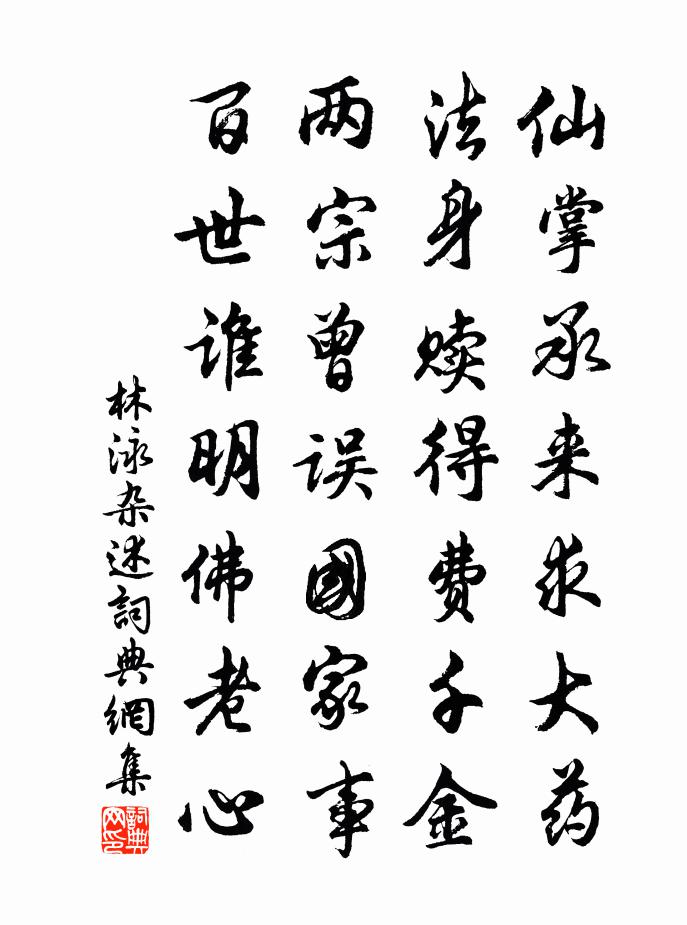 詩詞名句歷史字典書法欣賞書法字典國語詞典說文解字康熙字典古漢語字典標 題 作 者 詩 句 雜述作者:林泳 朝代:宋代雜述原文仙掌承來求大藥,法身贖得費千金。兩宗曾誤國家事,百世誰明佛老心。詩詞問答問:雜述的作者是誰?答:林泳問:雜述寫於哪個朝代?答:宋代林泳雜述書法欣賞雜述書法作品詩詞推薦寄舊同年何扶〔唐代〕金榜題名墨尚新,今年依舊去年春。花間每被紅妝問,何事重來只一人。和魯人孔周翰題詩二首蘇軾〔宋代〕壞壁題詩已五年,故人風物兩依然。定知來歲中秋月,又照先生枕麴眠。安仁挹仙亭吳芾〔宋代〕區區終日困塵勞,長恨仙山去路遙。豈謂一朝供顧挹,坐令逸氣出層霄。閔上人以鷺鷥二軸為寄因成二韻林逋〔宋代〕閒颺冬粉荷葦外,數聲惟欠叫秋陰。虛堂隱几時懸看,增得滄州趣更深。次元德弟韻裘萬頃〔宋代〕跋扈飛揚使我驚,鐵中雙鏃日錚錚。陳橋舊將今無用,一任於菟繞屋行。有懷半山老人再次韻二首黃庭堅〔宋代〕短世風驚雨過,成功夢迷酒酣。草玄不妨準易,論詩終近周南。新詩張鎡〔宋代〕一酌橋亭即便回,雪粘桃樹學疎梅。若教湖上鷗為了,此日真須三百杯。王右丞雪霽捕魚圖元好問〔金代〕江雲滉滉陰晴半,沙雪離離點江岸。畫中不信有天機,細向樹林枯處看。漁浦移家愧未能,扁舟蕭散亦何曾?白頭寄國子楊巨源祭酒姚合〔唐代〕日日新詩出,城中寫不禁。清高疑對竹,閒雅勝聞琴。門戶饒秋景,兒童解冷吟。雲山今作主,還借外人尋。奉和御製五嶽觀告成夏竦〔宋代〕岳鎮明神屢降康,聖心尊奉禮文揚。徽名祇薦昭殊典,秘宇欽崇報美祥。曲沼甘泉秋湛湛,浮榮嘉氣曉蒼蒼。金釭閒詠三首姜特立〔宋代〕銅山鼓鑄成何用,金谷榮華畢竟空。老子百年無長物,只留明月與清風。題槐安閣黃庭堅〔宋代〕曲閣深房古屋頭,病僧枯幾過春秋。垣衣蛛網蒙窗牖,萬象縱橫不系留。白蟻戰酣千里血,黃粱炊熟百年休。功成奉和御製迎聖像中路獲金龍送還茅山夏竦〔宋代〕巍巍真像範金成,瑞節棠舟遠導迎。精衷勵翼符神貺,藻衛葳蕤率禮經。蘭隄曉景漣漪靜,神龍報降祥雲映。雙上病中知皇子陂荷花盛發寄王繢裴夷直〔唐代〕十里蓮塘路不賒,病來簾外是天涯。煩君四句遙相寄,應得詩中便看花。和卓英英錦城春望眉娘〔唐代〕蠶市初開處處春,九衢明艷起香塵。世間總有浮華事,爭及仙山出世人。嵩山老人告行作六偈送之釋正覺〔宋代〕應緣分影來池月,游世無心出岫雲。適意歸來尖屋底,蔬畦還與力鉏勤。與高氏子楊尚書〔宋代〕十數年來聾耳聵,可將社酒便能翳。一心更顧清盲了,免見豪家小馬兒。二疊劉克莊〔宋代〕看來天地萃精英,占斷人間一味清。喚作花王應不忝,未應但做水仙兄。郡中上元燈減舊例三之二而又迎送使客七首楊萬里〔宋代〕北使才歸南使來,前船未送後舡催。元宵行樂年年事,兒女嗔人夜不回。曾郎元矩見過逾月聽其言久而不厭追感平昔為蘇轍〔宋代〕胄子相從得佳婿,掖垣同直喜良朋。交情不意隔生死,世事休論有廢興。宿草芊錦淚入土,故琴牢落恨填膺。遠來名句推薦春山煙欲收,天淡星稀小牛希濟《生查子·春山煙欲收》 大丈夫相時而動。曹雪芹《紅樓夢·第四回》 世上無難事,只怕不專心。佚名《增廣賢文·下集》 山高自有客行路,水深自有渡船人。吳承恩《西遊記·第七十四回》 三顧頻煩天下計,兩朝開濟老臣心。杜甫《蜀相》 東風裊裊泛崇光,香霧空濛月轉廊。蘇軾《海棠·東風裊裊泛崇光》 大風起兮雲飛揚。威加海內兮歸故鄉。劉邦《大風歌》 故園書動經年絕,華發春唯滿鏡生。崔塗《春夕》 明主之道,必明於公私之分韓非及後人《韓非子·飾邪》 撥雪尋春,燒燈續晝。暗香院落梅開後。毛滂《踏莎行·元夕》