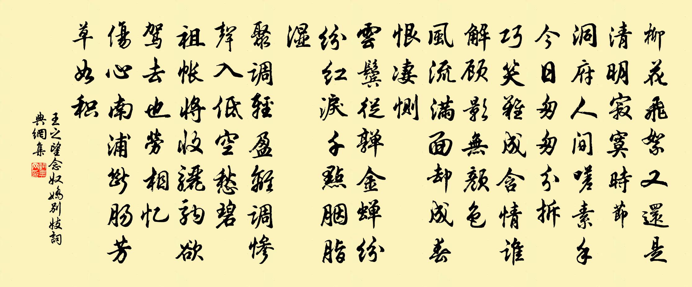 詩詞名句歷史字典書法欣賞書法字典國語詞典說文解字康熙字典古漢語字典標 題 作 者 詩 句 念奴嬌(別妓)作者:王之望 朝代:宋代念奴嬌(別妓)原文柳花飛絮,又還是、清明寂寞時節。洞府人間嗟素手,今日匆匆分拆。巧笑難成,含情誰解,顧影無顏色。風流滿面,卻成春恨悽惻。雲鬢從嚲金蟬,紛紛紅淚,千點胭脂濕。聚調輕盈離調慘,聲入低空愁碧。祖帳將收,驪駒欲駕,去也勞相憶。傷心南浦,斷腸芳草如積。詩詞問答問:念奴嬌(別妓)的作者是誰?答:王之望問:念奴嬌(別妓)寫於哪個朝代?答:宋代問:念奴嬌(別妓)是什麼體裁?答:詞王之望念奴嬌(別妓)書法欣賞念奴嬌(別妓)書法作品詩詞推薦射陽湖范仲淹〔宋代〕渺渺指平湖,煙波極望初。縱橫皆釣者,何處得嘉魚。寄杜家父二首黃庭堅〔宋代〕紅紫爭春觸處開,九衢終日犢車雷。閒 * 被春將去,鳥喚花驚只麽回。書事十首劉克莊〔宋代〕幼作淳熙版籍民,老逢景定改元新。殘年且盡杯中物,他日誰澆柏下人。長鑱谷中忙斸雪,小車花外遍尋春。吾評仆以紹熙壬子中夏二十有五日始躋篁討龍井敖陶孫〔宋代〕奇石斕橫道,茲山信多姿。江湖釃兩股,一泓乃孤危。相傳龍所家,或恐神護持。腥風轉湛對,陰岩立淋漓。惜無殿中覆考進士度正〔宋代〕交戟重門間九閽,彤庭紫殿切星辰。能來此地連宵直,即是驂鸞駕鶴人。贊三寶釋印肅〔宋代〕圓光應現無心物,大地山河恰似無。驪珠一顆非非相,信者權將作畫圖。春貼子詞太皇太后閣六首司馬光〔宋代〕盛德初臨震,陽和已動坤。發生天施大,厚載母儀尊。金縷詞 送王季境還廣陵張翥〔元代〕西子花湖邊路。花看依然、水光山色,自宜晴雨。天上歸來重載花,惟有舊盟鷗鷺。笑鬢影、星星如許。公子華筵十絕句寄趙帥陳造〔宋代〕一片飛花到客襟,當時便有惜春心。即今歸路慵抬眼,紅影彫疏綠影。為學一首示子侄彭端淑〔清代〕天下事有難易乎?為之,則難者亦易矣;不為,則易者亦難矣。人之為學有難易乎?學之,則難者亦易矣;不學,夏與熊王二秀才同宿僧院武元衡〔唐代〕共將纓上塵,來問雪山人。世綱從知累,禪心自證真。境空宜入夢,藤古不留春。一聽林公法,靈嘉願寄身。次韻和酬洛下宋京見寄魏野〔宋代〕聲名獨步向西都,主將風騷敵亞夫。龜洛泛應隨釣叟,龍門游想領生徒。公車未召身猶散,相府深知道豈孤。可惜逍遙詠宋太宗〔宋代〕日月無私照,人為似等閒。忙催紅葉落,靜想白雲間。善念皆知有,非緣勿用攀。目前深邃理,那是扣玄關。游山鮑溶〔唐代〕白道行深雲,雲高路彌細。時時天上客,遺路人間世。煙花最深處,井臼得空刺。天寒鶴巢林,石長泉脈閉。神化次韻三首曾幾〔宋代〕白日無偏照,玄冥不作難。有爐如許大,無地可言寒。書腹夤緣曬,禪心邂逅看。呼兒來共此,形影未孤單。七言小言聯句顏真卿〔唐代〕長路迢遙吞吐絲。 ——顏真卿蟭螟蚊睫察難知。 ——皎然寄謝三城太守韓子華舍人邵雍〔宋代〕洛陽自為都,二千有餘年。舉步圖籍中,開目今古間。西北岌宮殿,東南傾山川。照人伊洛清,迎門嵩少寒。水竹贈隱者宋自遜〔宋代〕或居岩谷或居廛,未作天仙且地仙。詩只半聯人寡和,畫才數筆世爭傳。彈琴無譜自成曲,賣藥資身不較錢。或問朝中措(送春)黎廷瑞〔宋代〕遊絲千萬暖風柔。只系得春愁。恨殺啼鶯句引,孤他語燕攀留。縱然留住,香紅吹盡,春也堪羞。去去不堪回首,滿庭芳(乙已八月十日登博見樓作)呂勝己〔宋代〕丹雘浮空,琉璃耀日,上雲樓閣眈眈。□□居士,燕坐息玄談。十載勞心問道,今悟罷、截日停參。凝神處,九苞名句推薦寒食後,酒醒卻咨嗟。蘇軾《望江南·超然台作》 勞而不伐,有功而不德,厚之至也。佚名《易傳·繫辭傳上·第八章》 喃喃教言語,一一刷毛衣。白居易《燕詩示劉叟》 花氣襲人知驟暖,鵲聲穿樹喜新晴。陸游《村居書喜》 採得百花成蜜後,為誰辛苦為誰甜。羅隱《蜂》 讀書不作儒生酸,躍馬西入金城關。謝逸《送董元達》 花滿河陽,為君羞褪晨妝茜。吳文英《燭影搖紅·賦德清縣圃古紅梅》 粉黛暗愁金帶枕,鴛鴦空繞畫羅衣,那堪辜負不思歸!顧敻《浣溪沙·雲淡風高葉亂飛》 取酒須勤醉,鄉關不可思。司馬光《送張寺丞覲知富順監》 篳路藍縷,以啟山林。左丘明《左傳·宣公·宣公十二年》