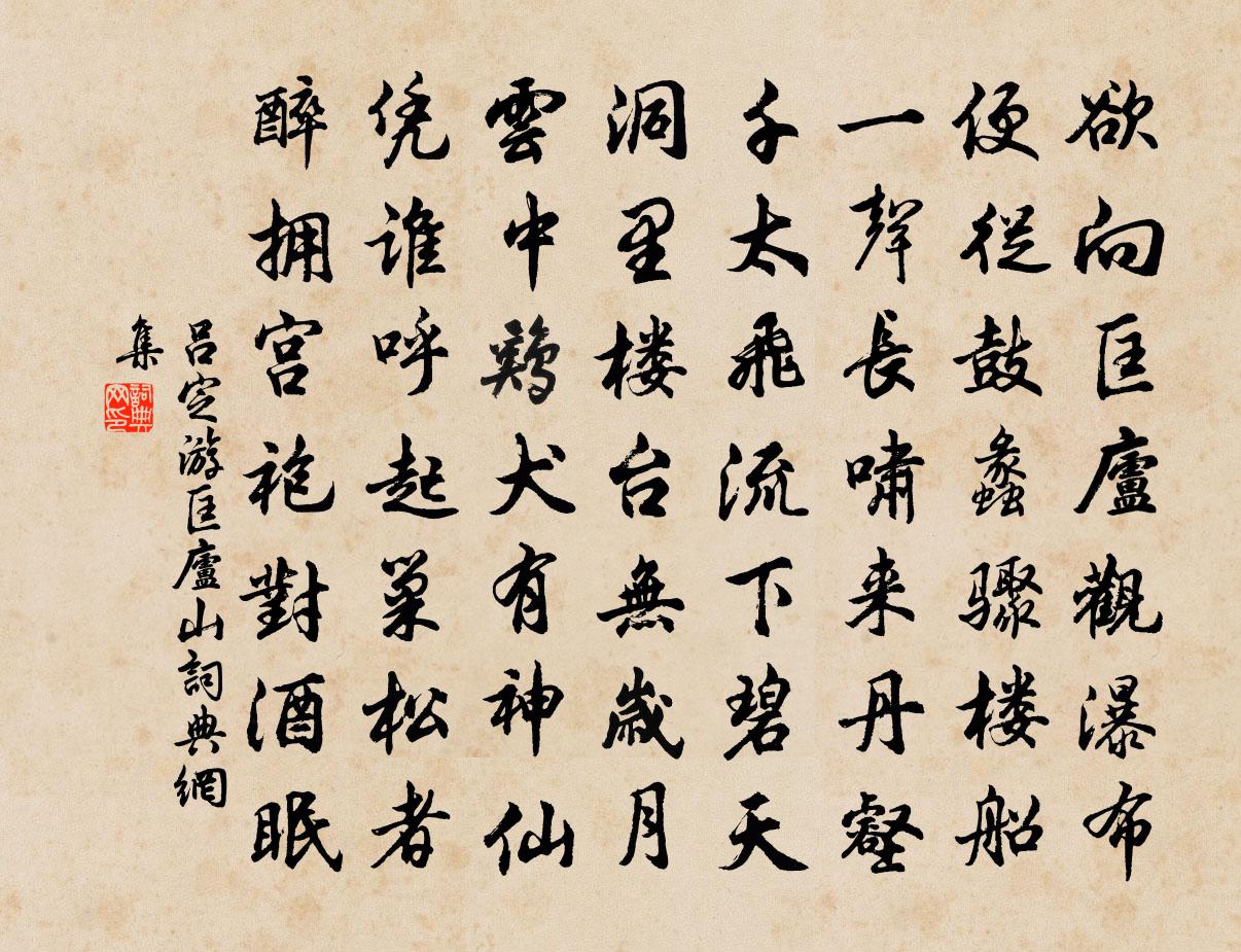 詩詞名句歷史字典書法欣賞書法字典國語詞典說文解字康熙字典古漢語字典標 題 作 者 詩 句 游匡廬山作者:呂定 朝代:宋代游匡廬山原文欲向匡廬觀瀑布,便從鼓蠡驟樓船。一聲長嘯來丹壑,千太飛流下碧天。洞裡樓台無歲月,雲中雞犬有神仙。憑誰呼起巢松者,醉擁宮袍對酒眠。詩詞問答問:游匡廬山的作者是誰?答:呂定問:游匡廬山寫於哪個朝代?答:宋代呂定游匡廬山書法欣賞游匡廬山書法作品詩詞推薦閒居初夏午睡起·其一楊萬里〔宋代〕梅子留酸軟齒牙,芭蕉分綠與窗紗。日長睡起無情思,閒看兒童捉柳花。絕句九首張耒〔宋代〕黃葉桑林赤土岡,蓬茅小徑度牛羊。似聞流乞之唐汝,嘆息何人為發倉。風不鳴條(一作舒元輿)黃頗〔唐代〕五緯起祥飆,無聲瑞聖朝。稍開含露蕊,才轉惹煙條。密葉應潛變,低枝幾暗搖。林間鶯欲囀,花下蝶微飄。初滿郊行釋紹嵩〔宋代〕花落江堤簇曉煙,遊人柳外蹙秋韃。直須分付丹青手,畫出清明二月天。借居夜聞水聲舒岳祥〔宋代〕寒水冷冷出洞來,月明靜聽轉清哀。無人與入琴絲寫,流下前溪漾落梅。鶉之奔奔佚名〔先秦〕鶉之奔奔,鵲之彊彊。人之無良,我以為兄!鵲之彊彊,鶉之奔奔。人之無良,我以為君!自君之出矣劉裕〔南北朝〕自君之出矣,金翠闇無精。思君如日月,回還晝夜生。次韻劉景文登鄭王台見思五首黃庭堅〔宋代〕茗花浮曾坑,酒泛酌宜城。路尋西九曲,人似漢三明。千戶非無相,五言空有聲。何時郭池晚,照影寫閒情。送春曲三首劉禹錫〔唐代〕春向晚,春晚思悠哉。風雲日已改,花葉自相催。漠漠空中去,何時天際來。春已暮,冉冉如人老,映葉見殘花,壓書玉兔強至〔宋代〕白玉雙蹲兔,工深刻楮勞。長疑奔月窟,渾欲動霜毛。似喜書成穴,猶驚筆有毫。案間誰汝待,自覺守株高。芒屨陸游〔宋代〕芒屨一雙青,筇枝九節輕。登山猶健在,投檄太遲生。滿意竹風冷,入懷溪月明。清秋故不遠,回首憶蓴羹。空廬釋文珦〔宋代〕荒徑草青青,空廬未始扃。好山皆在目,無事可勞形。已信虛空講,何妨樹石聽。悠然朝復莫,真道自相冥。贈凌仙姥施肩吾〔唐代〕阿母從天降幾時,前朝惟有漢皇知。仙桃不啻三回熟,飽見東方一小兒。玉盤盂蘇軾〔宋代〕花不能言意可知,令君痛飲更無疑。但持白酒勸嘉客,直待瓊舟覆玉彝。負郭相君初擇地,看羊屬國首吟詩。吾家句劉褒〔宋代〕客路雨連日。雜記五言十首劉克莊〔宋代〕愚哲皆根性,巫醫各有傳。參禪才一宿,學幻費三年。寄介然二首吳則禮〔宋代〕昨者偶持漢節,白頭未識烏蠻。飽飯癯然摩腹,笑聽船鼓過灣。縣中迎石金山甘靈大士就放生池祈雨早上偕簿虞儔〔宋代〕夜起占星畢,朝趨禮佛龕。擁橋蓮墜粉,縈沼水揉藍。屏翳何須靳,登伽不受參。懸知天欲雨,蟻戰已酣酣。和微之詩二十三首。和自勸二首白居易〔唐代〕稀稀疏疏繞籬竹,窄窄狹狹向陽屋。屋中有一曝背翁,委置形骸如土木。日暮半爐麩炭火,夜深一盞紗籠燭。不知閒居真山民〔宋代〕虛明兩竹窗,濟楚一書房。風動鳥移樹,花香蝶過牆。身安知病少,晝靜覺春長。未必全無事,終焉也勝忙。名句推薦自古明王聖帝,猶須勤學,況凡庶乎!顏之推《顏氏家訓·勉學篇》 時不可再,機不可失魏徵《隋書·列傳·卷三》 唯燒蒿棘火,愁坐夜待晨白居易《村居苦寒》 特君不以為政,而士不以為行故也。墨子《墨子·15章 兼愛(中)》 黃鶴樓前日欲低,漢陽城樹亂烏啼李夢陽《夏口夜泊別友人》 壚邊人似月,皓腕凝霜雪。韋莊《菩薩蠻·人人盡說江南好》 兵之利鈍是常事,貴因敗以為成耳。佚名《百戰奇略·第六卷·敗戰》 十分不耐煩,乃為人大病王永彬《圍爐夜話·第五四則》 懷春情不斷,猶帶相思舊子。吳文英《丁香結·夷則商秋日海棠》 舊山松竹老,阻歸程。岳飛《小重山·昨夜寒蛩不住鳴》