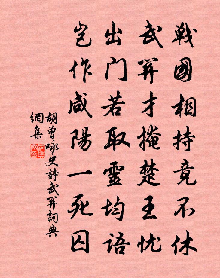 詩詞名句歷史字典書法欣賞書法字典國語詞典說文解字康熙字典古漢語字典標 題 作 者 詩 句 詠史詩武關作者:胡曾 朝代:唐代詠史詩武關原文戰國相持竟不休,武關才掩楚王憂。出門若取靈均語,豈作鹹陽一死囚。詩詞問答問:詠史詩武關的作者是誰?答:胡曾問:詠史詩武關寫於哪個朝代?答:唐代問:詠史詩武關是什麼體裁?答:七絕胡曾詠史詩武關書法欣賞詠史詩武關書法作品注釋全唐詩:卷647-41詩詞推薦鄰峰戴表元〔宋代〕霜嚴火炬青,月澹兩峰白。堂堂夜行誰,鄰峰販醝客。販醝事且止,歸農收又薄。技擊羽鞭撾,鮮肥憤烹炙。外雖墨君堂文同〔宋代〕嗜竹種復畫,渾如王掾居。高堂倚空岩,素壁交扶疏。山影覆秋靜,月色澄夜虛。蕭爽只自適,誰能愛吾廬。早飯乾溪蓋乾吉故居也陸游〔宋代〕劍外歸來席未溫,南征浩蕩信乾坤。峰迴內史曾游地,竹暗仙人舊隱村。白髮孤翁鉏麥壟,茜裙小婦闖籬門。行行寄牛相公杜牧〔唐代〕漢水橫衝蜀浪分,危樓點的拂孤雲。六年仁政謳歌去,柳遠春堤處處聞。贈鑒堂徐元傑〔宋代〕方寸無塵眼有筋,如他圖了幾勛臣。更煩提起丹青手,寫出驚天動地人。馬郎婦贊釋法薰〔宋代〕聲色純真,見聞不礙。宴坐經行,得大自在。腳頭腳底黑漫漫,又逐春風婦馬郎。游浯溪劉用行〔宋代〕祿兒豈解傾唐祚,觸使斯文壽兩翁。蜀道至今遺舊話,湘流澈底照孤忠。摧風溜雨中興字,轉地回天克復功。人說送楊廷秀秘監赴江東漕樓鑰〔宋代〕平生楊誠齋,可仰不可見。去年尺一書,老韓忽同傳。道山故仙伯,再上右文殿。蓬萊幾清淺,筆力愈雄健。獨挾劉元忠遺金橘梅堯臣〔宋代〕南方生美果,具體橘包微。韓彈有輕薄,楚萍知是非。甘香奉華俎,咀嚼破明璣。欲換齏鹽腹,盈匳忽我歸。南堂新甃花壇二首蘇轍〔宋代〕老木不忍伐,橫枝宜少除。根莖漸有托,雨露稍分余。生意初無損,開花終自如。他年諸草木,成就此幽居。和警齋侍郎二首劉克莊〔宋代〕家傳豈有枕中方,敢向堯朝議大章。難入高賢真率社,且尋童子釣游鄉。有西疇事咨衡宇,無北山移誚草堂。獨恨揚州五詠 摘星亭〈迷樓舊址。〉蘇轍〔宋代〕闕角孤高特地迷,迷藏渾忘日東西。江流入海情無限,莫雨連山醉似泥。夢裡興亡應未覺,後來愁思獨難齊。只堪和德粹三絕朱槔〔宋代〕平生樂事在三餘,不管梧陰過玉除。絕尾忽參嫠緯句,風塵今日正愁予。人日出遊湖上十首楊萬里〔宋代〕肩輿豈不穩,萬象非我有。呼童換馬來,湖山落吾手。久雨三首曹勛〔宋代〕五月正陽月,何嘗與兩期。浹旬檐溜注,冞夕水聲馳。古屋床床漏,苔牆堵堵隳。子桑誰復餉,勾漏政須醫。吟貽宣義大師英上人賈黃中〔宋代〕金僊子便是師師,高道寧容世網羈。浩浩心田龍可擾,飄飄行止鶴應知。塵機擺落超三界,古篆沉研冠一時。莫怪贈大猷王洋〔宋代〕棲遲下國傷蹉跎,更生父子交琢磨。雀羅門外賓客省,三膻堂中經史多。菑川起奉太常策,風雅先入光祿科。人間子夜四時歌 冬歌 四蕭衍〔南北朝〕一年漏將盡。萬里人未歸。君志固有在。妾軀乃無依。山居二首於石〔宋代〕不談當世事,榮辱兩無聞。詩思半山月,生涯一塢雲。硯乾分瀑潤,香斷借蘭熏。有客時相過,呼兒采澗芹。與北山陳龍圖劉克莊〔宋代〕小兒膽大說文章,螢火難爭兩曜光。侍講先生今寂寂,龍圖老子尚堂堂。鄰無羊仲並求仲,家有元方與季方。想見名句推薦朽木不可雕也,糞土之牆不可圬也!佚名《宰予晝寢》 君子矜而不爭,群而不黨。孔子弟子《論語·衛靈公篇》 笑時猶帶嶺梅香。試問嶺南應不好。蘇軾《定風波·南海歸贈王定國侍人寓娘》 見善思齊,足以揚名不朽;聞惡能改,庶得免乎大過。吳兢《貞觀政要·卷四·教戒太子諸王》 冰雪襟懷,琉璃世界,夜氣清如許。黃升《酹江月·夜涼》 舊山松竹老,阻歸程。岳飛《小重山·昨夜寒蛩不住鳴》 情往似贈,興來如答。劉勰《文心雕龍·物色》 蛾眉淡了教誰畫?瘦岩岩羞戴石榴花。關漢卿《大德歌·夏》 武皇去金閣,英威長寂寞江淹《銅爵妓》 赤日炎炎似火燒,野田禾稻半枯焦。施耐庵《水滸傳·第十六回》