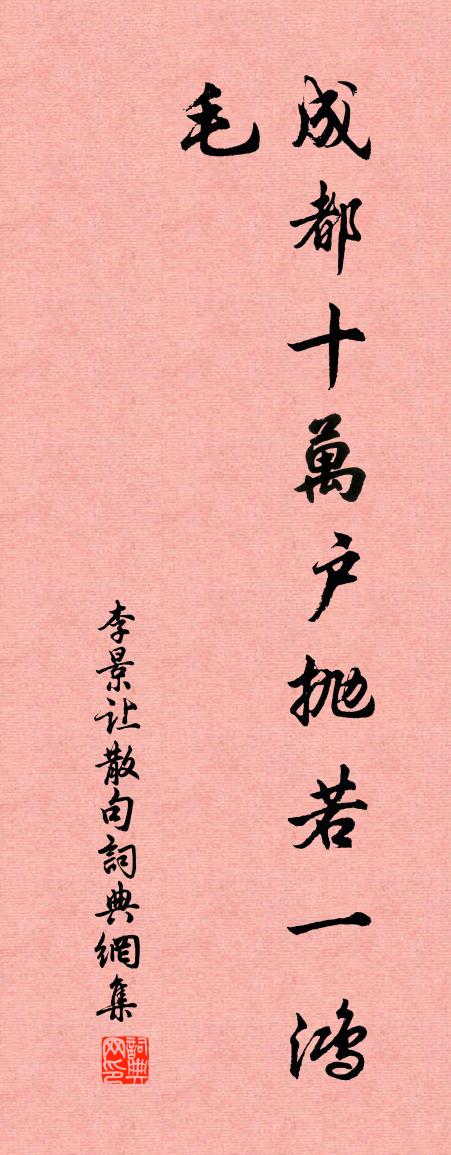 詩詞名句歷史字典書法欣賞書法字典國語詞典說文解字康熙字典古漢語字典標 題 作 者 詩 句 句作者:李景讓 朝代:唐代句原文成都十萬戶,拋若一鴻毛。詩詞問答問:句的作者是誰?答:李景讓問:句寫於哪個朝代?答:唐代問:句是什麼體裁?答:句李景讓句書法欣賞句書法作品注釋全唐詩:卷563-9詩詞推薦方池喻良能〔宋代〕四角朱弦直,雙橋小霓欹。寒星夜稀密,冷浸一枰棋。醉送李郢〔唐代〕江梅冷艷酒清光,急拍繁弦醉畫堂。無限柳條多少雪,一將春恨付劉郎。和巧松趙希逢〔宋代〕秦人無故起阿房,赤立千林赭眾岡。更覓長生游海上,不鈄松實作津梁。都丞侍郎再和屋字韻詩次韻奉酬喻良能〔宋代〕小園五畝依篁竹,中有茆茨數椽屋。小橋度水既窈窕,側徑穿花仍曲六。慣看翠碧羽差池,時聽黃鸝聲斷續。詩成聞笛劉翰〔宋代〕誰將玉笛按涼州,吹徹春風不下樓。若道聲聲都是恨,不知消得幾多愁。自述雍陶〔唐代〕萬事誰能問,一名猶未知。貧當多累日,閒過少年時。燈下和愁睡,花前帶酒悲。無謀常委命,轉覺命堪疑。次黃象之韻李呂〔宋代〕疏山元是讀書山,相望 * 舊醮壇。梵剎雄夸今日勝,隱居誰作故人看。閒隨米運川塗迥,喜入林亭境界寬。我已石庵釋紹曇〔宋代〕確硬工夫做十全,賓關深鎖綠蘿煙。險崖機峻無人透,幾見春山蕨豎拳。賈希德釋秘演〔宋代〕山東持木鐸,高識世難群。覽照驚秋鬢,看碑見舊文。救時曾抗牘,退跡欲眠雲。帳外橫經者,清朝已立勛。立春日有懷楊萬里〔宋代〕飄蓬敢恨一年遲,客里春光也自宜。白玉青絲那得謊,一杯咽下少陵詩。過湖上僧庵陸游〔宋代〕西庵每過未嘗開,邂逅清言始此回。陶令巾車尋壑去,巳公茅屋賦詩來。奇香炷罷雲生岫,瑞茗分成乳泛杯。便恐柳徐夤〔唐代〕漠漠金條引線微,年年先翠報春歸。解籠飛靄延芳景,不逐亂花飄夕暉。啼鳥噪蟬堪悵望,舞煙搖水自因依。五株佳人杜甫〔唐代〕絕代有佳人,幽居在空谷。自雲良家子,零落依草木。關中昔喪敗,兄弟遭殺戮。官高何足論,不得收骨肉。世情奉和麟德殿宴百僚應制鮑君徽〔唐代〕睿澤先寰海,功成展武韶。戈鋋清外壘,文物盛中朝。聖祚山河固,宸章日月昭。玉筵鸞鵠集,仙管鳳凰調。御柳中夜聞雁趙蕃〔宋代〕夜闌群物久已息,胡獨決起飛仍號。江湖雖寬矰繳在,幸勿中機漁獵曹。端嘉雜詩二十首劉克莊〔宋代〕萇尤桀點于堅者,勒固奸雄奈虎何。剩制赭袍添曲蓋,中原假帝不勝多。一枝春周密〔宋代〕簾影移陰,杏香寒、乍濕西園絲雨。芳期暗數。又是去年心緒。金花謾翦,倩誰畫、舊時眉嫵。空自想、楊柳風流重九後三日後圃黃華盛開坐客有論近世菊品日魏了翁〔宋代〕南陽有佳人,被服長修姱。黃中粲有章,秀外青無華。圾飲晉柴桑,夕餐楚長沙。惟與高人處,恥作流俗夸。玄都送辛都官知鄂州梅堯臣〔宋代〕衣上大梁雪,門前武昌車。使君行有期,將逢鳥隼旟。車動自轣轆,旟輕自舒舒。去都越千里,城在江上居。黃鶴句釋可勛〔宋代〕天曉不乾鐘鼓事,月明豈為夜行人。名句推薦荷葉出地尋丈,因列坐其下,上不見日。姜夔《念奴嬌·鬧紅一舸》 寧為雞口,無為牛後。劉向《戰國策·韓一·蘇秦為楚合從說韓王》 昨日入城市,歸來淚滿巾。張俞《蠶婦》 君獨不見長城下,死人骸骨相撐拄。陳琳《飲馬長城窟行》 寒梅最堪恨,常作去年花。李商隱《憶梅》 不以規矩,不能成方圓孟子《孟子·離婁章句上·第一節》 休別有魚處,莫戀淺灘頭。佚名《增廣賢文·上集》 自別西風憔悴甚,凍雲流水平橋。陳維崧《臨江仙·寒柳》 絕頂茅庵里,老衲正孤吟。納蘭性德《水調歌頭·題西山秋爽圖》 去年今日關山路,細雨梅花正斷魂。蘇軾《正月二十日往岐亭郡人潘古郭三人送余於女王城東禪莊院》
