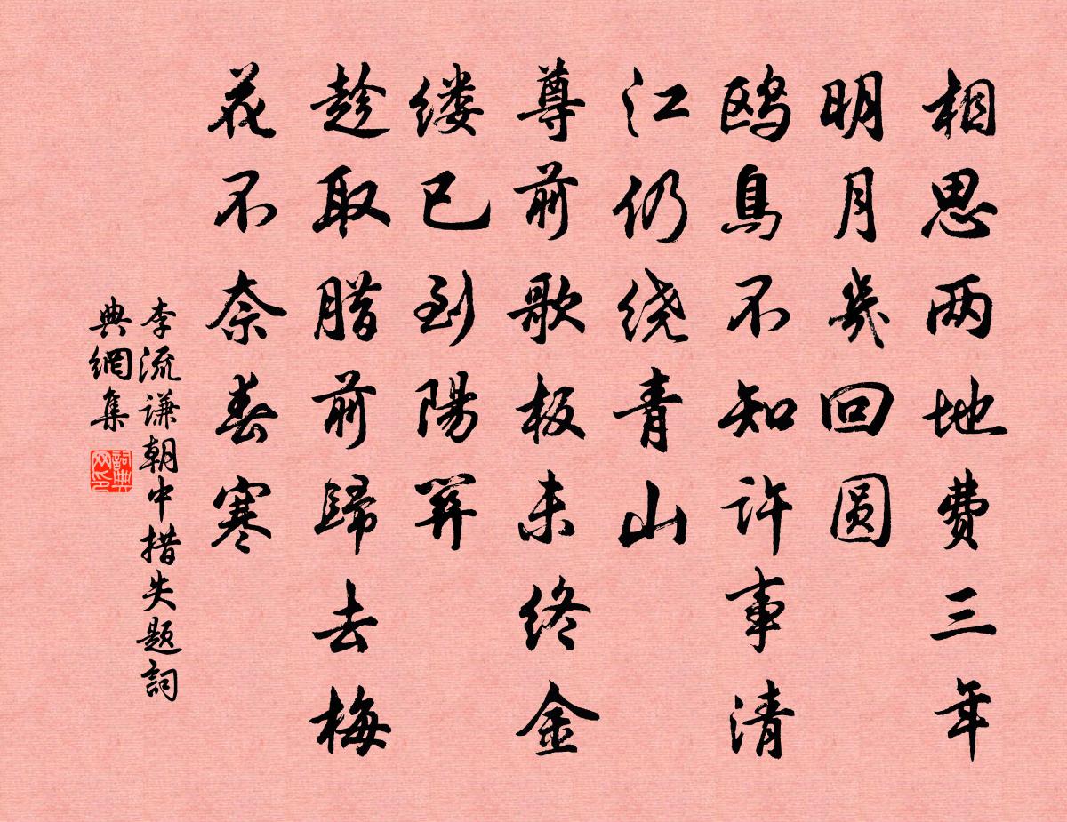 詩詞名句歷史字典書法欣賞書法字典國語詞典說文解字康熙字典古漢語字典標 題 作 者 詩 句 朝中措(失題)作者:李流謙 朝代:宋代朝中措(失題)原文相思兩地費三年。明月幾回圓。鷗鳥不知許事,清江仍繞青山。尊前歌板,未終金縷,已到陽關。趁取臘前歸去,梅花不奈春寒。詩詞問答問:朝中措(失題)的作者是誰?答:李流謙問:朝中措(失題)寫於哪個朝代?答:宋代問:朝中措(失題)是什麼體裁?答:詞李流謙朝中措(失題)書法欣賞朝中措(失題)書法作品詩詞推薦十二時(秋夜)柳永〔宋代〕晚晴初,淡煙籠月,風透蟾光如洗。覺翠帳、涼生秋思。漸入微寒天氣。敗葉敲窗,西風滿院,睡不成還起。更漏龍溪新亭曾惇〔宋代〕懷玉知名寺,諸峰翠插天。凌雲飛略彴,照水舞蜿蜒。午日孤穿履,新涼定著鞭。更須煩惠遠,小立虎溪邊。送劉從周教授劉過〔宋代〕鳳閣鸞台次第留,此生何必為身謀。工夫到易通三聖,潔白寺身第一流。桑梓胸思如子少,萍蓬自嘆此生浮。還鄉睢陽五老圖蘇頌〔宋代〕歸休謝事樂時閒,衣缽承傳宰輔冠。感德舊曾親善政,沾恩新賜立危桓。堂堂嚴貌依襲袞,粲粲文星荷月寒。直筆次韻答頓起二首蘇軾〔宋代〕挽袖推腰踏破紳,舊聞攜手上天門。相逢應覺聲容似,欲話先驚歲月奔。新學已皆從許子,諸生猶自畏何蕃。殿廬游匡廬山呂定〔宋代〕欲向匡廬觀瀑布,便從鼓蠡驟樓船。一聲長嘯來丹壑,千太飛流下碧天。洞裡樓台無歲月,雲中雞犬有神仙。憑誰春日有作朱淑真〔宋代〕景近清明節,垂楊翠縷長。塞鴻歸朔漠,海燕渡瀟湘。花麗繁爭景,鶯嬌巧轉簧。西園正明媚,收拾入吟鄉。頌古十四首院主問病釋可湘〔宋代〕撥開日面與月面,彷佛前三及後三。病在膏肓重爝艾,昏兜院主可無慚。越溪村居戴叔倫〔唐代〕年來橈客寄禪扉,多話貧居在翠微。黃雀數聲催柳變,清溪一路踏花歸。空林野寺經過少,落日深山伴侶稀。負米明日復雨排悶陸游〔宋代〕湖上孤村冷欲冰,更堪衰與病相乘!夢回點滴檐間雨,心折青熒帳外燈。雖有數椽常似客,僅存一肉未成僧。披衣奉和幸大薦福寺(寺乃中宗舊宅)趙彥昭〔唐代〕寶地龍飛後,金身佛現時。千花開國界,萬善累皇基。北闕承行幸,西園屬住持。天衣拂舊石,王舍起新祠。剎鳳丫頭岩徐元傑〔宋代〕丫頭不是女丫鬟,把作堅牢擔拄看。撐定東南天半壁,鎮教雙聳碧雲端。客中二絕李流謙〔宋代〕角聲定自與誰語,月色不應無為明。已作楊花著泥久,無多心事惹愁生。贈趙將軍張籍〔唐代〕當年膽略已縱橫,每見妖星氣不平。身貴早登龍尾道,功高自破鹿頭城。尋常得對論邊事,委曲承恩掌內兵。會取長沙寺桂花重開陳與義〔宋代〕天遣幽花兩度開,黃昏梵放此徘徊。不教居士臥禪榻,喚出西廂共看來。池州和同官詠梅花張道洽〔宋代〕春腳到寒枝,詩情滿雪籬。每留孤鶴伴,不遣一蜂知。風漏臘前信,月描塵外姿。憶從歸閬苑,終歲只君思。壽同父兄七十二首陳著〔宋代〕吾家兄弟篤天倫,晚景怡怡僅兩人。門戶相依杏陰舊,藩籬不隔棣華春。難逢燕夜如今日,回愧鱗年以次身。造物魚遊春水 避亂還家,見桃花盛開梁寅〔元代〕家臨千峰翠。幽徑重開荊棘里。小桃花艷,春日盈盈霞綺。香入騷人碧玉杯,色映游女青螺髻。帶露更嬌,迎風尤上達奚舍人孟郊〔唐代〕北山少日月,草木苦風霜。貧士在重坎,食梅有酸腸。萬俗皆走圓,一身猶學方。常恐眾毀至,春葉成秋黃。大賢雜歌謠辭步虛詞劉禹錫〔唐代〕阿母種桃雲海際,花落子成二千歲。海風吹折最繁枝,跪捧瓊盤獻天帝。華表千年鶴一歸,凝丹為頂雪為衣。星星名句推薦宿醉離愁慢髻鬟,六銖衣薄惹輕寒,慵紅悶翠掩青鸞韓偓《浣溪沙·宿醉離愁慢髻鬟》 時靸雙鴛響,廊葉秋聲。吳文英《八聲甘州·靈岩陪庾幕諸公游》 風前欲勸春光住。春在城南芳草路。辛棄疾《玉樓春·風前欲勸春光住》 欲系青春,少住春還去。朱淑真《蝶戀花·送春》 弓開如秋月行天,箭去似流星落地羅貫中《三國演義·第十六回》 書當快意讀易盡,客有可人期不來。陳師道《絕句·書當快意讀易盡》 朱門酒肉臭,路有凍死骨。杜甫《自京赴奉先縣詠懷五百字 / 自京赴奉先詠懷五百字》 悠悠天宇曠,切切故鄉情。張九齡《西江夜行》 多欲則貪,尚私則枉,其罪遂生。來俊臣《羅織經·閱人卷第一》 向淺洲遠渚,亭亭清絕。張炎《疏影·詠荷葉》
