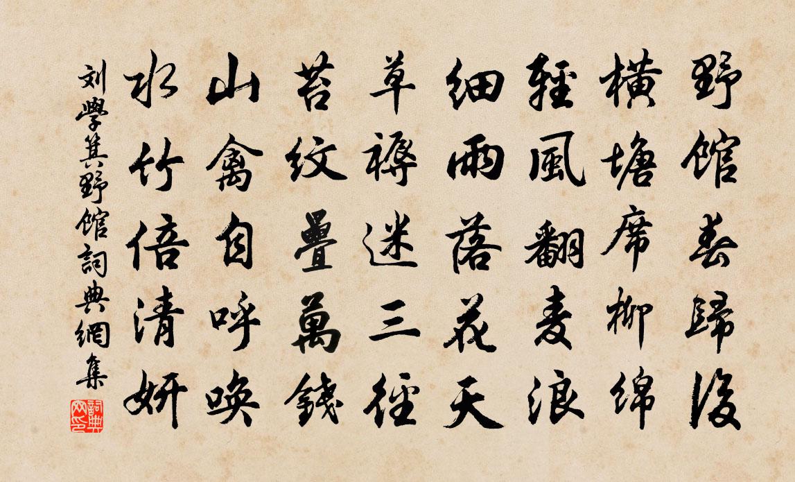 詩詞名句歷史字典書法欣賞書法字典國語詞典說文解字康熙字典古漢語字典標 題 作 者 詩 句 野館作者:劉學箕 朝代:宋代野館原文野館春歸後,橫塘席柳綿。輕風翻麥浪,細雨落花天。草褥迷三徑,苔紋疊萬錢。山禽自呼喚,水竹倍清妍。詩詞問答問:野館的作者是誰?答:劉學箕問:野館寫於哪個朝代?答:宋代劉學箕野館書法欣賞野館書法作品詩詞推薦贈衡陽簿林士愷趙汝騰〔宋代〕吾黨仲容,行修能通。而志卓然,以慕直躬。嘗儕扣閽,力摧奸鋒。上旌其言,擢第南官。府庠諸生,坐斥匆匆。複次韻四首陳造〔宋代〕昔上瞿塘灩預堆,盤渦如井放船開。山行歡喜今非錯,備見梢濆撆漩來。菩薩蠻 中秋雨姚燧〔元代〕素娥會把詩人調。衰顏不值圓蟾照。特地變雲陰。江城三日霖。今宵佳節過。天上冰輪破。才卻放餘輝。要看清興城西楊梅陳允平〔宋代〕炎炎火樹照千山,南客應同荔子看。金穀人游紅步障,玉房仙煉紫華丹。猩唇泣露珊瑚軟,鶴頂迎風瑪瑙寒。若使念奴嬌(用前韻和丹桂)辛棄疾〔宋代〕道人元是,道家風、來作煙霞中物。翠幰裁犀遮不定,紅透玲瓏油壁。借得春工,惹將秋露,薰做江梅雪。我評花渡瓜洲文天祥〔宋代〕跨江半壁閱千帆,虎在深山龍在潭。當日本為南制北,如今翻被北持南。眼前風景異山河,無柰諸君笑語何。坐上飲馬長城窟鄭起〔宋代〕飲馬長城窟,下見征人骨。長城窟雖深,見骨不見心。誰知征人心,怨殺秦至今。北邊風打山,草地荒漫漫。五月白龍洞徐似道〔宋代〕靈仙窟宅不多見,車馬往來成再游。後洞白雲前洞出,上池紅葉下池流。水花照眼明金鯽,石發藏春護玉虬。邂逅次韻李大著春日雜詩十首喻良能〔宋代〕帝里春仍好,風和晝漏遲。但懷三釜樂,遑恤北山移。老大諳斑戲,空疏愧色絲。平生杜陵老,耿耿寸心知。何無適同宿山中次韻王柏〔宋代〕虎踞龍蟠釋 * ,藥香時出小橋東。人眠依約三更後,月在清明一氣中。千古心期應共遠,半生懷抱此時融。清泉懸鐘方信孺〔宋代〕絕壁初無路可通,何人特地鑄金鐘。神仙底處應難詰,彈落餘聲和澗松。臨邛試士程公許〔宋代〕沉沉鎖棘春風晚,漠漠重簾書景移。白佇曉寒疑夢事,袖間猶記默淋漓。美人圖唐寅〔明代〕春色關心萬種情,酒杯聊寞可憐生。折花比對佳人面,把臂相同覺命輕。安陶舟中晁補之〔宋代〕繚繞春堤去欲窮,參差煙塢到還通。依依潤柳侵晨雨,細細吹花傍午風。頌古二十一首釋心月〔宋代〕奇特老尊宿,大無慚愧人。盤陀石上藕,喜見一番新。讀易陸游〔宋代〕大易中含造化機,王何元未造精微。乾坤要自吾身看,臥聽雞鳴起索衣。弱柳張詠〔宋代〕枝莖何弱種何緣,著架扶持勢可憐。但見低垂長衛足,更無疏疏欲參天。離情謾指千條線,野興堪驚一點菸。最惜詩本乾隆〔清代〕詩本例分上下編,率當一百冊余篇。丁年樂府補空白,戌歲盛京綴帙全。秋月春風景無問,山情水態句捐妍。即今出榆關劉著〔金代〕羽檄中原滿,萍流四海間。少時過桂嶺,壯歲出榆關。奇禍心如折,羈愁鬃巳斑。楚纍千萬億,知有幾人還。游龍門分題十五首下山歐陽修〔宋代〕行歌翠微里,共下山前路。千峰返照外,一鳥投岩去。渡口晚無人,系舸芳洲樹。名句推薦何處秋風至?蕭蕭送雁群。劉禹錫《秋風引》 吹笳暮歸野帳,雪壓青氈。陸游《漢宮春·初自南鄭來成都作》 記得武陵相見日,六年往事堪驚周紫芝《臨江仙·送光州曾使君》 恨蕭蕭、無情風雨,夜來揉損瓊肌。李清照《多麗·詠白菊》 韶華不為少年留,恨悠悠,幾時休?秦觀《江城子·西城楊柳弄春柔》 君子有過行,小人嫉之不能容;君子無過行,小人嫉之亦不能容王永彬《圍爐夜話·第三三則》 露從今夜白,月是故鄉明。杜甫《月夜憶舍弟》 治國者,必以奉法為重。羅貫中《三國演義·第九十六回》 怒濤卷霜雪,天塹無涯。柳永《望海潮·東南形勝》 如今卻憶江南樂,當時年少春衫薄。韋莊《菩薩蠻·如今卻憶江南樂》