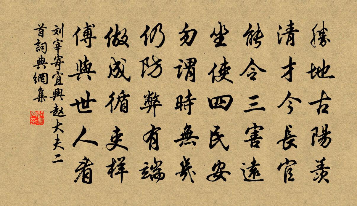 詩詞名句歷史字典書法欣賞書法字典國語詞典說文解字康熙字典古漢語字典標 題 作 者 詩 句 寄宜興趙大夫二首作者:劉宰 朝代:宋代寄宜興趙大夫二首原文勝地古陽羨,清才今長官。能令三害遠,坐使四民安。勿謂時無幾,仍防弊有端。做成循吏樣,傅與世人看。詩詞問答問:寄宜興趙大夫二首的作者是誰?答:劉宰問:寄宜興趙大夫二首寫於哪個朝代?答:宋代劉宰寄宜興趙大夫二首書法欣賞寄宜興趙大夫二首書法作品詩詞推薦雜賦陸游〔宋代〕七十八十古來稀,行年九十固應衰。已興工部耳聾嘆,更和文公齒落詩。別秀亭五首方回〔宋代〕七載專城閒五載,賴逢此地足娛賓。高憑遠眺最佳處,□飲能吟凡幾人。晚輩漸催前輩老,來時豈料去時貧。是身西江月(制香)陳深〔宋代〕龍沫流芳旎旎,犀沈鋸削霏霏。薇心玉露練香泥。厭盡人間花氣。銀葉初溫火緩,金猊靜裊煙微。此時清賞只心知蝶戀花楊 * 〔宋代〕初過元宵三五後。曲檻依依,終日搖金牖。瘦損舞腰非為酒。長條聊贈垂鞭手。幾葉小梅春已透。信是風流,占盡別兩絕邵雍〔宋代〕樓外花深礙小車,難忘有德見思多。欲馮桃李為之謝,桃李無言爭奈何。送陸先生聖修赴春闈周必大〔宋代〕送君南浦慘離情,握手依依數去程。日薄雲濃風轉勁,江寒水落浪還生。此時執別仙舟穩,後夜相思山月明。好把美人春臥梁鍠〔唐代〕妾家巫峽陽,羅幌寢蘭堂。曉日臨窗久,春風引夢長。落釵仍掛鬢,微汗欲消黃。縱使朦朧覺,魂猶逐楚王。荊州寄貫微上人齊己〔唐代〕舊齋休憶對松關,各在王侯顧遇間。命服已沾天渥澤,衲衣猶擁祖斕斑。相思莫救燒心火,留滯難移壓腦山。得失浣溪沙 和勉夫四首袁易〔元代〕一月寒陰不放春。打窗風雨太頻頻。竹床仰臥看承塵。客去祗殘書葉亂,愁來獨有酒杯親。鏡中白髮不饒人。代贈張耒〔宋代〕洞房飛香作春霧,仙人勸酒香中語。明眸第二紫雲娘,鶯學歌聲柳如舞。蹙眉長歌澧有蘭,銀鉤請君春草篇。繁弦送莫甥兼諸昆弟從韓司馬入西軍孟浩然〔唐代〕念爾習詩禮,未曾嘗戶庭。平生早偏露,萬里更飄零。坐棄三冬業,行觀八陣形。飾裝辭故里,謀策赴邊庭。壯志霪雨中偶書所見王禹偁〔宋代〕丙申二月七,是夕月離畢。春雲忽霮{上雨下對},春兩復蒙密。綿綿殆三旬,不見天上日。謫官在淮甸,幽抱常壽櫟堂前小山峰凌霄花盛開,蔥蒨如畫,因名范成大〔宋代〕天風搖曳寶花垂,花下仙人住翠微。一夜新枝香焙暖,旋薰金縷綠羅衣。山容花意各翔空,題作凌霄第一峰。門外山行書事長孫佐輔〔唐代〕日落風風高風高,驅車行遠郊。中心有所悲,古墓穿黃茅。茅中狐兔窠,四面烏鳶巢。鬼火時獨出,人煙不相交。投宿蒲圻縣鄭剛中〔宋代〕咫尺蒲圻縣,泥深路屈盤。小橋飛雪急,破帽蹇驢寒。家信無人害,愁悰賴酒寬。轉坡聞有寺,一榻借偷安。梅花三詠董師謙〔宋代〕雪花霜須苔鮮枝,玉堂事去且疏籬。世人孔鼻無分別,吐露芳心欲向誰。游五泄山唐詢〔宋代〕尋徹靈潭第五源,旋攀蘿蔦至山巔。寒聲昔謂來天外,巨壑今知在目前。峭壁無時長蔽日,重岩不雨亦生煙。臨觀淳熙七年春帖子 其三崔敦詩〔宋代〕天上春光別,時康樂事繁。煙花浮閬苑,露葉簇金盤。放小魚邵雍〔宋代〕纖鱗不足留,此失一生休。放爾江湖去,寬渠鼎鑊憂。更宜深避網,慎勿誤吞鉤。天下多庖者,無令落庶羞。春日江津游望杜審言〔唐代〕旅客搖邊思,春江弄晚晴。煙銷垂柳弱,霧卷落花輕。飛棹乘空下,回流向日平。鳥啼移幾處,蝶舞亂相迎。忽嘆名句推薦輪台九月風夜吼,一川碎石大如斗,隨風滿地石亂走。岑參《走馬川行奉送出師西征 / 走馬川行奉送封大夫出師西征》 故鄉籬下菊,今日幾花開。江總《於長安歸還揚州九月九日行薇山亭賦韻 / 長安九日詩》 西風來勸涼雲去,天東放開金鏡。史達祖《齊天樂·中秋宿真定驛》 孤雲將野鶴,豈向人間住。劉長卿《送方外上人 / 送上人》 桃李務青春,誰能貫白日。李白《長歌行》 紛紛暮雪下轅門,風掣紅旗凍不翻。岑參《白雪歌送武判官歸京》 三軍可奪帥也,匹夫不可奪志也。佚名《論語十二章》 馬蹄濃露,雞聲淡月,寂歷荒村路。張榘《青玉案·被檄出郊題陳氏山居》 停車坐愛楓林晚,霜葉紅於二月花。杜牧《山行》 萬里雲間戍,立馬劍門關。崔與之《水調歌頭·題劍閣》