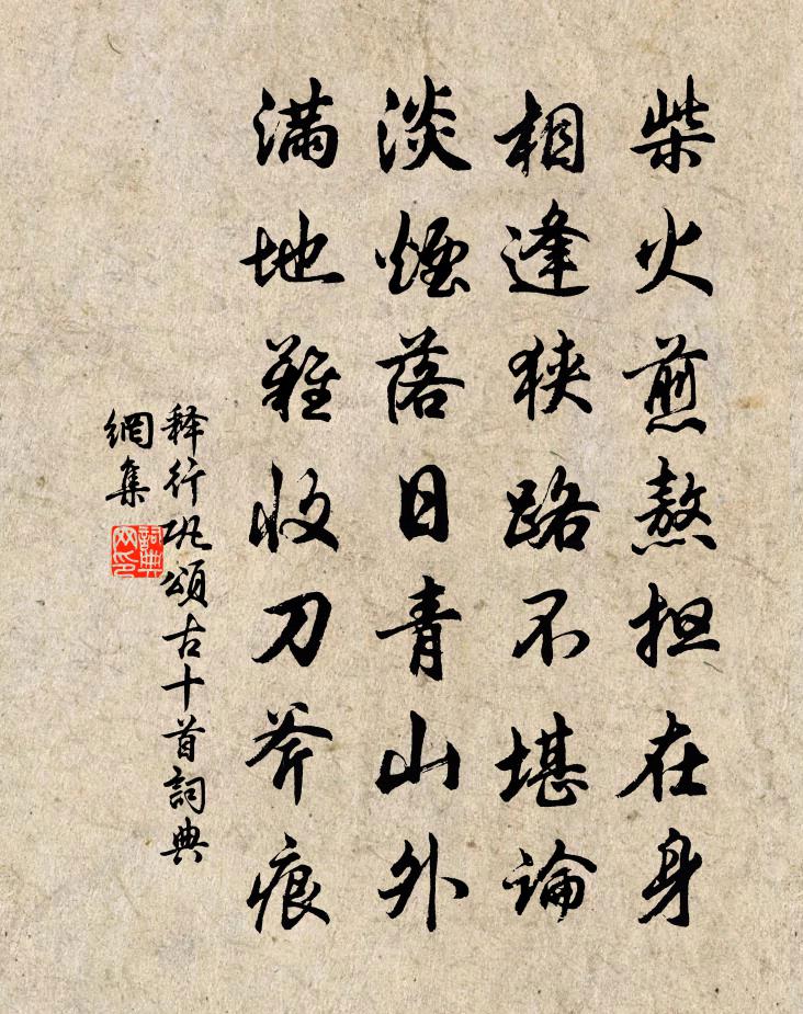 詩詞名句歷史字典書法欣賞書法字典國語詞典說文解字康熙字典古漢語字典標 題 作 者 詩 句 頌古十首作者:釋行鞏 朝代:宋代頌古十首原文柴火煎熬擔在身,相逢狹路不堪論。淡煙落日青山外,滿地難收刀斧痕。詩詞問答問:頌古十首的作者是誰?答:釋行鞏問:頌古十首寫於哪個朝代?答:宋代釋行鞏頌古十首書法欣賞頌古十首書法作品詩詞推薦偈頌七十六首釋師觀〔宋代〕法法本來法,無法無非法。這個是烏回拄杖子,那個是本來法。林正惠公輓詞樓鑰〔宋代〕凜凜古循吏,堂堂真巨公。死生忘度外,邪正烱胸中。憂世心誠切,籌邊事已空。龜潭山下水,流慶與無窮。裴尹東溪別業李頎〔唐代〕公才廊廟器,官亞河南守。別墅臨都門,驚湍激前後。舊交與群從,十日一攜手。幅巾望寒山,長嘯對高柳。清歡閒賦徐集孫〔宋代〕梅花白向鬢根生,歲月蹉跎事欠成。讀過故書溫有味,借來新絮冷無情。未霜山寺昏鍾勁,欲霽湖亭夕照明。多少寄贈長安孫紫微魏野〔宋代〕帶掌絲綸出鎮時,樂天當日未如之。九遷官職光鵷鷺,百二山河壯虎貔。漢殿舊題司馬賦,秦樓新唱舍人詩。相思浪淘沙劉禹錫〔唐代〕流水淘沙不暫停,前波未滅後波生。令人忽憶瀟湘渚,回暗迎神三兩聲。春社王同祖〔宋代〕廉纖霧雨四山昏,寂寂茅檐半掩門。客裹不知今日社,偶過野廟見分膰。和朱舅暮春積雨宋庠〔宋代〕沮洳江雲寂寞春,一軒風雨嘆彌旬。灰殘淮館蟾韜暈,石去湘陵燕濕身。委路落花紅罷舞,傍樓低柳綠爭顰。蕭蕭紹興二十八年祀圜丘學士院〔宋代〕舞具八佾,樂佃六成。大矣孝熙,厲意聲精。已事而竣,回軫還術。我應受之,以莫不增。題淵明愛菊圖吳梅卿〔宋代〕秋菊由來美,願言愛者誰。聞道陶彭澤,嗜彼獨孜孜。嗟嗟兮秋菊,何入淵明思。我今忽解得,不肯告人知。感興五首次韻和李希孝二晁補之〔宋代〕人生須富貴,如俟河之清。草木競榮華,春服亦已輕。桑田自足樂,未可居高明。君子順天道,小人眷時名。會雙竹蓆上奉答開祖長官蘇軾〔宋代〕松柏蕭蕭滿故丘,知君懷抱尚悲秋。算來九九無多日,唱著三三憶舊遊。皓月徘徊應許共,清詩妙絕不容酬。梅花吳下同年會詩周承勛〔宋代〕青雲紫陌不相違,四海如公省見稀。身在外台嚴刺舉,詩來屬邑慰瞻依。珠園授筆驅春雨,澤國揚帆送夕暉。留落某與鮮于綽元勛共約同習制科李廌〔宋代〕趙括痴兒漫喜兵,他年自料困長平。將軍各有萬人敵,下士難先二子鳴。盧駱楊王何足算,江黃六蓼豈勞征。英雄登當塗凌歊台吳龍翰〔宋代〕高台突兀玉千尋,尚想當年翠輦臨。坐守夕陽移半塔,我吟未了讓蟬吟。六月喜雨三首楊萬里〔宋代〕今年不是雨來慳,不後秧時亦不前。自古浙西長苦澇,近來無澇恰三年。睢陽春日偶書二首強至〔宋代〕凍柳輕能舞,枯河暖亦流。東風應自好,遠客獨含愁。攬鏡傷吟鬢,無錢買釣舟。誰能終日興,大半在滄洲。不寢杜牧〔唐代〕到曉不成夢,思量堪白頭。多無百年命,長有萬般愁。世路應難盡,營生卒未休。莫言名與利,名利是身仇。送龔少貽北赴汀州司戶王邁〔宋代〕莊敏與文獻,諸孫總俊髦。此郎如玉樹,初筮即珠曹。官小人能大,心清名自高。公餘須力學,流俗易滔滔。越鳥鄭谷〔唐代〕背霜南雁不到處,倚棹北人初聽時。梅雨滿江春草歇,一聲聲在荔枝枝。名句推薦客路青山外,行舟綠水前。王灣《次北固山下》 稚子金盆脫曉冰,彩絲穿取當銀鉦。楊萬里《稚子弄冰》 國大而政小者,國從其政;國小而政大者,國益大。管仲《管子·霸言》 君行四月草萋萋,柳花桃花半委泥。納蘭性德《送蓀友》 幼敏悟過人,讀書輒成誦。歐陽修《畫地學書》 故人相望若為情。別愁深夜雨,孤影小窗燈。陳克《臨江仙·四海十年兵不解》 未老莫還鄉,還鄉須斷腸。韋莊《菩薩蠻·人人盡說江南好》 樓台處處迷芳草,風雨年年怨落花。曾棨《維揚懷古》 千年史冊恥無名,一片丹心報天子。陸游《金錯刀行》 平生不做皺眉事,世上應無切齒人。佚名《增廣賢文·上集》