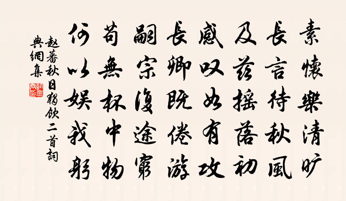詩詞名句歷史字典書法欣賞書法字典國語詞典說文解字康熙字典古漢語字典標 題 作 者 詩 句 秋日獨飲二首作者:趙蕃 朝代:宋代秋日獨飲二首原文素懷樂清曠,長言待秋風。及茲搖落初,感嘆如有攻。長卿既倦遊,嗣宗復途窮。苟無杯中物,何以娛我躬。詩詞問答問:秋日獨飲二首的作者是誰?答:趙蕃問:秋日獨飲二首寫於哪個朝代?答:宋代趙蕃秋日獨飲二首書法欣賞秋日獨飲二首書法作品詩詞推薦偈頌八十七首釋慧開〔宋代〕掣斷繩頭欲自由,那知定業未容休。再償拽杷拖犁債,鼓得西法水逆流。睡起黃庭堅〔宋代〕彷佛江南一夢中,虛堂盡日轉溫風。春深稍覺裌衣重,晝永不知樽酒空。實之有詩複次其韻黃公度〔宋代〕鞅掌從王事,招邀愧主人。彈琴秋葉落,聽雨夜床親。歲月何妨紀,詩篇莫厭頻。要令千載下,不但數姜秦。沁園春嚴羽〔宋代〕問訊溪莊,景如之何,吾為平章。自月湖不見,江山零落,驪塘去後,煙月淒涼。有老先生,如梅峰者,健筆縱橫囚中記貧華岳〔宋代〕英雄不遇不憂貧,獄吏從教喚不應。煮飯只燒沽酒鑵,讀書權借守囚燈。堪嗟世事危如卵,無怪人情冷似冰。勿謂怪菌歌楊萬里〔宋代〕雨前無物撩眼界,雨里道邊出奇怪。數莖枯菌破土膏,即時便與人般高。撒開圓頂丈來大,一菌可 * 一個。黑如別鶴杜牧〔唐代〕分飛共所從,六翮勢催風。聲斷碧雲外,影孤明月中。青田歸路遠,丹桂舊巢空。矯翼知何處?天涯不可窮。和楊侍郎初至郴州紀事書情題郡齋八韻劉禹錫〔唐代〕旌節下朝台,分圭從北回。城頭鶴立處,驛樹鳳棲來。舊路芳塵在,新恩馹騎催。里閭風偃草,鼓舞抃成雷。吏散玉麟堂上偶成蘇泂〔宋代〕雨燕飛仍集,池荷密復疏。無心應人事,隨意數游魚。碑字千年冷,董風五月初。玉麟堂上客,曷日賦歸歟。驀山溪·梅曹組〔宋代〕洗妝真態,不作鉛花御。竹外一枝斜,想佳人,天寒日暮。黃昏院落,無處著清香,風細細,雪垂垂,何況江頭路江城子(和子昂題水仙花捲)劉將孫〔宋代〕雲濤白鳳賀瑤池。仗葳蕤。路芳菲。十月溫湯,賜浴卸羅衣。半點檀心天一笑,瓊奴弱,玉環肥。風流誰合婿金閨書李世南所畫秋景二首蘇軾〔宋代〕人間斤斧日創夷,誰見龍蛇百尺姿。不是溪山成獨往,何人解作掛猿枝。和君實端明花庵獨坐邵雍〔宋代〕靜坐養天和,其來所得多。耽耽同廈宇,密密引藤蘿。忘去貴臣度,能容野客過。系時休戚重,終不道如何。贈洞霄道士戴復古〔宋代〕高枕清流臥白雲,靈龜骨相鶴精神。凡為九煉山中客,定是群仙數內人。馴虎岩前攀逸翠,□蚊亭下濯征塵。練師古相思施肩吾〔唐代〕十訪九不見,甚於菖蒲花。可憐雲中月,今夜墮我家。二月初七日壽溪十絕劉克莊〔宋代〕鎖卻藏舟屋,丁寧勿浪開。漁郎最饒舌,曾去引人來。園中陸游〔宋代〕稚竹侵檐綠,新桐覆井涼。閒身少羈束,隨處得徜徉。山鵲惺惚語,藤花掩冉香。吾詩有餘思,小復立西廂。雜曲歌辭行路難五首賀蘭進明〔唐代〕秦庭初指鹿,群盜滿山東。忤意皆誅死,所言誰肯忠。武關猶未啟,兵入望夷宮。為祟非涇水,人君道自窮。崇蘭晉新亭孫元晏〔唐代〕容易乘虛逼帝畿,滿江艛櫓與旌旗。盧循若解新亭上,勝負還應未可知。瑞鶴仙葛長庚〔宋代〕殘蟾花明遠照。正一番霜訊,四山秋老。孤村花清曉。有鳴鞭歸騎,亂林啼鳥。青花縹緲。懶行時,持杯自笑。甚名句推薦離情被橫笛,吹過亂山東。王安石《江上》 念蘭堂紅燭,心長焰短,向人垂淚。晏殊《撼庭秋·別來音信千里》 何處征帆木末去,有時野鳥沙邊落。吳潛《滿江紅·豫章滕王閣》 千尺陰崖塵不到,惟有層冰積雪。辛棄疾《賀新郎·用前韻送杜叔高》 天然一段風騷,全在眉梢;平生萬種情思,悉堆眼角。曹雪芹《紅樓夢·第三回》 秦樓月,年年柳色,灞陵傷別。李白《憶秦娥·簫聲咽》 人問誰,對以名。吾與我,不分明。李毓秀《弟子規·謹》 問訊湖邊春色,重來又是三年。張孝祥《西江月·問訊湖邊春色》 楝花飄砌。蔌蔌清香細。謝逸《千秋歲·詠夏景》 書無不可讀者!魏徵《隋書·列傳·卷四十一》