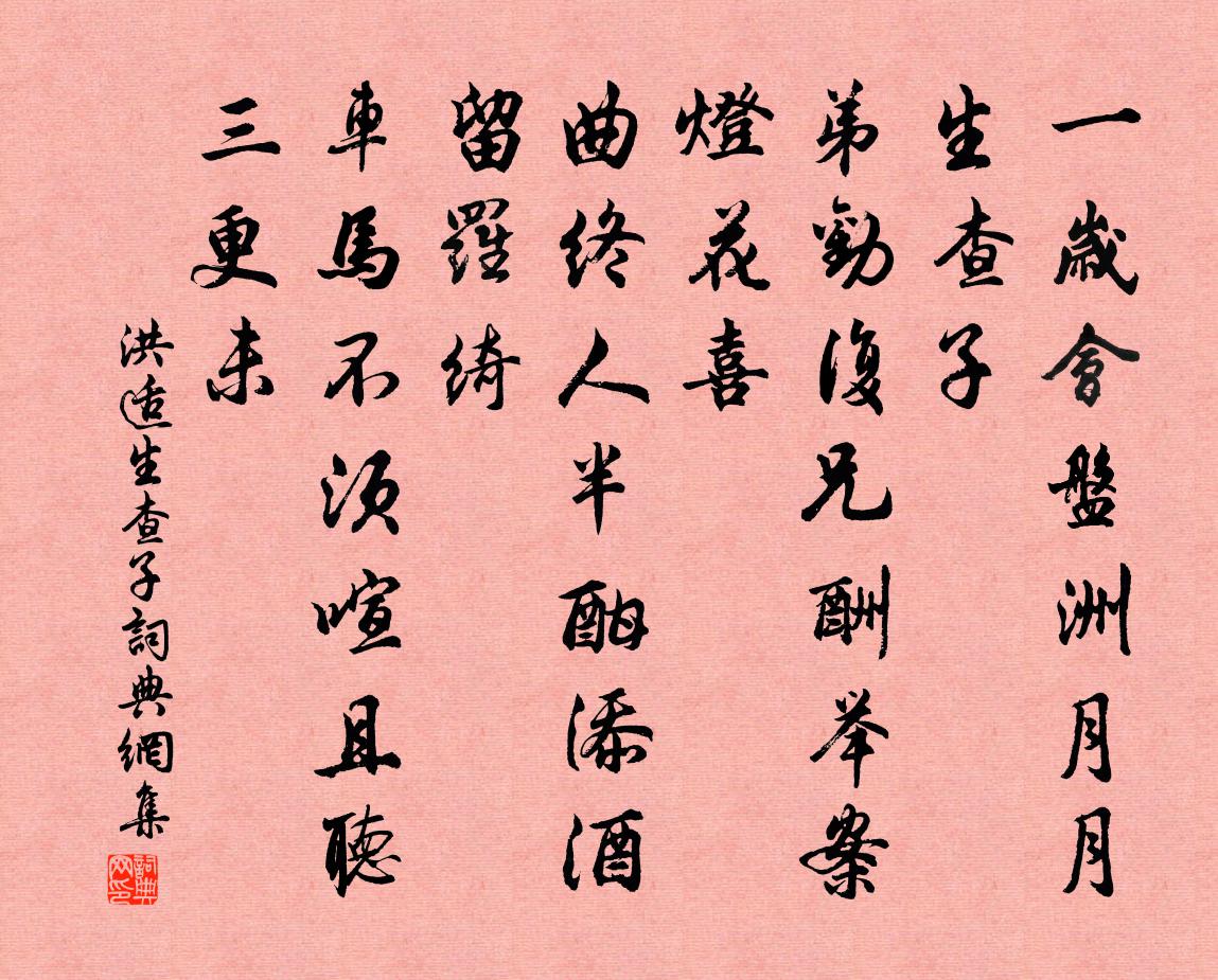 詩詞名句歷史字典書法欣賞書法字典國語詞典說文解字康熙字典古漢語字典標 題 作 者 詩 句 生查子作者:洪适 朝代:宋代生查子原文一歲會盤洲,月月生查子。弟勸復兄酬,舉案燈花喜。曲終人半酣,添酒留羅綺。車馬不須喧,且聽三更未。詩詞問答問:生查子的作者是誰?答:洪适問:生查子寫於哪個朝代?答:宋代問:生查子是什麼體裁?答:詞洪适生查子書法欣賞生查子書法作品詩詞推薦頌古八首釋雲〔宋代〕獨唱清新拍不同,寥寥千古意無窮。擬開眼向聲前聽,早被風吹別調中。曉過南宮聞太常清樂張濛〔唐代〕玉珂經禮寺,金奏過南宮。雅調乘清曉,飛聲向遠空。慢隨飄去雪,輕逐度來風。迥出重城裡,傍聞九陌中。應將梨楊億〔宋代〕繁花如雪早傷春,千樹封侯未是貧。漢苑漫傳盧橘賦,驪山誰識荔枝塵。九秋青女霜添味,五夜方諸月溜津。楚客和顏長官百詠客路朱繼芳〔宋代〕送窮不去奈窮何,山有荊榛水有波。萬物得時人自老,梁鴻頭白五噫歌。次韻奉酬致仕通直吳七丈上元所寄之什林亦之〔宋代〕空齊自合冷如灰,何物龍鍾似不才。日日讀書無處用,年年作客幾時回。君為諸老先生行,我在當初最後來。可忍贊前人第四子良漢周歲陳著〔宋代〕昨見初繃浴露兒,如今又滿一年期。山林深處壽高木,薇蕨清風生瑞芝。試取印來如異日,能將字認已多時。諸郎過隱者湖上所居權德輿〔唐代〕蝸舍映平湖,皤然一魯儒。唯將酒作聖,不厭谷名愚。兵法窺黃石,天官辨白榆。行看軟輪起,未可號潛夫。池上幽境白居易〔唐代〕裊裊過水橋,微微入林路。幽境深誰知,老身閒獨步。行行何所愛,遇物自成趣。平滑青盤石,低密綠陰樹。石上慶東原張養浩〔元代〕鶴立花邊玉,鶯啼樹杪弦,喜沙鷗也解相留戀。一個沖開錦川,一個啼殘翠煙,一個飛上青天。詩句欲成時,滿地一萼紅姜夔〔宋代〕古城陰。有官梅幾許,紅萼未宜簪。池面冰膠,牆腰雪老,雲意還又沈沈。翠藤共、閒穿徑竹,漸笑語、驚起臥沙觀石魚嗣劉忠順韻劉叔子〔宋代〕銜尾洋洋石上鐫,或依於藻或依蓮。夢占周室中興日,刻自唐人多歷年。隱見有時非強致,豐凶當歲必開先。太平題劉相公光德里新構茅亭李洞〔唐代〕野色迷亭曉,龍墀待押班。帶涎移海木,兼雪寫湖山。月白吟床冷,河清直印閒。唐封三萬里,人偃翠微間。憂關詣台先寄獻臣天休二學士宋庠〔宋代〕去國三年恨,還台九死餘。淒涼曾釜粟,感咽晏楹書。鮒勺懷窮轍,鷄棲整故車。惟當親益友,敘闊費漣如。頌古一百則釋正覺〔宋代〕岸眉橫雪,河目含秋。海口鼓浪,航舌駕流。撥亂之手,太平之籌。老趙州,老趙州,攪攪叢林卒未休。徒費工夫邊將唐求〔唐代〕三千護塞兒,獨自滯邊陲。老向二毛見,秋從一葉知。地寒鄉思苦,天暮角聲悲。卻被交親笑,封侯未有期。宿姚合宅寄張司業籍賈島〔唐代〕閒宵因集會,柱史話先生。身愛無一事,心期往四明。松枝影搖動,石磬響寒清。誰伴南齋宿,月高霜滿城。寓嘆陸游〔宋代〕江上霜風透弊袍,區區無奈簿書勞。衰遲始憶壯遊樂,仕宦更知歸臥高。人怪羊裘忘富貴,我從牛儈得賢豪。俗間題徐俞山居牟融〔唐代〕青山重疊巧裁攢,引水流泉夜激湍。嵐鎖岩扉清晝暝,雲歸松壑翠陰寒。不因李相門前見,曾向袁生畫裡看。老我寄江朝宗吳芾〔宋代〕相聚才經歲,分攜又許時。遣懷還有酒,排悶豈無詩。飲罷憑誰語,吟成只自知。願君憐此意,命駕莫遲遲。瞿唐峽陳謙〔宋代〕庸蜀諸羌水,荊吳萬里渾。不將崖約束,焉句壑崩奔。線引溫湯浦,觴浮雪水源。槎程疑欲盡,西望氣魂魂。名句推薦樓上黃昏欲望休,玉梯橫絕月中鉤李商隱《代贈二首》 濁酒不銷憂國淚,救時應仗出群才。秋瑾《黃海舟中日人索句並見日俄戰爭地圖》 和羞走,倚門回首,卻把青梅嗅。李清照《點絳唇·蹴罷鞦韆》 雲無心以出岫,鳥倦飛而知還。陶淵明《歸去來兮辭·並序》 春風得意馬蹄疾,一日看盡長安花。孟郊《登科後》 走馬西來欲到天,辭家見月兩回圓。岑參《磧中作》 兩人對酌山花開,一杯一杯復一杯。李白《山中與幽人對酌》 一人飛升,仙及雞犬。蒲松齡《聊齋志異·卷四·促織》 舊苑荒台楊柳新,菱歌清唱不勝春。李白《蘇台覽古》 上交不諂,下交不瀆佚名《易傳·繫辭傳下·第五章》