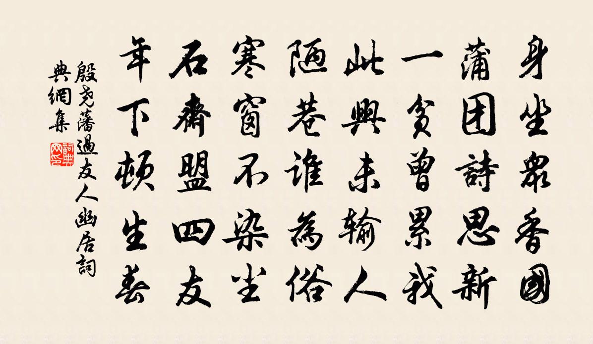 詩詞名句歷史字典書法欣賞書法字典國語詞典說文解字康熙字典古漢語字典標 題 作 者 詩 句 過友人幽居作者:殷堯藩 朝代:唐代過友人幽居原文身坐眾香國,蒲1~1團詩思新。一貧曾累我,此興未輸人。陋巷誰為俗,寒窗不染塵。石齋盟四友,年下頓生春。詩詞問答問:過友人幽居的作者是誰?答:殷堯藩問:過友人幽居寫於哪個朝代?答:唐代問:過友人幽居是什麼體裁?答:五律殷堯藩過友人幽居書法欣賞過友人幽居書法作品注釋全唐詩:卷492-4詩詞推薦送梁中砥入道從三茅許松豀張紹文〔宋代〕無意覓封侯,來從長史游。辭章唐韻度,人物晉風流。花影天壇午,松聲月澗秋。登臨盡詩境,分我半山不。梅兩絕洪咨夔〔宋代〕風霜搖落都廬盡,一點春回造化家。萬物成終又成始,須將艮體看梅花。郊廟歌辭。享太廟樂章。歆和佚名〔唐代〕崇禋已備,粢盛聿修。潔誠斯展,鍾石方遒。貞女峽韓愈〔唐代〕江盤峽束春湍豪,雷風戰鬥魚龍逃。懸流轟轟射水府,一瀉百里翻雲濤。漂船擺石萬瓦裂,咫尺性命輕鴻毛。永遇樂佚名〔宋代〕孤衾不暖,靜聞銀漏,敧枕難穩。細想多情,多才多貌,總是多愁本。而今幽會難成,佳期頓阻,只恁縈方寸。知酬駱侍御答詩戴叔倫〔唐代〕風傳畫閣空知曉,雨濕江城不見春。堆案繞床君莫怪,已經愁思古時人。傷春俞處俊〔宋代〕黏天芳草綠蒙茸,久客傷心望不窮。山色自隨人遠近,鶯聲只在水西東。獻韓平原生日開禧朝士〔宋代〕本是神仙服日華,而今癯瘁為王家。槐龍影轉朝方退,閒卻南園一院花。唐秘書省書目石刻李復〔宋代〕蓬萊龜高閣凌浮龜雲,天上龜圖龜奎壁明。榮河溫洛龜龍呈,魯壁汲冢科半行。森羅萬目分緯經,大官供烹集群英揚州雜詠七首晁補之〔宋代〕蜀岡茶味圖經說,不貢春芽向十年。未惜青青藏馬鬣,可能辜負大明泉。因曾相士寄韋南雄趙蕃〔宋代〕窈窕梅花嶺,風流燕寢香。如聞省條教,復道富篇章。近作凡幾首,新來無一行。因人問無量,並遣驗徵黃。贈俞碧岩體仁刊圖書方回〔宋代〕上古包羲卦初畫,五行之金刀為革。兩儀四象生□□,□初一圈為太極。八卦之上六十四,右乾左坤名曰易。因重飯牛圖王冕〔元代〕君不見百里奚飯牛而牛肥,胸中經緯無人知;又不見老甯戚時不時兮長嘆息。偶爾君臣稱際會,伯道相高非盛德。哭劉仲邍司馬光〔宋代〕昔醉金明渚,今來慧辯祠。當年笑相親,此日哭殊悲。天迥種原淨,風高草木衰。江梅靈氣在,泉下復相知。春日春陪韓簽虞丞解監修禊事即席中有蝦菜梨曹彥約〔宋代〕雨餘春水壓堤沙,柳未花飛蒲茁芽。清流激湍石佛寺,崇山峻岭野人家。大酉之山檀溪壑,春俗未改書成車。居夷觀書有感胡宏〔宋代〕一點銀蟾在碧空,千載堞廓夜玲瓏。回首昔日遨遊處,覺得分明是管中。多麗(七夕游蓮盪作)葛立方〔宋代〕破波光如鏡,三翼輕舟。對雨余、重岩疊嶂,何妨影墮清流。望芙蕖、渺然如海,張雲錦、掩映汀洲。出水奇姿,澠池強至〔宋代〕古邑人煙陝雒間,馬蹄車轍許誰閒。不堪曉雨妨行興,猶喜秋風慰客顏。老去稍知筋力倦,年來只益鬢毛斑。相如送賀某赴興化任陳起〔宋代〕壺山邈千里,旌旗拂搖空。是邦足文物,教宜先泮宮。嗟余病十載,置身藥裹中。追送不能遠,望望晝錦紅。多景樓傅夢得〔宋代〕自來京口足清游,天下聞名只此樓。山結人愁成北固,江和客淚向東流。痕留很石傳千古,望斷中原知幾州。有景名句推薦南浦淒淒別,西風裊裊秋。白居易《南浦別》 雲間連下榻,天上接行杯。李白《與夏十二登岳陽樓》 日出入安窮?時世不與人同。佚名《日出入》 遙知湖上一樽酒,能憶天涯萬里人。歐陽修《春日西湖寄謝法曹歌》 民之無良,相怨一方,受爵不讓,至於己斯亡。荀子《荀子·儒效》 早歲那知世事艱,中原北望氣如山。陸游《書憤五首·其一》 山桃紅花滿上頭,蜀江春水拍山流。劉禹錫《竹枝詞·山桃紅花滿上頭》 君問歸期未有期,巴山夜雨漲秋池。李商隱《夜雨寄北》 嶺樹重遮千里目,江流曲似九迴腸。柳宗元《登柳州城樓寄漳汀封連四州》 家有常業,雖飢不餓;國有常法,雖危不亡。韓非及後人《韓非子·飾邪》