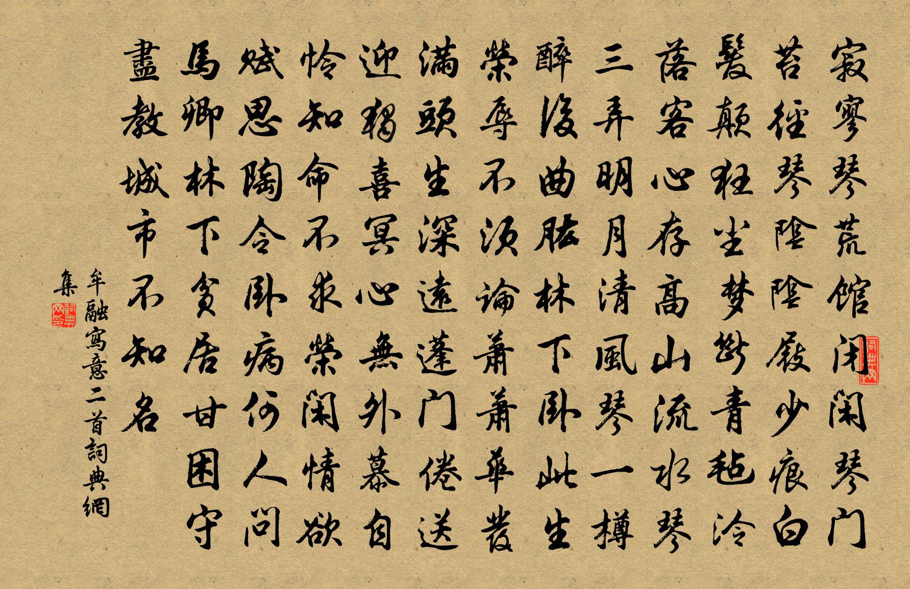 詩詞名句歷史字典書法欣賞書法字典國語詞典說文解字康熙字典古漢語字典標 題 作 者 詩 句 寫意二首作者:牟融 朝代:唐代寫意二首原文寂寥琴荒館閉閒琴門,苔徑琴陰陰屐少痕。白髮顛狂塵夢斷,青氈泠落客心存。高山流水琴三弄,明月清風琴一樽。醉後曲肱林下臥,此生榮辱不須論。蕭蕭華發滿頭生,深遠蓬門倦送迎。獨喜冥心無外慕,自憐知命不求榮。閒情1/1欲賦思陶令。臥病何人問馬卿。林下貧居甘困守,盡教城市不知名。詩詞問答問:寫意二首的作者是誰?答:牟融問:寫意二首寫於哪個朝代?答:唐代問:寫意二首是什麼體裁?答:七律牟融寫意二首書法欣賞寫意二首書法作品注釋全唐詩:卷467-34詩詞推薦仲夏田家韓維〔宋代〕仲夏農務急,老壯紛盈疇。上天無愆沴,登我蠶與麰。晨興腰鐮出,子婦向田頭。綠樹繞阡陌,當晝豈暇休。柔絲偈頌一百三十六首釋惟一〔宋代〕一月復一月,此月又過五。兩輪日月何奔忙,百年彈指如虛度。物不遷,遷知否。不是佛,亦非祖。流不不腐,戶三字令歐陽炯〔唐代〕春欲盡,日遲遲,牡丹時。羅幌卷,翠簾垂。彩箋書,紅粉淚,兩心知。人不在,燕空歸,負佳期。香燼落,枕函次韻林楙南秋興見寄林季仲〔宋代〕秋陽晃朗秋江前,秋山崷崒飛鳥邊。待扶仙人九節杖,去采玉井千葉蓮。一丘一壑不在我,或用或舍其如天。故人句諶祜〔宋代〕詩到二南風化在,句流三謝語言工。又聞邊報四首劉克莊〔宋代〕一車兩馬不煩驂,草地蠕行到極南。春燕無棲各依木,佛狸有使輒求柑。按中軍請東陽徒,獲左車誰北面參。憑語戊戌生日二首方回〔宋代〕客舍逢生日,鄰家送壽星。循彝須答禮,恃熟莫忘形。把筆遲賡和,開樽共醉醒。五兒一隨侍,心竊愧椿庭。大麥行杜甫〔唐代〕大麥乾枯小麥黃,婦女行泣夫走藏。東至集壁西梁洋,問誰腰鐮胡與羌。豈無蜀兵三千人,部領辛苦江山長。安得陳信民求詩項安世〔宋代〕子合陳平甫,吾當項信求。食兵吾不愧,門轍子方貧。老眼觀斯世,多情尚若人。相過無遠近,無不計冬春。憶江南·多少恨李煜〔五代〕多少恨,昨夜夢魂中。還似舊時游上苑,車如流水馬如龍。花月正春風。晦機釋大觀〔宋代〕舌上雷轟一默間,纖塵不動鼓波瀾。拈花會上人無數,輸與頭陀一破顏。萬侍郎母夫人輓詩虞儔〔宋代〕閨壺高風在,鄉閭美事傳。寧須伯仁長,更覺壽昌賢。祿養酬初志,恩封慰暮年。侍郎官已貴,遽返閬昆仙。寄懷曾口寺文英大師齊己〔唐代〕著紫袈裟名已貴,吟紅菡萏價兼高。秋風曾憶西遊處,門對平湖滿白濤。石湖行春橋顧逢〔宋代〕十里湖光漾碧霄,山雲吞吐筆難描。宜涼宜月猶宜雪,何獨行春過此橋。再和潛師蘇軾〔宋代〕化工未議蘇群槁,先向寒梅一傾倒。江南無雪春瘴生,為散冰花除熱惱。風清月落無人見,洗妝自趁霜鍾早。惟有呈諸先輩韓維〔宋代〕謝事歸來老白頭,杜門終日絕營求。顧慚義禮非先得,竊幸英豪許並游。介壽又逢春酒熟,貽詩常駭暗珠投。自慚和高仲本喜相見黃庭堅〔宋代〕雨氏南浦曾相對,雪滿荊州喜再逢。有子才如不羈馬,知君心是後凋松。閒尋書冊應多味,老傍人門似更慵。何日望思台強至〔宋代〕一朝木偶發深宮,父子恩隳晻曖中。不見戾園埋恨處,至今草木有悲風。小遊仙二十首楊維楨〔元代〕元君賜覲素華台,酒飲龍胎五色醅。醉啖蟠桃三百顆,手懷遺核大如杯。女郎雙雙白玉床,對博宛在橘中央。青城華嚴頂劉光第〔清代〕聞說金剛台外地,夜燈浮上獨茲峰。老猿抱子求僧飯,閒客看人打佛鐘。下界雲霞招杖屨,夕陽紅翠動杉松。風吹名句推薦孤芳一世,供斷有情愁,消瘦損,東陽也,試問花知否曹組《驀山溪·梅》 北窗高臥,莫教啼鳥驚著。辛棄疾《念奴嬌·賦雨岩》 梅須遜雪三分白,雪卻輸梅一段香。盧鉞《雪梅·其一》 綠兮絲兮,女所治兮。我思古人,俾無訧兮!佚名《綠衣》 秋娘渡與泰娘橋,風又飄飄,雨又蕭蕭。蔣捷《一剪梅·舟過吳江》 鳥銜野田草,誤入枯桑里。李白《樹中草》 志不勵,則士不死節;士不死節,則眾不戰。尉繚《尉繚子·戰威》 煢煢白兔,東走西顧。佚名《古艷歌》 莫道不銷魂,簾卷西風,人比黃花瘦。李清照《醉花陰·薄霧濃雲愁永晝》 水國蒹葭夜有霜,月寒山色共蒼蒼。薛濤《送友人》