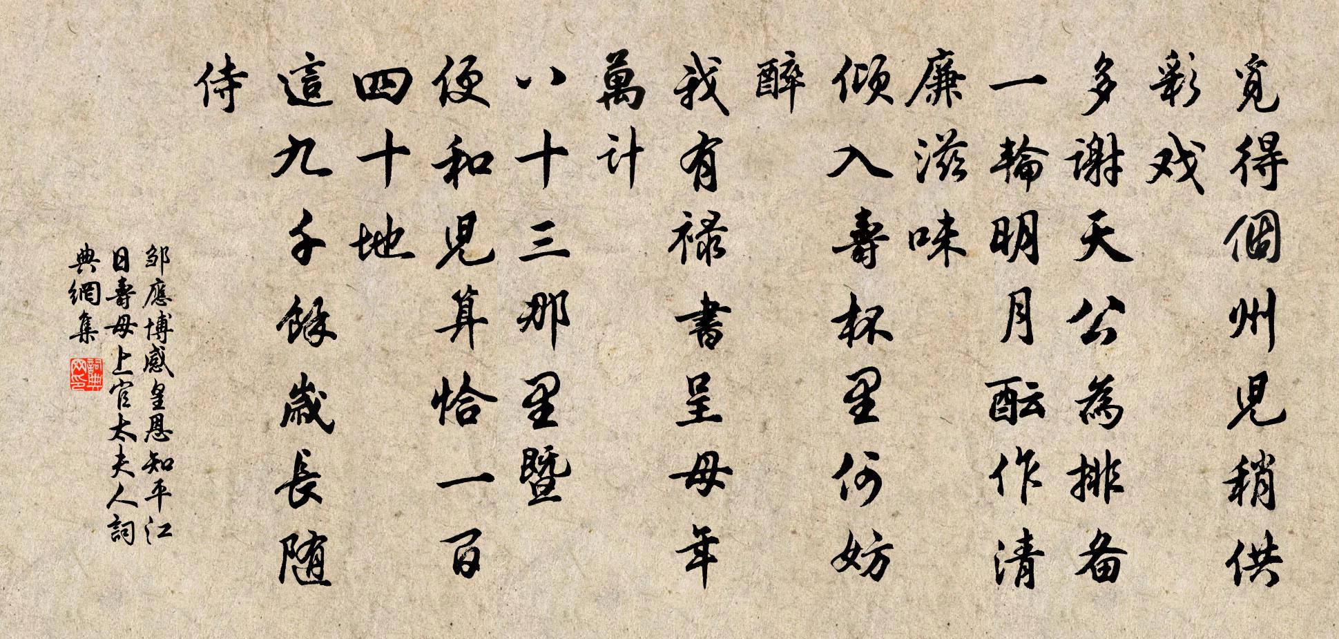 詩詞名句歷史字典書法欣賞書法字典國語詞典說文解字康熙字典古漢語字典標 題 作 者 詩 句 感皇恩(知平江日壽母上官太夫人)作者:鄒應博 朝代:宋代原文覓得個州兒,稍供彩戲。多謝天公為排備。一輪明月,醞作清廉滋味。傾入壽杯里,何妨醉。我有祿書,呈母年萬計。八十三那裡暨。便和兒算,恰一百四十地。這九千餘歲,長隨侍。詩詞問答問:《感皇恩(知平江日壽母上官太夫人)》的作者是誰?答:鄒應博問:該詩寫於哪個朝代?答:宋代問:該詩是什麼體裁?答:詞書法欣賞感皇恩(知平江日壽母上官太夫人)書法作品詩詞推薦江神子·送元濟之歸豫章辛棄疾〔宋代〕亂雲擾擾水潺潺。笑溪山。幾時閒。更覺桃源,人去隔仙凡。萬壑千岩樓外雪,瓊作樹,玉為欄。倦遊回首且加餐次姚吏隱惠詩韻楊公遠〔宋代〕相逢一笑信前緣,聞道先吾豈較年。灑落襟期良夜月,沖融氣宇小春天。喜評曲直人間事,懶問肥磽郭外田。忙裡八詠樓丁逢〔宋代〕檻外溪山縹緲樓,共看雨歇漲痕收。天開圖畫無窮態,峽束盤渦自在流。賦詠偶然休弔古,登臨政爾可銷憂。邛徠懷舊詩 傷劉渢沈約〔南北朝〕處和無近累。天然有勝質。蕭瑟負高情。耿介懷秋實。義貴良為重。蘭摧非所恤。一罷平生言。寧知攜手日。再次前韻二首鄧肅〔宋代〕蕭條門巷半萊高,杯酒田間亦自陶。採栗久要工部拙,騎鯨偶廁謫仙豪。狂波故作風雷噫,逸興何妨日月高。勝景為謝氏賦流芳衛宗武〔宋代〕斯文一脈可傳家,囊帛籯金不足夸。須信詩書涵潤澤,自今庭戶發英華。謝蘭輝映方生玉,竇桂香含不斷花。不但青渠追和宋金都壁間韻洪咨夔〔宋代〕短亭放腳小軒渠,從險趨平本一塗。掌上煙川三百里,蜀都風物似吳都。送謝耘之無為趙師秀〔宋代〕雙旌雖有舊,道路亦勞形。不用攜書尺,惟當帶酒瓶。柘空淮繭白,梅近楚秧青。爾以親為請,仁人豈厭聽。病中早春白居易〔唐代〕今朝枕上覺頭輕,強起階前試腳行。膻膩斷來無氣力,風痰惱得少心情。暖銷霜瓦津初合,寒減冰渠凍不成。唯有次沈節推送春韻二首杜范〔宋代〕一年春事逐飛蓬,燕語千愁訴未通。不竹誰家深院落,捲簾準擬納薰風。丹灶山陶弼〔宋代〕羽客朝元地,遣壇古寺中。煉成丹龜在,騎去鶴巢空。前以詩答韓三子華後得其簡因敘下情梅堯臣〔宋代〕前者報君詩,妄說良有以。昔予在京師,多為人所詆。短章然無工,實未甘藝比。因君有過褒,聊且發憤悱。何言謝洞山石台遠來訪別蘇轍〔宋代〕竄逐深山無友朋,往還但有兩三僧。共游渤澥無邊處,扶出須彌最上層。未盡俗緣終引去,稍諳真際自虛澄。坐令柳梢青張鎡〔宋代〕一望清溪。兩堤翠陰,半紙新詩。涼滿衣裳,香生筆硯,風動窗扉。月明撐過船兒。載龍玉、雙娥對吹。竹外山亭壽利州趙漕李曾伯〔宋代〕天稟銀河一派清,藹然中外播休聲。金城方略今充國,斜谷規模舊孔明。屈久轡絲勤使指,再須班筍著宗英。九重列子引古語佚名〔先秦〕生相憐。死相捐。人不婚宦。 * 失半。人不衣食。君臣道息。又次韻五首張嵲〔宋代〕行盡炎荒路向東, * 戍鼓夜逢逢。惜無王朔同登望,騎氣應須似白虹。石壕吏杜甫〔唐代〕暮投石壕村,有吏夜捉人。老翁逾牆走,老婦出門看。吏呼一何怒,婦啼一何苦。聽婦前致詞,三男鄴城戍。一男浣溪沙·二月春花厭落梅晏幾道〔宋代〕二月春花厭落梅。仙源歸路碧桃催。渭城絲雨勸離杯。歡意似雲真薄倖,客鞭搖柳正多才。鳳樓人待錦書來。立春施樞〔宋代〕彩勝飄春上鬢蓬,倚欄一笑問東風。青青柳眼梅花面,才染陽和便不同。名句推薦劍河風急雪片闊,沙口石凍馬蹄脫。岑參《輪台歌奉送封大夫出師西征》 酒逢知己飲,詩向會人吟。佚名《增廣賢文·上集》 興天下之利,除天下之害。墨子《墨子·12章 尚同(中)》 庭院深深深幾許,楊柳堆煙,簾幕無重數。歐陽修《蝶戀花·庭院深深深幾許》 松間沙路淨無泥,瀟瀟暮雨子規啼。蘇軾《浣溪沙·游蘄水清泉寺》 為報今年春色好。花光月影宜相照。李清照《蝶戀花·上巳召親族》 江上小堂巢翡翠,苑邊高冢臥麒麟。杜甫《曲江二首》 應知早飄落,故逐上春來。何遜《詠早梅 / 揚州法曹梅花盛開》 湖南為客動經春,燕子銜泥兩度新。杜甫《燕子來舟中作》 日晚江南望江北,寒鴉飛盡水悠悠。嚴維《丹陽送韋參軍》