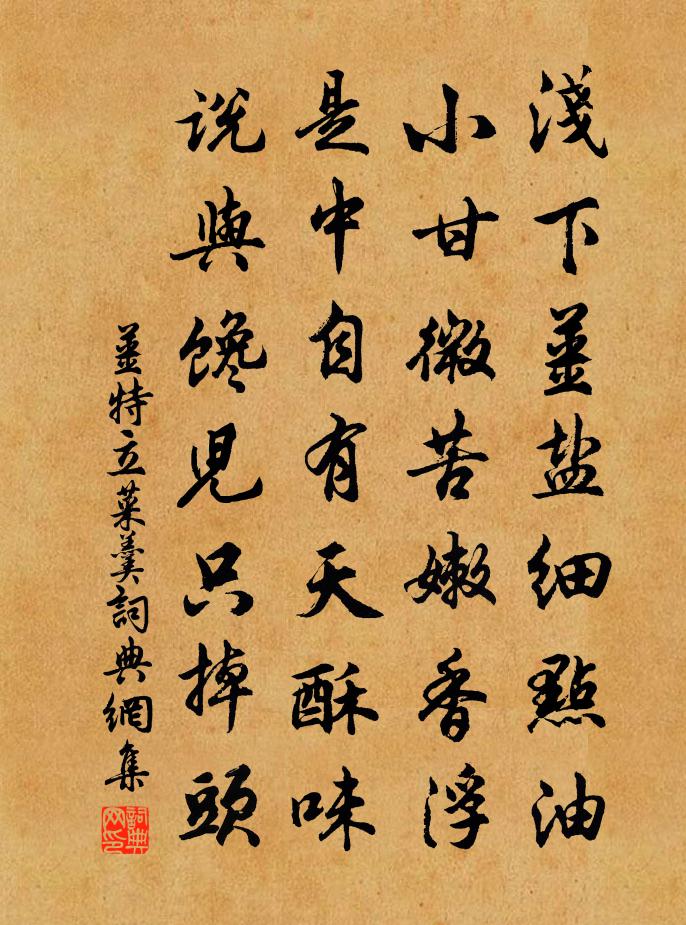 詩詞名句歷史字典書法欣賞書法字典國語詞典說文解字康熙字典古漢語字典標 題 作 者 詩 句 菜羹作者:姜特立 朝代:宋代菜羹原文淺下姜鹽細點油,小甘微苦嫩香浮。是中自有天酥味,說與饞兒只掉頭。詩詞問答問:菜羹的作者是誰?答:姜特立問:菜羹寫於哪個朝代?答:宋代姜特立菜羹書法欣賞菜羹書法作品詩詞推薦清遠店范成大〔宋代〕女僮流汗逐氈軿,雲在淮鄉有父兄。屠婢殺奴官不問,大書黥面罰猶輕。詠竹袁燮〔宋代〕此君林下靜無塵,苗裔生來便逸群。頭角嶄然圓玉峙,養成直節要凌雲。游黃山石應孫〔宋代〕山川形勝雄江東,九華輝映天都峰。傳聞早已湯胸臆,恨不插翼長相從。朅來隨牒官秋浦,城郭賓士厭塵土。絜家人月圓劉因〔元代〕自從謝病修花史,天意不容閒。今年新授,平章風月,檢校雲山。門前報導,麴生來謁,子墨相看。先生正爾,天游杭州佛日山淨慧寺秦觀〔宋代〕五里喬松徑,千年古道場。泉聲與嵐影,收拾入僧房。同趙侍御巴陵早春作張說〔唐代〕江上春來早可觀,巧將春物妒餘寒。水苔共繞留鳥石,花鳥爭開鬥鴨欄。佩勝芳辰日漸暖,然燈美夜月初圓。意隨句錢昭度〔宋代〕荷揮萬朵玉如意,蟬弄一聲金錯刀。水調歌頭(趙運判師屷生日)魏了翁〔宋代〕萬里蜀山險,難似上青天。誰知間有,人心之險甚山川。賴得皇華星使,滿載春風和氣,來自鑑湖邊。要識方寸地春夜樊川竹亭陪諸同年宴項斯〔唐代〕相知皆是舊,每恨獨游頻。幸此同芳夕,寧辭倒醉身。燈光遙映燭,萼粉暗飄茵。明月分歸騎,重來更幾春。諸暨道中五首葛紹體〔宋代〕寒雨路從岩澗出,晴天才見越山川。誰憐昨日經行地,回首蒼茫起暮煙。諸公皆和詩再用韻並屬湛挺之七首趙蕃〔宋代〕翰墨平生友,江山數面親。誦騷悲楚國,訪古失秦民。丘壑豈無趣,塵埃空此身。風行思數數,糧食厭頻頻。菩薩蠻趙長卿〔宋代〕日高猶戀珊瑚枕。羞紅不忿花如錦。雙燕運芹泥。燕歸人未歸。縱饒梳洗罷。朱戶何曾跨。寂寞小房櫳。回文和淚與伯勤、子文幼楚同登南溪奇觀,戲道傍群兒楊萬里〔宋代〕蒙松睡眼熨難開,曳杖緣溪啄紫苔。偶見群兒聊與戲,布衫青底捉將來。生米市盡處有寺名演義有二物且得甘叔異鄧南趙蕃〔宋代〕往來屢覓肩吾釣,八十初逢演義僧。香爇黃連雲細細,薜看石柱帔層層。何妨杖策往幽步,頻念竹爐眠曲肱。海內頌古五十三首釋文禮〔宋代〕扇子分明都破了,鹽官卻又索犀牛。須知侍者難開口,無可還他即便休。依韻答惠勤上人梅堯臣〔宋代〕釋子本樂靜,宜不事物牽。我慚姑蘇守,復賞杼山然。三歲與之別,其學已增前。忽此有來贈,老拙謬耽研。禽言十詠著新脫故姚勉〔宋代〕繰車欲動蠶春暮,水足秧青行白鷺。著新脫故山禽呼,也似催人闊耕布。著新脫故也自奇,闊耕闊布也自宜。冬苗送楊奉禮蘇軾〔宋代〕譜牒推關右,風流出靖恭。時情任險陂,家法故雍容。南去河千頃,余惟酒一鍾。更誰哀老子,令得放疏慵。春居即事薛能〔唐代〕雲密露晨暉,西園獨掩扉。雨新臨斷火,春冷著單衣。榆莢奔風健,蘭芽負土肥。交親不是變,自作寄書稀。次韻德孺惠貺秋字之句黃庭堅〔宋代〕少日才華接貴游,老來忠義氣橫秋。未應白髮如霜草,不見丹砂似箭頭。顧我今成喪家狗,期君早作濟川舟。漢家名句推薦泥融飛燕子,沙暖睡鴛鴦。杜甫《絕句二首》 霜雪兮漼溰,冰凍兮洛澤。王逸《九思》 低頭弄蓮子,蓮子清如水佚名《雜曲歌辭·西洲曲》 帝王之道,以寬仁為大。令狐德棻《周書·本紀·卷四》 人生不滿百,常懷千歲憂。佚名《增廣賢文·上集》 浮雲終日行,遊子久不至。杜甫《夢李白二首·其二》 旅客三秋至,層城四望開。杜審言《登襄陽城》 劍花寒,夜坐歸心壯,又是他鄉。張可久《滿庭芳·客中九日》 國家將興,必有禎祥;國家將亡,必有妖孽。子思《中庸·第二十四章》 杯酒相延,今夕不應慳。陳著《江城子·中秋早雨晚晴》