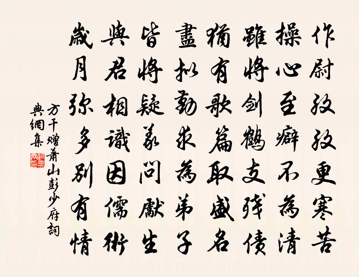 詩詞名句歷史字典書法欣賞書法字典國語詞典說文解字康熙字典古漢語字典標 題 作 者 詩 句 贈蕭山彭少府作者:方乾 朝代:唐代贈蕭山彭少府原文作尉孜孜更寒苦,操心至癖不為清。雖將劍鶴支殘債,猶有歌篇取盛名。盡擬勤求為弟子,皆將疑義問先生。與君相識因儒術,歲月彌多別有情。詩詞問答問:贈蕭山彭少府的作者是誰?答:方乾問:贈蕭山彭少府寫於哪個朝代?答:唐代問:贈蕭山彭少府是什麼體裁?答:七律方乾贈蕭山彭少府書法欣賞贈蕭山彭少府書法作品注釋全唐詩:卷650-53詩詞推薦題城南書院三十四詠張栻〔宋代〕移得幽蘭幾本來,竹籬深處手栽培。芬芳不必紉為佩,月白風清取次開。葛覃佚名〔先秦〕葛之覃兮,施於中谷,維葉萋萋。黃鳥于飛,集於灌木,其鳴喈喈。葛之覃兮,施於中谷,維葉莫莫。是刈是濩,慶元六年七月至儋耳問前守之政改元四年罷歸曾豐〔宋代〕小詘南遊得大觀,天函無際碧相環。盤黎錯{僚亻換豸}周遭海,亘縣綿州詭譎山。自幸賞音毛潁下,相爭充數錦送陽翟張主簿之任獨孤及〔唐代〕舊聞陽翟縣,西接鳳高山。作吏同山隱,知君處劇閒。少年當效用,遠道豈辭艱。遲子揚名後,方期彩服還。踏莎行(戊寅秋客中懷錢塘舊遊)柴元彪〔宋代〕淡柳平蕪,亂煙疏雨。雁聲叫徹蘆花渚。亭前落葉又西風,斷送離懷無著處。切切歸期,盈盈尺素。斷魂正在西興怨曲二首張耒〔宋代〕祖席駐征橈,開帆覆信潮。隔筵桃葉泣,吹管杏花飄。船去鷗飛閣,人歸鹿上橋。別離惆悵淚,江鷺宿紅蕉。出遲吳融〔唐代〕園密花藏易,樓深月到難。酒虛留客盡,燈暗遠更殘。麝想眉間印,鴉知頂上盤。文王之囿小,莫惜借人看。【雙調】新水令_楚台雲雨會關漢卿〔元代〕楚台雲雨會巫峽,赴昨宵約來的期話。樓頭棲燕子,庭院已聞鴉,料想他家,收針指晚妝罷。【喬牌兒】款將花徑春日寄懷李商隱〔唐代〕世間榮落重逡巡,我獨丘園坐四春。縱使有花兼有月,可堪無酒又無人。青袍似草年年定,白髮如絲日日新。欲逐哭王注司空曙〔唐代〕已嘆漳濱臥,何言駐隙難。異才傷促短,諸友哭門闌。古道松聲暮,荒阡草色寒。延陵今葬子,空使魯人觀。寄呈檢正徐侍郎宋伯仁〔宋代〕紋愀一著響新棋,驚起英雄睡足時。南渡欲恢前漢業,北窗誰戀晚唐詩。熬波滄海徒勞爾,舉酒青天欲問之。吾道壽徐意一參政方蒙仲〔宋代〕呂氏早皆期正獻,范家晚竟相忠宣。不成二十年聲望,久坐難兄一舊氈。齋前獨坐戲作陸游〔宋代〕閉戶學僧坐,頹然遺世情。虛窗鴿飛影,枯葉犬行聲。雪擁杉灰暖,雲垂紙帳明。清饞不可耐,一笑聽華鯨。冬日(一作中)書懷寄惟真大師李中〔唐代〕自別吾師後,風騷道甚孤。雪霜侵鬢髮,音信隔江湖。擾擾悲時世,悠悠役夢途。向公期盡節,多病怕傾壺。賤跡瑣寒窗(壽歐陽教授)彭正大〔宋代〕千里儒流,稱觴此際,梅花三度。書台最上,健羨一翁如許。問吳江、別來舊人,當時折柳憑誰語。但春在芹宮,積雪為小山劉昚虛〔唐代〕飛雪伴春還,春庭曉自閒。虛心應任道,遇賞遂成山。峰小形全秀,岩虛勢莫攀。以幽能皎潔,謂近可循環。孤影鄭仲理送行六首趙蕃〔宋代〕溪山廓廓眼增明,鷗鷺依依舊有盟。所恨登高臨賦處,卻嗟我友不同行。送曹之才游天目山連文鳳〔宋代〕突兀雙峰曉色分,瘦筇支足上崑崙。雷聲俯聽嬰兒語,石勢平看駿馬奔。故國山川千古在,前朝人物幾家存。登臨雜詩李復〔宋代〕高松懷正氣,挺特入空碧。短棘無直枝,千鉤未成尺。松生倚雲岡,棘散傍道側。道側侵行人,牽衣去不得。絲蔓賜崔日知往潞州李隆基〔唐代〕潞國開新府,壺關寵舊林。妙旌循吏德,持悅庶氓心。禮樂中朝貴,神明列郡欽。揚風非贈扇,易俗是張琴。藩鎮名句推薦松葉堪為酒,春來釀幾多。張九齡《答陸澧》 楊花榆莢無才思,惟解漫天作雪飛。韓愈《晚春》 狂風落盡深紅色,綠葉成陰子滿枝。杜牧《悵詩》 吾所以有大患者,為吾有身,及吾無身,吾有何患?老子《老子·道經·第十三章》 古來存老馬,不必取長途。杜甫《江漢》 謗書盈篋不復辯,脫身來看江南山。謝逸《送董元達》 君子惜名,小人愛身。來俊臣《羅織經·保身卷第七》 離宮絕曠,身體摧藏,志念沒沉,不得頡頏。王昭君《怨詞》 坤至柔而動也剛,至靜而德方佚名《易傳·文言傳·坤文言》 誰家秋院無風入?何處秋窗無雨聲?曹雪芹《代別離·秋窗風雨夕》