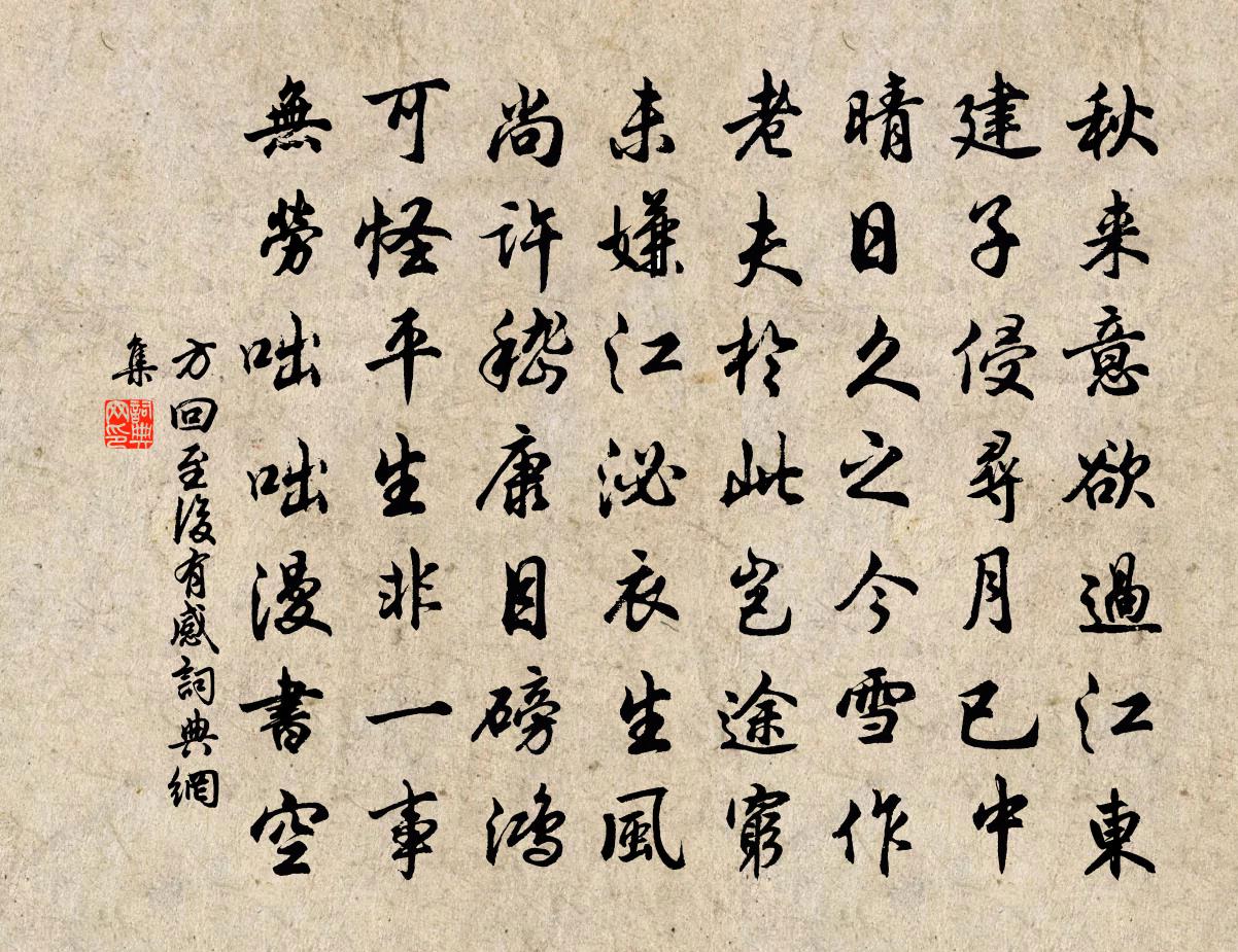 詩詞名句歷史字典書法欣賞書法字典國語詞典說文解字康熙字典古漢語字典標 題 作 者 詩 句 至後有感作者:方回 朝代:宋代至後有感原文秋來意欲過江東,建子侵尋月已中。晴日久之今雪作,老夫於此豈途窮。未嫌江泌衣生風,尚許嵇康目磅鴻。可怪平生非一事,無勞咄咄漫書空。詩詞問答問:至後有感的作者是誰?答:方回問:至後有感寫於哪個朝代?答:宋代方回至後有感書法欣賞至後有感書法作品詩詞推薦宿採石黃庶〔宋代〕秋風宿兼葭,花落岩霜雪。江山古興廢,荊棘壘出沒。水收鳧雁聲,夜靜寒籟發。漁舟自來去,笑語載明月。詩形贈三局能師二絕蘇轍〔宋代〕得失從來似偶然,因師聊復問行年。此生竟墮陰陽數,方信修行力未全。旅食江乾秋復春,歸耕未遂不勝貧。憑師清明前呈文幾衛宗武〔宋代〕此月才過禊事修,芳辰冉冉逝如流。牡丹開了寒應盡,燕子歸來春又休。衰鬢難將新綠染,顰眉豈為落紅愁。勞生送任畹及第歸蜀中覲親姚合〔唐代〕子規啼欲死,君聽固無愁。闕下聲名出,鄉中意氣游。東川橫劍閣,南斗近刀州。神聖題前字,千人看不休。樗高操王令〔宋代〕崇崇北丘,其上有樗。原校:遠者以為梁,或者爭以柱。就而睨之,曾無事於欂櫨。嗚呼木乎,其我於遠者歟。元豐己未三院東閣作元豐戊午夏予尹京治陳蘇頌〔宋代〕吏議推窮舊話言,畏途迢遞冒風瀾。兩詞罷對文移絕,一室常眠枕席寒。鬱郁久居人共嘆,皇皇求義我知難。誰將長憶乍能言邵雍〔宋代〕長憶乍能言,朝游父母前。方行初下膝,既老遂華顛。在昔四五歲,於今六十年。卻看兒女戲,又喜又潸然。嵩山十志十首倒景台盧鴻一〔唐代〕天門豁兮仙台聳,傑屹崒兮零澒涌。窮三休兮曠一觀,忽若登崑崙兮中期汗漫仙。聳天關兮倒景台,鯊顥氣兮軼囂過嚴子陵釣台二首張浚〔宋代〕中興自是還明主,訪舊胡為屬老臣。從古風雲由際會,歸歟聊復養吾真。留山間種藝十絕劉克莊〔宋代〕羞與春華艷冶同,殷勤培溉待秋風。不須牽引淵明比,隨分籬邊要幾叢。贈寫真劉敏叔秀才二首楊萬里〔宋代〕冰監傳神苦未工,傳來恰恰五秋風。又將老醜形骸子,般入劉家畫苑中。老柏三首陳師道〔宋代〕歲月那能記,風霜亦飽經。槁乾仍故節,潤澤出新青。色與江波共,聲留靜夜聽。輝輝垂重露,點點綴流螢。餞光祿兩張卿退居呂溱〔宋代〕壯爾盡忠力,耆年保素心。東門脫圭組,南國傲雲林。水石排清景,簷楹入翠院。雜花春瑩酒,脆葉夜驚禽。竹月書懷王之望〔宋代〕百年胡為哉,萬事聊復爾。功名早有意,貧賤昔所恥。歲月忽嗟跎,少壯何足恃。身外非我有,毫髮不可致。惟有送李植侍御姚合〔唐代〕新地無邪觸,空林獬豸歸。誰知隴山鳥,長繞玉樓飛。風雨依山急,雲泉入郭微。無同昔年別,別後寄書稀。避地桂陽山門招友人晚飲吳可〔宋代〕荒城住行李,故人亦淹留。稍遷墟丘間,愛此石泉幽。長夏晴復雨,風氣如清秋。開樽茅茨下,焉能消百憂。客懷春日幽居示仲固彥沖十絕胡寅〔宋代〕紅含宿雨兩三枝,淨插銅瓶浥注之。不是靈芸初一見,也非迷路武陵時。寄題密州蘇學士快哉亭太史雲此城之西北送客文同〔宋代〕出城送客客未來,主人到此先徘徊。地臨濰水極清曠,每為送客雙眼開。客來既坐歌管作,紅袖勸酒無停杯。主人頌古三十八首釋慧方〔宋代〕日面月面,頭頭出現。捏聚放開,成團萬片。頌古一百則釋正覺〔宋代〕抗力霜雪,平步雲霄。下惠黜國,相如過橋。蕭曹謀略能成漢,巢許身心俗避堯。寵辱若驚深自信,真情參跡混漁名句推薦知者順時而謀,愚者逆理而動范曄《後漢書·列傳·朱馮虞鄭周列傳》 宴爾新婚,以我御窮。佚名《谷風》 半生已分孤眠過,山枕檀痕涴。納蘭性德《虞美人·曲闌深處重相見》 罪己宜苛,人憐不致大害。來俊臣《羅織經·保身卷第七》 君子處小人,必平其氣以待之,不可稍形激切也。王永彬《圍爐夜話·第三三則》 憶共人人睡魂蝶亂,夢鸞孤。趙長卿《更漏子·燭消紅》 夫以奢侈之君,御好淫僻之民,欲國無亂,不可得也。墨子《墨子·06章 辭過》 遠與君別者,乃至雁門關。江淹《古離別》 漢家天子今神武,不肯和親歸去來。王之渙《涼州詞二首》 長安陌上無窮樹,唯有垂楊綰別離。劉禹錫《楊柳枝詞九首》