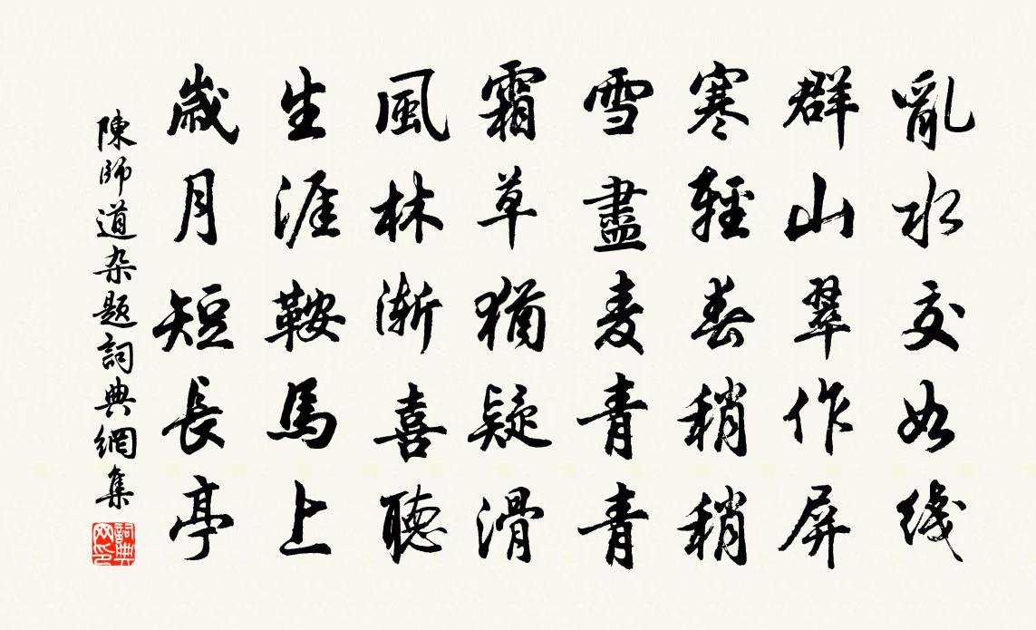 詩詞名句歷史字典書法欣賞書法字典國語詞典說文解字康熙字典古漢語字典標 題 作 者 詩 句 雜題作者:陳師道 朝代:宋代雜題原文亂水交如線,群山翠作屏。寒輕春稍稍,雪盡麥青青。霜草猶疑滑,風林漸喜聽。生涯鞍馬上,歲月短長亭。詩詞問答問:雜題的作者是誰?答:陳師道問:雜題寫於哪個朝代?答:宋代問:陳師道的名句有哪些?答:陳師道名句大全陳師道雜題書法欣賞雜題書法作品詩詞推薦續八詠千年增舊觀唐仲友〔宋代〕增舊觀,舊觀已雲美。棟宇未翬飛,賢侯為興起。昔時兮清賞,昔日兮清文。揮弦兮歸雁,隱几兮浮雲。八篇合綺寄袁校書(一作袁都校書)許渾〔唐代〕擾擾換時節,舊山琪樹陰。猶乖清漢志,空負白雲心。廣陌埃塵遠,重門管吹深。勞歌極西望,芸省有知音。宿永睦將口香積院滿山皆松檜聲二首張嵲〔宋代〕雲峰幾萬疊,何處見家山。此日無窮意,悠然獨倚欄。次韻太守向公登樓眺望二首秦觀〔宋代〕茫茫汝水抱城根,野色偷春入燒痕。千點湘妃枝上淚,一聲杜宇水邊魂。遙憐鴻隙陂穿路,尚想元和賊負恩。粉堞豐城送成父弟還玉山三首趙蕃〔宋代〕溪上同舟送,江頭獨步歸。秋風方落木,客路要添衣。故舊詢安否,形容話瘠肥。吾行猶許遠,爾去復誰依。憶盈肥題玉女池二首王山〔宋代〕浮世繁華一夢休,登臨因憶昔年游。人歸依舊野花笑,玉冷幾經墳樹秋。風月過情須感慨,江山多恨即遲留。如今侄孫景文多女賀其得雄戴復古〔宋代〕陰極一陽轉,君家氣數回。試看庭竹上,新有鳳雛來。端的傳書種,分明是福胎。三朝食牛氣,端不類嬰孩。金陵道中晚宿張紹文〔宋代〕卸卻征衣臥客窗,移床切莫近寒螿。空階一雨淒涼甚,不怨梧桐怨夜長。景德以後祀五方帝十六首佚名〔宋代〕四序伊始,三陽筆新。氣迎東郊,蟄戶鹹春。功宣播殖,澤被生民。祝史正辭,昭事惟寅。隋堤草曹勛〔宋代〕綿綿隋堤草,草色翠如茵。梧桐間桃李,穠艷驕陽春。楊柳垂金堤,拂舞無纖塵。行人不敢折,守吏嚴呵嗔。大業偈頌八十七首釋慧開〔宋代〕天陰性地昏,日出心光耀。柱杖笑呵呵,禪{左爿右木}也{左足右孛}跳。管甚歲餘閏,一任月大小。淈{左氵題金陵渡張祜〔唐代〕金陵津渡小山樓,一宿行人自可愁。潮落夜江斜月里,兩三星火是瓜洲。記夢陸游〔宋代〕夜夢有客短褐袍,示我文章雜詩騷。措辭磊落固力果,浩如怒風駕秋濤。起伏奔蹴何其豪,勢盡東注浮千艘。李白春日山居好十首舒岳祥〔宋代〕春日山居好,春園賞海棠。風流思妙麗,老大尚清狂。暫拭傷時淚,還逢絕世妝。傾銀並注瓦,彼此一時芳。陳秀才亭際木蘭方乾〔唐代〕昔見初栽日,今逢成樹時。存思心更感,繞看步還遲。蝶舞搖風蕊,鶯啼含露枝。裴回不忍去,應與醉相宜。朝斗白玉蟾〔宋代〕夜樓一穗玉爐煙,飛入三天最上天。朝罷滿空風露晚,世人應是更貪眠。鵲橋仙佚名〔宋代〕星橋才罷,嫩涼如水,一夕祥煙縈繞。歡傳玉母宴西池,正綠髮、斑衣稱壽。兒孫鼎貴,弟兄同相,輝映貂蟬前後足弱二首姜特立〔宋代〕八十頹齡血氣微,杖而後起固其宜。堯夫有句君聽取,腳力衰時藥不醫。送梁倅二首崔敦禮〔宋代〕一尉千官底,公無勢位分。門牆時與進,道義得親熏。去矣難留佩,時哉盍致君。南風抹陵路,征旆卷行雲。再賦喜雪二首吳潛〔宋代〕夜深如水潑衣衾,曉看皚皚冒碧岑。以潔藏污窺物理,由仁行義見天心。但教南畝多呈瑞,何必東夷屢獻琛。麥熟名句推薦櫚庭多落葉,慨然知已秋。陶淵明《酬劉柴桑》 被冷香消新夢覺,不許愁人不起李清照《念奴嬌·春情》 碧水浩浩雲茫茫,美人不來空斷腸。李白《早春寄王漢陽》 遠岫出山催薄暮,細風吹雨弄輕陰。李清照《浣溪沙·小院閒窗春色深》 又聞子規啼夜月,愁空山李白《蜀道難》 世之道,人不自害而人害也;人之道,人不恕己而自恕也。來俊臣《羅織經·保身卷第七》 明朝萬一西風動,爭向朱顏不耐秋。晏幾道《鷓鴣天·守得蓮開結伴遊》 萬里雲間戍,立馬劍門關。崔與之《水調歌頭·題劍閣》 思親堂上茱初插,憶妹窗前句乍裁。秋瑾《九日感賦》 正西望長安,下見江水流。李白《秋浦歌十七首》