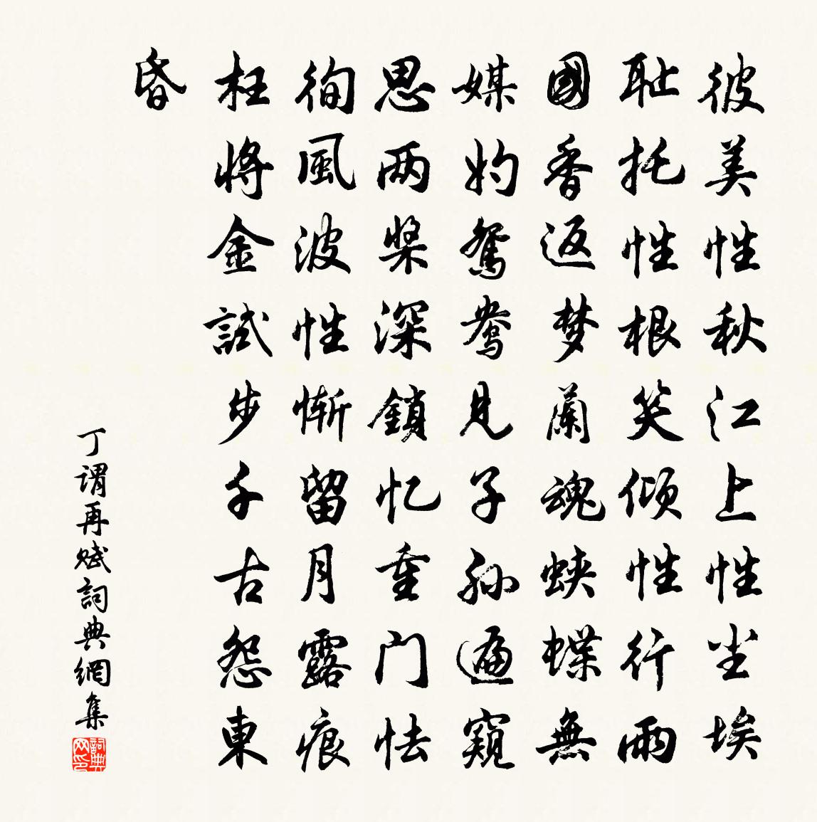 詩詞名句歷史字典書法欣賞書法字典國語詞典說文解字康熙字典古漢語字典標 題 作 者 詩 句 再賦作者:丁謂 朝代:宋代再賦原文彼美性秋江上,性塵埃恥托性根。笑傾性行雨國,香返夢蘭魂。蛺蝶無媒妁,鴛鴦見子孫。遍窺思兩槳,深鎖憶重門。怯徇風波性,慚留月露痕。枉將金試步,千古怨東昏。詩詞問答問:再賦的作者是誰?答:丁謂問:再賦寫於哪個朝代?答:宋代丁謂再賦書法欣賞再賦書法作品詩詞推薦送林伯虎除國子監丞赴闕趙汝鐩〔宋代〕山房高千仞,上與青雲齊。日從二仙遊,兩耳湔是非。北窗正齁齁,鋒車扣岩扉。猿鶴競作色,山人忘我為。林泉柏堂蘇軾〔宋代〕道人手種幾生前,鶴骨龍筋尚宛然。雙乾一先神物化,九朝三見太平年。忽驚華構依岩出,乞與佳名到處傳。此柏過馬嵬二首(第二首一作李遠詩)李益〔唐代〕路至牆垣問樵者,顧予雲是太真宮。太真血染馬蹄盡,朱閣影隨天際空。丹壑不聞歌吹夜,玉階唯有薜蘿風。世人松曾極〔宋代〕匯進 * 卒召戎,萌芽培養自熙豐。當時手植留遺愛,只有岩前十八公。水調歌頭 此下原有沁園春七返還丹一首,乃佚名〔宋代〕五行不到處,一氣未生前。清光赫赫,無何鄉里獨超然。日月豈能照鑒,天地不能包裹,晃朗妙無邊。賴有竹澗水和本齋止酒牟巘五〔宋代〕白家老瓦慣從游,和氣如春不汝郵。近日更誰嫌外酒,夢成燥吻吸青丘。初秋露坐作短歌陸游〔宋代〕房星縱,心星橫,鬥牛闌乾河漢明。青天露坐性所樂,不覺庭樹秋風生。秋風搖落君勿悲,明年花開還滿枝。人生送束徽之入京王令〔宋代〕出處身之道,窮通命有時。九門無直謁,千里去何為。南畝春耕近,西風去馬羸。白雲況多很,歸計莫令遲。總題葛紹體〔宋代〕車馬不來山意朴,市廛都遠土風淳。又無僧寺閒鐘鼓,流水聲中自有春。用三尾貼法歌賈似道〔宋代〕蛩吟三尾莫添雙,呼叫連綿怕性狂。三尾黑頭須用小,尖頭獨腳始相當。餵交三尾時常飽,免致蟲吟誤損傷。更將南昌道中釋曉瑩〔宋代〕東遊心渺渺,趼足步遲遲。馬驛黃茅路,人家白竹籬。歸雲橫斷嶺,落日映荒陂。何地可容足,長喔招隱詩。謝朱郎中張埴〔宋代〕春風六轡絲,光華塞樊川。川上此何日,所向生奇妍。金山萬丈高,但見兀在前。白頭分墮落,剨叫鬼擘然。青黃平津一首蘇籀〔宋代〕布衣海上看群豕,金門晚躋作三吏。漢主功名氣薄雲,柄用儒術親且貴。曉通當世博前聞,自得春秋有餘地。臣節天邊行杜甫〔唐代〕天邊老人歸未得,日暮東臨大江哭。隴右河源不種田,胡騎羌兵入巴蜀。洪濤滔天風拔木,前飛禿鶖後鴻鵠。九度鸞鳳李商隱〔唐代〕舊鏡鸞何處,衰桐鳳不棲。金錢饒孔雀,錦段落山雞。王子調清管,天人降紫泥。豈無雲路分,相望不應迷。秋夜巫山喬備〔唐代〕巫峽裴回雨,陽台淡盪雲。江山空窈窕,朝暮自紛氳。螢色寒秋露,猿啼清夜聞。誰憐夢魂遠,腸斷思紛紛。送孟十二倉曹赴東京選杜甫〔唐代〕君行別老親,此去苦家貧。藻鏡留連客,江山憔悴人。秋風楚竹冷,夜雪鞏梅春。朝夕高堂念,應宜彩服新。一枝春周密〔宋代〕簾影移陰,杏香寒、乍濕西園絲雨。芳期暗數。又是去年心緒。金花謾翦,倩誰畫、舊時眉嫵。空自想、楊柳風流廣信道中喻良能〔宋代〕昔日題詩處,重來續勝游。綠陰初入夏,蒼鬢幾經秋。細雨渡頭市,孤煙汀際舟。溪山雖信美,翻恨不淹留。出郭姜特立〔宋代〕歲暮偶出郭,斜陽帶遠村。雪松含臘意,沙水動春痕。名句推薦傷心莫問前朝事,重上越王台。倪瓚《人月圓·傷心莫問前朝事》 眇眇孤舟逝,綿綿歸思紆。陶淵明《始作鎮軍參軍經曲阿作》 惶恐灘頭說惶恐,零丁洋里嘆零丁。文天祥《過零丁洋》 佳游不可得,春風惜遠別。李白《登梅岡望金陵贈族侄高座寺僧中孚》 昨夜星辰昨夜風,畫樓西畔桂堂東。李商隱《無題·昨夜星辰昨夜風》 廉者憎貪,信者疾偽宋祁、歐陽修、范鎮、呂夏卿等《新唐書·列傳·卷三十二》 遠路應悲春晼晚,殘霄猶得夢依稀。李商隱《春雨》 信者人之乾也,義者行之節也。劉向《列女傳·貞順傳·陳寡孝婦》 落地為兄弟,何必骨肉親!陶淵明《雜詩》 綠竹半含籜,新梢才出牆。杜甫《嚴鄭公宅同詠竹》