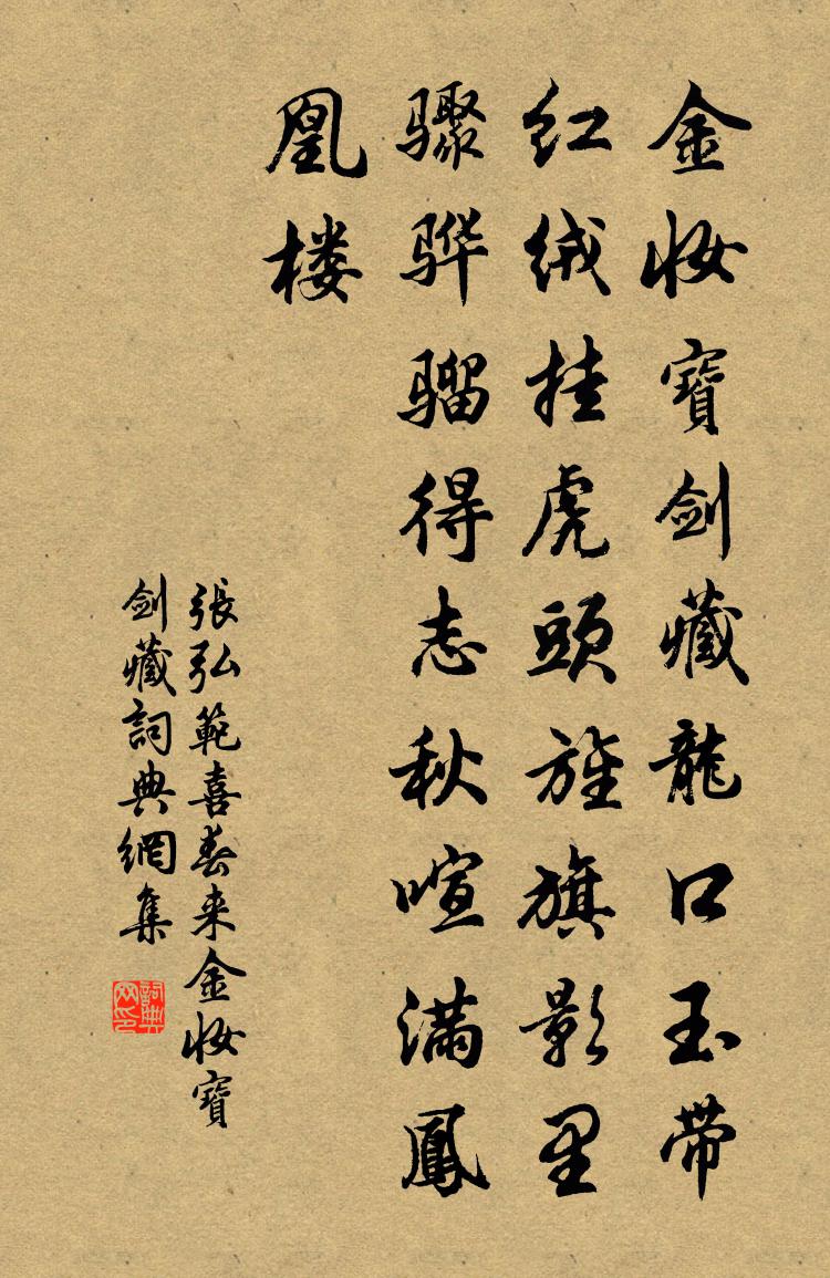 金妝寶劍藏龍口,玉帶紅絨掛虎頭,旌旗影里驟驊騮。得志秋,喧滿鳳凰樓。
