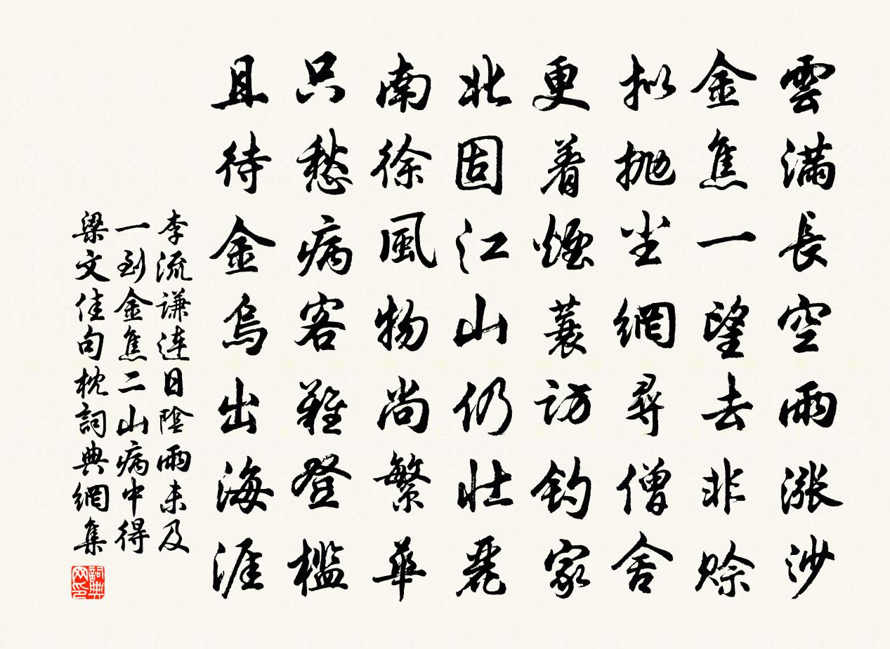 詩詞名句歷史字典書法欣賞書法字典國語詞典說文解字康熙字典古漢語字典標 題 作 者 詩 句 連日陰雨未及一到金焦二山病中得梁文佳句枕作者:李流謙 朝代:宋代原文雲滿長空雨漲沙,金焦一望去非賒。擬拋塵網尋僧舍,更著煙蓑訪釣家。北固江山仍壯麗,南徐風物尚繁華。只愁病客難登檻,且待金烏出海涯。詩詞問答問:《連日陰雨未及一到金焦二山病中得梁文佳句枕》的作者是誰?答:李流謙問:該詩寫於哪個朝代?答:宋代書法欣賞連日陰雨未及一到金焦二山病中得梁文佳句枕書法作品詩文賞析【原題】:連日陰雨未及一到金焦二山病中得梁文佳句枕上吟喔不能自己複次韻詩詞推薦挽趙北山趙必象〔宋代〕嫠緯孤忠泣黍離,吟形如鶴不勝衣。參苓信美難供病,松菊猶存久賦歸。魂夢三千餘里遠,功名四十九年非。北山題張侍郎松菊堂洪皓〔宋代〕松青抱正性,菊黃得正色。蔚在卉木間,厥異存簡策。流膏貫眾壤,千歲名虎魄。落英通鼻觀,服餌供楚客。安神二月二十四日,寺丞田文清叔及學中舊同舍諸楊萬里〔宋代〕正月一度游玉壺,二月一度游真珠。是時新霽曉光初,西湖辭狀無遺余。君王予告作寒食,來看孤山海棠色。海棠杏花武衍〔宋代〕柳店春風酒旆斜,紫綃團萼數枝花。香肌元是多豐膩,錯把紅梅看作他。醉桃源/阮郎歸楊 * 〔宋代〕十年依舊破衫青。空書制敕綾。但知心似玉壺冰。牛衣休涕零。聊蹇傲,莫升騰。毋為附驥蠅。前山可數且徐行。送江陰簽判晁太祝梅堯臣〔宋代〕去無珠履為上賓,進船申浦憶春申。江田插秧鵓姑雨,絲網得魚雲母鱗。青天折桂香未滅,紫豉煮蓴甘更新。平時宮詞一百首岳珂〔宋代〕五夜鐘聲上直時,焚香重熨早朝衣。裡頭殿直催排立,等候君王出木圍。絕句三首余知閣〔宋代〕千里旌旗擁六飛,投簪欲上釣魚飢。無端忽被閒雲引,回耀峰前掩竹扉。佹詩先秦無名〔先秦〕天地易位,四時易鄉。列星隕墜。旦暮晦盲。幽暗登昭。日月下藏。公正無私。反見縱橫。志愛公利。得樓疏堂。句楊徽之〔唐代〕新霜染楓葉,皓月臘蘆花。初晴應教虞世南〔唐代〕初日明燕館,新溜滿梁池。歸雲半入嶺,殘滴尚懸枝。醉蓬萊霍安人〔宋代〕正朱明時侯,院宇清和,慶逢佳節。夢應熊羆,堯蓂翻三葉,羅綺如雲,壽杯爭勸,競起歌新闋。瑞氣氤氳,祥雲拜豐陵張籍〔唐代〕歲朝園寢遣公卿,學省班中亦攝行。身逐陵官齊再拜,手持木鐸叩三聲。寒更報點來山殿,曉炬分行照柏城。卻下和張判官登萬山亭,因贈洪府都督韓公孟浩然〔唐代〕韓公是襄士,日賞城西岑。結構意不淺,岩潭趣轉深。皇華一動詠,荊國幾謠吟。舊徑蘭勿剪,新堤柳欲陰。砌傍生查子(萍鄉陽春亭)趙師俠〔宋代〕千山擁翠屏,一水縈羅帶。雨過水痕添,雲散山容在。亭高景最幽,天迴風尤快。啼鳥一聲閒,喚起情無奈。蹋磧陸游〔宋代〕鬼門關外逢人日,蹋磧千家萬家出。竹枝殘戚雲不動,劍器聯翩日將夕。行人十有 * 癭,見慣何曾羞顧影。江邊山中即事徐照〔宋代〕著履上崔嵬,呼兒注瓦杯。千岑經雨後,一雁帶秋來。野艇乘潮發,山園逐主開。餘生落樵牧,開卷少塵埃。送蔣朴之維陽潘希白〔宋代〕隋家天子愛揚州,四十離宮取次游。荊棘久迷秦隴路,柳絲空拂汴河流。君才清似庾開府,世事難於孫仲謀。莫為虞美人(劉帥生日)趙彥端〔宋代〕疏梅淡月年年好。春意今年早。迎長時節近佳辰。看取袞衣黃髮、畫麒麟。酒中倒臥南山綠。起舞人如玉。風流椿寓泊金陵尋王荊公陳跡賀鑄〔宋代〕晚泊扁舟一問津,依然節物思羈人。江山月照六朝夢,桃李風吹三月春。宅枕謝公墩下路,詩尋蕭寺壁間塵。可須名句推薦塞雁高飛人未還,一簾風月閒。李煜《長相思·一重山》 聞道長安燈夜好,雕輪寶馬如雲。毛滂《臨江仙·都城元夕》 無奈朝來寒雨,晚來風。李煜《相見歡·林花謝了春紅》 火形嚴,故人獻灼;水形懦,人多溺。韓非及後人《韓非子·內儲說上七術》 任賢勿貳,去邪勿疑。佚名《尚書·虞書·大禹謨》 狂風吹我心,西掛鹹陽樹。李白《金鄉送韋八之西京》 望雲慚高鳥,臨水愧游魚。陶淵明《始作鎮軍參軍經曲阿作》 焉有君子而可以貨取乎?孟子《孟子·公孫丑章句下·第三節》 一寸相思千萬緒。人間沒個安排處。李冠《蝶戀花·春暮》 浮雲暮南征,可望不可攀。杜甫《前出塞九首》
