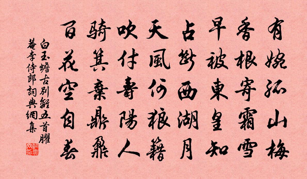 詩詞名句歷史字典書法欣賞書法字典國語詞典說文解字康熙字典古漢語字典標 題 作 者 詩 句 古別離五首臞菴李侍郎作者:白玉蟾 朝代:宋代古別離五首臞菴李侍郎原文有婉孤山梅,香根寄霜雪。早被東皇知,占斷西湖月。天風何狼籍,吹付壽陽人。騎箕棄鼎鼐,百花空自春。詩詞問答問:古別離五首臞菴李侍郎的作者是誰?答:白玉蟾問:古別離五首臞菴李侍郎寫於哪個朝代?答:宋代問:古別離五首臞菴李侍郎是什麼體裁?答:樂府白玉蟾古別離五首臞菴李侍郎書法欣賞古別離五首臞菴李侍郎書法作品詩文賞析原註:臞菴李侍郎:囦詩詞推薦次韻周敏卿秋興三首喻良能〔宋代〕悠悠草根蟲,鳴聲近我床。皎皎林間月,亦已照我牆。感此動萬慮,聊復舉一觴。何以侑我酒,清嘯聞疏篁。李白名許雲封謎佚名〔唐代〕樹下彼何人,不語真吾好。語若及日中,煙霏謝成寶。題時遁澤畫卷十首王柏〔宋代〕浩浩乾坤闊,微微見斷山。頗興浮海意,吾道正多艱。冬日題智門寺北樓杜牧〔唐代〕滿懷多少是恩酬,未見功名已白頭。不為尋山試筋力,豈能寒上背雲樓。矸軒陳寶之〔宋代〕謝公樓上風流客,紫髯蕭疏雙鬢白。胸中有氣吐虹霓,床頭無金失顏色。問君借取騎鶴錢,更欲吸盡長鯨川。出門偈傾一百六十九首釋智朋〔宋代〕天寒人,寒徹骨,迥無依倚。拳到踢到當機,貴得崢嶸。眼裹無筋,韓{左犭右盧}逐塊,皮下有血,杓卜虛聲。藤樽蘇洵〔宋代〕枯藤生幽谷,蹙縮似無材。不意猶為累,刳中作酒杯。君知我好異,贈我酌村醅。衰意方多感,為君當數開。藤樽句宋太宗〔宋代〕鑾輿臨紫塞,朔野凍雲飛。南浦別白居易〔唐代〕南浦淒淒別,西風裊裊秋。一看腸一斷,好去莫回頭。雨中報謁呈劉韶美侍郎范成大〔宋代〕花落滿城雨,雨余雲重陰。驅車有底急?巷泥三尺深。平生黃篾舫,漁榔有清音。斗升得苦相,懷刺沖愁霖。歸來句馮去辯〔宋代〕琴心自娛誰料理,犢鼻雖貧未主臣。維揚即事張蘊〔宋代〕月明城上響邊笳,一枕三更夢到家。不耐楚氛真僻性,賦詩酌酒與瓊花。柳梢青(次韻趙德莊)管鑒〔宋代〕神仙墮謫。天為賦與,經綸才識。蓋代聲名,宗英惟向,翰林頌白。黃堂一笑留客。算此處、淹留未得。且對清尊悼趙宰紫芝甫釋永頤〔宋代〕紫芝昔賦天台日,桐柏宮詩老更成。夢斷玉樓春帳曉,蝶迷花院夕魂輕。錢郎舊體終難並,姚賈機關報裁近有聲。書感陸游〔宋代〕衰顏非復昔年朱,幾過黃公舊酒壚。成敗只堪三太息,是非終付一胡盧。連天菸草迷歸夢,動地風波歷畏途。辛苦和袁郎中破賊後經剡縣山水上太尉李嘉祐〔唐代〕受律仙郎貴,長驅下會稽。鳴笳山月曉,搖旆野雲低。翦寇人皆賀,回軍馬自嘶。地閒春草綠,城靜夜烏啼。破竹送汪以南教授方回〔宋代〕郡文學掾未宜卑,四七元勛所願為。歸興忽如憶鱸膾,閒心肯復戀皋比。鄭虔粱肉非無分,薛令桑榆竟自奇。想見禪人寫真求贊釋正覺〔宋代〕瘦削而黃,慣窮不忙。閒情許淡,默味能長。靈犀之通一點暈,老蚌之蘊千年光。而今到處相隨去,頭頭的的露堂出郭陳必復〔宋代〕泥深留屐齒,出郭少人行。遠磬含餘韻,疏簾透薄明。浮雲時書異,流水世情輕。唯讀南華了,年來悟養生。仙水歸程王邁〔宋代〕九鯉湖邊路,重來盟未寒。折花挼水獻,策杖馭風還。宦海波濤惡,仙家日月間。前生丹在否,歲晚要重丸。名句推薦故人何不返,春華復應晚。柳惲《江南曲》 三日柴門擁不開,階平庭滿白皚皚。柳宗元《酬王二十舍人雪中見寄》 勞歌一曲解行舟,紅葉青山水急流。許渾《謝亭送別》 奸有益,人皆可為奸;忠致禍,人難為忠。來俊臣《羅織經·察奸卷第八》 善歌者,使人繼其聲;善教者,使人繼其志。戴聖《禮記·學記》 佳人彩雲里,欲贈隔遠天。李白《折荷有贈》 志不強者智不達。墨子《墨子·02章 修身》 東武望餘杭,雲海天涯兩渺茫。蘇軾《南鄉子·和楊元素時移守密州》 葉潤林塘密,衣乾枕席清。杜甫《水檻遣心二首》 盡人事以聽天命。李汝珍《鏡花緣·第六回》