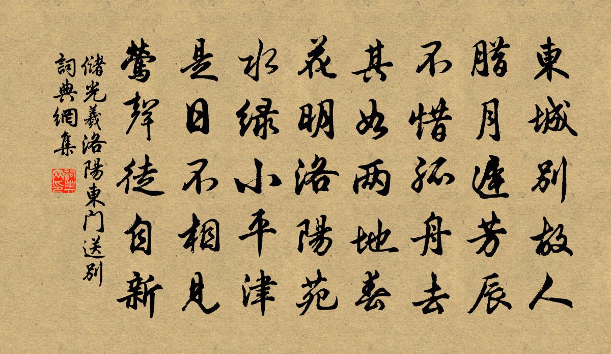 詩詞名句歷史字典書法欣賞書法字典國語詞典說文解字康熙字典古漢語字典標 題 作 者 詩 句 洛陽東門送別作者:儲光羲 朝代:唐代洛陽東門送別原文東城別故人,臘月遲芳辰。不惜孤舟去,其如兩地春。花明洛陽苑,水綠小平津。是日不相見,鶯聲徒自新。詩詞問答問:洛陽東門送別的作者是誰?答:儲光羲問:洛陽東門送別寫於哪個朝代?答:唐代問:洛陽東門送別是什麼體裁?答:五律儲光羲洛陽東門送別書法欣賞洛陽東門送別書法作品注釋全唐詩:卷139_4全唐詩:卷139_4詩詞推薦玄都觀徐氏〔唐代〕登尋丹壑到玄都,接日紅霞照座隅。即向周回岩下看,似看曾進畫圖無。贈劉行甫陳造〔宋代〕劉郎雍容古君子,平時人指原夫耳。忽然闖我風雅壇,疾雷破柱蟻龍起。豫章可棟今七年,魏舒驚人才一矢。後來蔡良甫觀頤堂葉適〔宋代〕不多花卉春長在,粗有田元歲自豐。為問靈龜千歲訣,此中風味許誰同。書陸放翁詩卷後林景熙〔宋代〕天寶詩人詩有史,杜鵑再拜淚如水。龜堂一老旗鼓雄,勁氣往往摩其壘。輕裘駿馬成都花,冰甌雪碗建溪茶。承平夜雨白居易〔唐代〕我有所念人,隔在遠遠鄉。我有所感事,結在深深腸。鄉遠去不得,無日不瞻望。腸深解不得,無夕不思量。況此頌古十首釋雲岫〔宋代〕百尺竿頭親進步,分明一啞更無增。是誰未到竿頭者,也說鵬飛九萬里。雜詩七首黃庭堅〔宋代〕營巢燕燕几時休,在處成家春復秋。歲歲自來還自去,主人無厭客無求。夜坐陸游〔宋代〕瘦骨倚 * ,燈前影自看。心清便獨夜,酒盡怯新寒。病虎減精采,飢鴻摧羽翰。晚途堪笑閔,猶擬乞祠官。擬乙巳南郊慶成二首楊萬里〔宋代〕上瑞今年特地奇,大田多稼與雲齊。星沈折木天街北,波靜崑崙渤澥西。帝在紫壇神在次,穹如蒼蓋月如珪。一人送大理張卿(一題作送張衛尉)顧況〔唐代〕春色依依惜解攜,月卿今夜泊隋堤。白沙洲上江蘺長,綠樹村邊謝豹啼。遷客比來無倚仗,故人相去隔雲泥。越禽胡、吉、鄭、劉、盧、張等六賢皆多年壽,予白居易〔唐代〕七人五百七十歲,拖紫紆朱垂白須。手裡無金莫嗟嘆,尊中有酒且歡娛。詩吟兩句神還王,酒飲三杯氣尚粗。嵬峨泊流潢驛,潮風大作二首楊萬里〔宋代〕潮來潮去有何功,費盡辛勤辨一風。若使無風潮自至,信他海伯有神通。慶曆七年祀南郊禮畢賀赦司馬光〔宋代〕雷鼓千通破大幽,天開獄鑰縱纍囚。驛書散出先飛鳥,一日恩流四百州。憂旱章甫〔宋代〕貧賤甘羈旅,淹留賴薄田。悠悠將送老,比比不逢年。旱魃工為虐,雷公豈易鞭。醉能忘萬事,安得酒如川。維清佚名〔先秦〕維清緝熙,文王之典。肇禋,迄用有成,維周之禎。季父習靜哀詩四首劉克莊〔宋代〕易學紛紛各著書,獨於師說著功夫。涪翁舊傳七分止,邵子先天一畫無。不遣耆英陪講讀,空留章句授生徒。即今予筆多葦管近又得竹筆匣因作絕句晁說之〔宋代〕竹匳葦管可幽居,前日曾藏萬卷書。烽火不知南北渡,祝茲微物莫愁予。浣溪沙高觀國〔宋代〕魂是湘雲骨是蘭。春風冰玉注芳顏。誰招仙子在人間。濺水裙兒香霧皺,唾花衫子碧雲寒。洞簫聲絕卻驂鸞。啄木鳥二首魏野〔宋代〕亂繞園林啄,終朝意若何。莫因飢不足,翻愛蠹偏多。渴映鄰溪下,驚從別樹過。辛勤詠還囑,無損好枝柯。次韻周教授秋懷陳與義〔宋代〕一官不辦作生涯,幾見秋風捲岸沙。宋玉有文悲落木,陶潛無酒對黃花。天機袞袞山新瘦,世事悠悠日自斜。誤矣名句推薦城中桃李愁風雨,春在溪頭薺菜花。辛棄疾《鷓鴣天·陌上柔桑破嫩芽》 還背垂虹秋去,四橋煙雨,一宵歌酒。吳文英《瑞龍吟·送梅津》 前度綠陰載酒,枝頭色比舞裙同。王沂孫《慶清朝·榴花》 水榭風微玉枕涼。牙床角簟藕花香。蘇庠《浣溪沙·書虞元翁書》 金陵子弟來相送,欲行不行各盡觴。李白《金陵酒肆留別》 口而誦,心而惟。朝於斯,夕於斯。王應麟《三字經·全文》 令之有漸,軌之有度,寵之有節房玄齡《晉書·列傳·第六十二章》 人生如夢,一尊還酹江月蘇軾《念奴嬌·赤壁懷古》 花開堪折直須折,莫待無花空折枝。杜秋娘《金縷衣》 有花有酒春常在,無燭無燈夜自明蒲松齡《聊齋志異·卷一·考城隍》