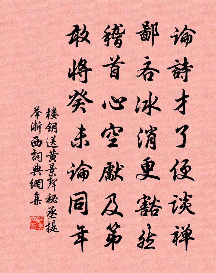 詩詞名句歷史字典書法欣賞書法字典國語詞典說文解字康熙字典古漢語字典標 題 作 者 詩 句 送黃景聲秘丞提舉浙西作者:樓鑰 朝代:宋代送黃景聲秘丞提舉浙西原文論詩才了便談禪,鄙吝冰消更豁然。稽首心空先及第,敢將癸未論同年。詩詞問答問:送黃景聲秘丞提舉浙西的作者是誰?答:樓鑰問:送黃景聲秘丞提舉浙西寫於哪個朝代?答:宋代樓鑰送黃景聲秘丞提舉浙西書法欣賞送黃景聲秘丞提舉浙西書法作品詩詞推薦端午帖子九首曹勛〔宋代〕曲檻榴花絳色鮮,博山一縷水沉煙。奉華窗戶清無暑,羽羽香傳遠岸蓮。山居詩釋延壽〔宋代〕萬事從來只自招,巡危由己路非遙。笙歌韻裹花先落,松檜枝閒雲未消。數下磬聲孤月夜,一爐香翥白雲朝。誰人禪人並化主寫真求贊釋正覺〔宋代〕寒雪一顛,秋雲半肩。淵默曲木,月行霽天。轉功能就位,借伴還入廛。機用也離虛坎實,變通也坤斷乾連。和玉汝贈收上人韓維〔宋代〕道得都來是八成,聖無功用已非靈。憑君諦視丹霞路,依舊雲山點點青。四威儀釋師範〔宋代〕山中臥,不知時節過。雨打窗,好夢都驚破。贈程環孔武仲〔宋代〕識盡公卿更食貧,蒼髯瘦骨走京塵。高談亦與時多忤,屢中方知術有神。前會渺茫渾不記,遠遊蕭索復相親。疑公斫膾懷永叔梅堯臣〔宋代〕高河古穴深,下有蒼鱗鯽。出水獰將飛,落刀細可織。香粳炊正滑,白酒美少力。但欠平生歡,共此中路食。道室即事陸游〔宋代〕松根茯苓味絕珍,甑中枸杞香動人。勸君下箸不領略,終作邙山一窖塵。定風波辛棄疾〔宋代〕野草閒花不當春,杜鵑卻是舊知聞。謾道不如歸去住,梅雨,石榴花又是離魂。前殿群臣深殿女,赭袍一點萬紅巾徐州送江少卿蘇轍〔宋代〕夜雨泗河深,曉日輕舟發。帆開送客遠,城轉高台沒。居人永瞻望,歸意何倉卒。公來初無事,豐歲多牟麥。鈴閣相和歌辭。銅雀妓王勃〔唐代〕妾本深宮妓,曾城閉九重。君王歡愛盡,歌舞為誰容。錦衾不復襞,羅衣誰再縫。高台西北望,流涕向青松。金鳳已亥雜詩 295龔自珍〔清代〕古人用兵重福將,小說家名因果狀。不信古書愎用知,水厄淋漓黑貂喪。喜雨得城字秦觀〔宋代〕陰陽有常職,代御不可並。一氣或錯繆,愆伏相寇兵。惟時四月交,南國厭久晴。風師挾帝令,呼號肆徂征。雲師郊行即事程顥〔宋代〕芳原綠野恣行時,春入遙山碧四圍。興逐亂紅穿柳巷,困臨流水坐苔磯。莫辭盞酒十分勸,只恐風花一片飛。況是同友人會裴明府縣樓許彬〔唐代〕開閣雨吹塵,陶家揖上賓。湖山萬疊翠,汀樹一行春。景逼歸檐燕,歌喧已醉身。登臨興未足,喜有數年因。正月四日蔡襄〔宋代〕今朝才見雪泥乾,日薄雲低又作寒。家山千里何時到,溪上梅花正好看。過鹿門作齊己〔唐代〕鹿門埋孟子,峴首載羊公。萬古千秋里,青山明月中。政從襄沔絕,詩過洞庭空。塵路誰回眼,松聲兩處風。生查子(離思)呂本中〔宋代〕雙雙小鳳斜,淡淡鴉兒穩。一曲渭城歌,柳色饒春恨。離觴洗別愁,酒盡愁難盡。寶瑟雁縱橫,誰寄天涯信。又和二絕句楊萬里〔宋代〕一冬寒不到深山,豈有春來更會寒?幸自趁晴行腳好,卻嫌沙入破鞋間。即事宋祁〔宋代〕中伏翻無暑,斜陽未即曛。暫光風處葉,餘墨雨殘雲。圃埒繁蔬甲,常坳疊蘚文。巾{左巾右勾繁體}殊上喜,文名句推薦欲知方寸,共有幾許清愁,芭蕉不展丁香結。賀鑄《石州引·薄雨初寒》 若為化得身千億,散上峰頭望故鄉。柳宗元《與浩初上人同看山寄京華親故》 鴻雁幾時到,江湖秋水多。杜甫《天末懷李白》 千貫買田,萬貫結鄰。佚名《增廣賢文·下集》 白草黃沙。月照孤村三兩家。蔣氏女《減字木蘭花·題雄州驛》 村北村南,穀雨才耕遍。秀麥連岡桑葉賤。范成大《蝶戀花·春漲一篙添水面》 梅花南北路,風雨濕征衣。文天祥《南安軍》 險韻詩成,扶頭酒醒,別是閒滋味。李清照《念奴嬌·春情》 龍蛇四海歸無所,寒食年年愴客心。屈大均《壬戌清明作》 月照城頭烏半飛,霜淒萬樹風入衣。李頎《琴歌》