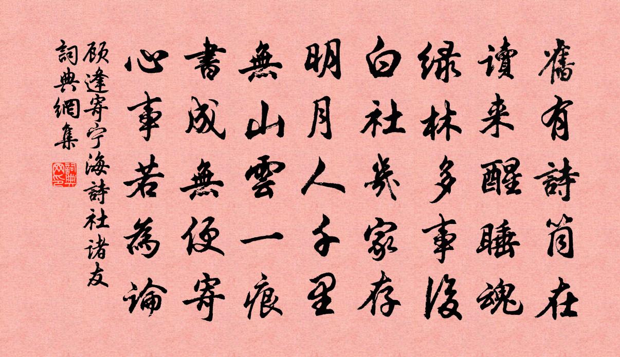 詩詞名句歷史字典書法欣賞書法字典國語詞典說文解字康熙字典古漢語字典標 題 作 者 詩 句 寄寧海詩社諸友作者:顧逢 朝代:宋代寄寧海詩社諸友原文舊有詩筒在,讀來醒睡魂。綠林多事後,白社幾家存。明月人千里,無山雲一痕。書成無便寄,心事若為論。詩詞問答問:寄寧海詩社諸友的作者是誰?答:顧逢問:寄寧海詩社諸友寫於哪個朝代?答:宋代顧逢寄寧海詩社諸友書法欣賞寄寧海詩社諸友書法作品詩詞推薦新作官梅莊,移植大梅數十本繞之范成大〔宋代〕臘前催喚主林神,玉樹飛來不動塵。契闊西湖慚處士,飄零東閣似詩人。一天午夢空花碎,滿地春愁月影新。掃淨試院和李湛溪韻吳泳〔宋代〕呵叱星辰賦遠遊,更提水鏡著中流。讀書有眼月千里,愛士無方春九州。論及養生渾是道,時因主試卻關愁。武夷早入皇城贈王留守僕射白居易〔唐代〕津橋殘月曉沈沈,風露淒清禁署深。城柳宮槐謾搖落,悲愁不到貴人心。句徐良弼〔宋代〕青春不再汝知乎。贈貓陸游〔宋代〕執鼠無功元不劾,一簞魚飯以時來。看君終日常安臥,何事紛紛去又回?寄題廬陵王晉輔先輩桂堂陸游〔宋代〕楚人記草木,桂在椒蘭中,我懹小山句,妙絻窮化工。唐人作山水,亦以桂配松,丹葩間綠葉,錦繡相疊重。不知贈李秀才是上公孫子杜牧〔唐代〕骨清年少眼如冰,鳳羽參差五色層。天上麒麟時一下,人間不獨有徐陵。陳貫道摘坡詩如寄以自號達者之流也為賦浩浩文天祥〔宋代〕浩浩歌,人生如寄可奈何。春秋去來傳鴻燕,朝暮出沒奔羲娥。青絲冉冉上霜雪,百年欻若彈指過。封侯未必勝瓜挽蔣質甫陳著〔宋代〕誰能傳耆舊,善譽在鄉關。教子籯金外,和家棣萼閒。死心多佛悟,生世半時閒。逝矣夫何憾,逍遙玉女山。袷饗太廟佚名〔宋代〕皇皇在宥,品物由庚。文教純被,武功告成。流頌樂府,擁休宗祊。帝奉裸瓚,欽哉孝誠。榕樹樓晚眺李秉禮〔清代〕高閣登臨快晚晴,好風吹送葛衣輕。 雲中古寺疏鍾動,樹里斜陽遠岫明。 被岸軟沙眠乳犢,蘸波垂柳囀流鶯。答皇甫十郎中秋深酒熟見憶白居易〔唐代〕煙景冷蒼茫,秋深夜夜霜。為思池上酌,先覺瓮頭香。未暇傾巾漉,還應染指嘗。醍醐慚氣味,琥珀讓晶光。若許郊廟歌辭。享太廟樂章。昭感佚名〔唐代〕鏗鏘韶濩,肅穆神容。洪規赫赫,祠典雍雍。已周三獻,將乘六龍。虔誠有托,懇志無從。廉溪陳舜俞〔宋代〕豈無城中居,高牆圍大屋。愛此原野間,山靜溪水綠。人家買良田,歲取十千谷。我耕山下土,所獲亦以足。藜羹哭梁運管劉克莊〔宋代〕憶共游山猶昨日,奄歸白晝隔存亡。宅深外不知何病,醫雜人爭試一方。弔客傷心同瀝酒,愛姬收淚各分香。淳熙次韻林初心先輩吳則禮〔宋代〕倦客無人問,逢人只自嗟。孤舟在江漢,老夢繞京華。聽雨閒扉掩,看雲短幘斜。固窮吾已定,莫向五侯家。王書記以近詩三篇相示各摭其意以詩賡之呈司馬光〔宋代〕劍山中斷融為川,沮江雙流郁迴旋。溝塍阡陌粲如繡,香秔紫芋皆良田。地靈物秀氣淑美,由來袞袞生英賢。朝家偈頌一百二十三首釋祖欽〔宋代〕吹毛劍,齧鏃機,肘後符,頂門眼。潭州城裡起五千間寨屋,道林寺里借一百名夫。你輩後生晚進,茄子瓠子,吃兀坐頗念遊歷山水戲作陸游〔宋代〕萬里當時寄一官,十年客枕不曾安。鬼愁灘下扁舟晚,蛇退陂前古驛寒。昔嘆遠遊生雪鬢,近緣多病學金丹。功名曉登多稼亭三首楊萬里〔宋代〕雨前田畝不勝荒,雨後農家特地忙。一眼平疇三十里,際天白水立青秧。名句推薦花漸凋疏不耐風,畫簾垂地晚重工,墮階縈蘚舞愁紅孫光憲《浣溪沙·花漸凋疏不耐風》 奇外無奇更出奇,一波才動萬波隨。元好問《論詩三十首·二十二》 賞心樂事共誰論?花下銷魂,月下銷魂。唐寅《一剪梅·雨打梨花深閉門》 蓬頭稚子學垂綸,側坐莓苔草映身。胡令能《小兒垂釣》 大漠風塵日色昏,紅旗半卷出轅門。王昌齡《從軍行七首》 秋風吹地百草乾,華容碧影生晚寒。李賀《開愁歌》 戰必覆人之軍,攻必凌人之城。商鞅《商君書·賞刑》 嘆人間,美中不足今方信。縱然是齊眉舉案,到底意難平。曹雪芹《紅樓夢·第五回》 矜偽不長,蓋虛不久。韓非及後人《韓非子·難一》 夜聞歸雁生鄉思,病入新年感物華。歐陽修《戲答元珍》