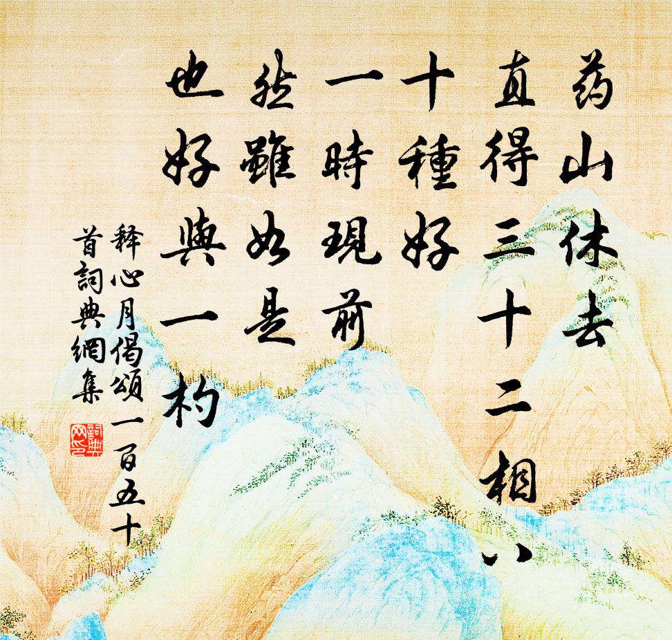 詩詞名句歷史字典書法欣賞書法字典國語詞典說文解字康熙字典古漢語字典標 題 作 者 詩 句 偈頌一百五十首作者:釋心月 朝代:宋代偈頌一百五十首原文藥山休去,直得三十二相八十種好,一時現前。然雖如是,也好與一杓。詩詞問答問:偈頌一百五十首的作者是誰?答:釋心月問:偈頌一百五十首寫於哪個朝代?答:宋代釋心月偈頌一百五十首書法欣賞偈頌一百五十首書法作品詩詞推薦好事近·花底一聲鶯劉翰〔宋代〕花底一聲鶯,花上半鉤斜月。月落烏啼何處,點飛英如雪。東風吹盡去年愁,解放丁香結。驚動小亭紅雨,舞雙雙賀王禹玉元絳〔宋代〕前殿聽宣中禁制,南宮看集外朝班。星辰影落三階下,桃李陰成四海間。板橋小別李商隱〔唐代〕回望高城落曉河,長亭窗戶壓微波。水仙欲上鯉魚去,一夜芙蓉紅淚多。泛清溪入齊山孔武仲〔宋代〕轉轎南堤太阻長,不如乘興泛輕航。園林蔭翳清如簟,禽鳥將迎語有簧。溪是明河天上去,山疑方丈石中藏。衣巾溪邊月上二首楊萬里〔宋代〕片子黃金餅,看來只管高。忽然落溪水,雜碎作銀濤。昭君怨(游池)張鎡〔宋代〕拂曉拿舟東去,細看荷花垂露。紅綠總吹香,一般涼。會享人天清福,休把兩眉輕蹙。誰道做神仙,戴貂蟬。送二子從子宜讀書劉翼〔宋代〕三代讀書無寸功,又將此法教兒童。旁人笑我背時好,不背旁人背樂翁。朝天子(周師從小閣)楊無咎〔宋代〕小閣寬如掌。占螺浦、山川夷曠。千奇萬狀。見雲煙收放。更永夜、風生明月上。用取真成無盡藏。誰共賞。徙倚出心原詹初〔宋代〕行行涉南原,遙望北山岑。上有千尺崖,下有高樹林。高林轉幽隩,戛然啼雙禽。流水自迅逝,白雲澹無心。策杖述德上興元嚴僕射歐陽詹〔唐代〕推車閫外主恩新,今日梁川草遍春。玉色據鞍雙節下,揚兵百萬路無塵。偈頌六十首釋曇華〔宋代〕金佛不度爐,木佛不度火。泥佛不度水,真佛屋裹坐。萬牛挽不回,千個與萬個。好事積如山,祗緣輕放過。不放伏蒙承旨學士特贈寵招慚非喜客陪列仙于丹地李至〔宋代〕昔陪群彥在鰲山,今日重來赴玳筵。才向玉堂觀聖札,又離瑤席睹宸篇。二南絕唱人驚駭,三體神蹤鳳折旋。坐久慈聖光獻皇太后輓詞二首曾鞏〔宋代〕祖烈鷹揚終食冀,家聲泉涌舊興譙。人倫風化歸三世,王室功勞屬兩朝。長信深嚴余羽衛,閟宮崇大列宗祧。衣冠次韻丁大監見懷魏了翁〔宋代〕行藏去就各隨時,敬怒嫌疏忍奮飛。正怕霜嚴天宇淨,敢夸舟載月明歸。生松有夢還公固,化鶴何心駐令威。獨抱長安上巳日對雨憶杭州強至〔宋代〕三月吾鄉三日盛,一春盛事一時傳。山花迎笑探芳騎,水鳥驚飛張樂船。今對清樽看細雨,更搔短髮數流年。曲江踏藕蘇轍〔宋代〕春湖柳色黃,宿藕凍猶僵。翻沼龍蛇動,撐船牙角長。清泉浴泥滓,粲齒碎冰霜。莫使新梢盡,炎風翠蓋涼。望江南洪皓〔宋代〕登高引領望江南,家在江南杳靄間。滿目烽煙歸路遠,萱親不見淚潸潸。鹹亨後謠佚名〔唐代〕莫浪語,阿婆嗔,三叔聞時笑 * 。雪後曾鞏〔宋代〕雪景鮮妍猶弄色,柳條蔥蒨已抽萌。風光苒苒流雙轂,人事悠悠寄一枰。射羿未應今獨有,嘲雄何必史能評。且將皇后閣端午帖子許應龍〔宋代〕辟邪不用符為佩,續命何須彩結絲。逮下徽音繼樛木,穰穰福履已來綏。名句推薦綠酒初嘗人易醉。一枕小窗濃睡。晏殊《清平樂·金風細細》 明眸皓齒誰復見,只有丹青余淚痕。蘇軾《虢國夫人夜遊圖》 聰明睿智,守之以愚李昉、李穆、徐鉉《太平御覽·文部·卷六》 誤落塵網中,一去三十年。陶淵明《歸園田居·其一》 百草千花寒食路,香車系在誰家樹。馮延巳《鵲踏枝·幾日行云何處去》 川澤納污,所以成其深;山嶽藏疾,所以就其大。魏徵《隋書·列傳·卷十一》 雪虐風饕愈凜然,花中氣節最高堅。陸游《落梅》 青山霽後雲猶在,畫出東南四五峰。郎士元《柏林寺南望》 憐君片雲思,一棹去瀟湘。杜牧《送薛種游湖南》 爭奈醒來,愁恨又依然朱淑真《江城子·賞春》