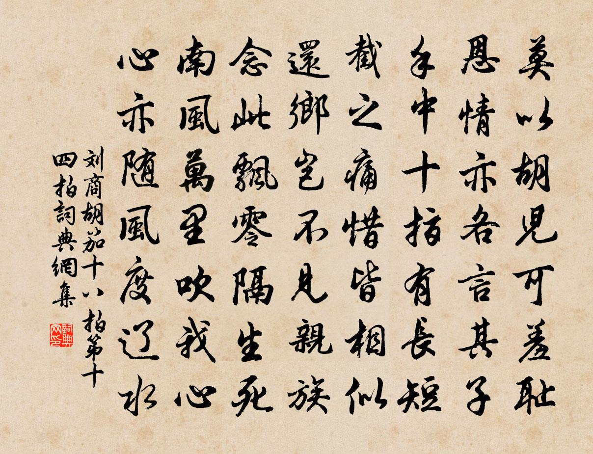 詩詞名句歷史字典書法欣賞書法字典國語詞典說文解字康熙字典古漢語字典標 題 作 者 詩 句 胡笳十八拍第十四拍作者:劉商 朝代:唐代胡笳十八拍第十四拍原文莫以胡兒可羞恥,恩情亦各言其子。手中十指有長短,截之痛惜皆相似。還鄉豈不見親族,念此飄零隔生死。南風萬里吹我心,心亦隨風度遼水。詩詞問答問:胡笳十八拍第十四拍的作者是誰?答:劉商問:胡笳十八拍第十四拍寫於哪個朝代?答:唐代劉商胡笳十八拍第十四拍書法欣賞胡笳十八拍第十四拍書法作品注釋全唐詩:卷303-24詩詞推薦赴任嘉州待闕左綿七十日通判呂國博日相從吟石介〔宋代〕鼎來豈敢道能詩,一見何因便解頤。鄉國三千里離別,杯盤七十日相知。送人江外馬馱妓,垂釣寺中魚竭池。別後胡姬詞楊巨源〔唐代〕妍 * 江頭,春風好客留。當壚知妾慣,送酒為郎羞。香渡傳蕉扇,妝成上竹樓。數錢憐皓腕,非是不能留。詠崔雲娘李宣古〔唐代〕何事最堪悲,雲娘只首奇。瘦拳拋令急,長嘯出歌遲。只見肩侵鬢,唯憂骨透皮。不須當戶立,頭上有鍾道。己未九日,對菊大醉,戲作四首袁凱〔明代〕老夫愛此黃金蕊,兒子須將白酒賒。直到殘陽下天去,更添燈火照欹斜。訴衷情梁寅〔元代〕李花當戶間桃花。妍景雪兼霞。春風送將春色,照耀野人家。回蝶使,罷蜂衙。日初斜。雙鶯窗外,雙燕簾間,共句朱頔〔宋代〕岳陽多丘山,城郭蜂房綴。辭眾偈釋道初〔宋代〕昨日離城市,白雲空往還。松風清耳目,端的勝人間。昭君怨蔡伸〔宋代〕一曲雲和松響。多少離愁心上。寂寞掩屏帷。淚沾衣。最是銷魂處。夜夜綺窗風雨。風雨伴愁眠。夜如年。青海西寄竇三端公呂溫〔唐代〕時同事弗同,窮節厲陰風。我役流沙外,君朝紫禁中。從容非所羨,辛苦竟何功。但示酬恩路,浮生任轉蓬。陪師厚游百花洲盤礴範文正祠下道羊曇哭謝安黃庭堅〔宋代〕慶州自不惡,藉甚載聲華。忠義可無憾,公今有世家。謝徐正十一兄惠牡丹顏帖趙孟堅〔宋代〕左攜珍帖右花王,雅貺何殊照乘光。拆壁漏痕含蠆尾,珍珠露顆帶天香。數千葉密憐檀暈,怕六丁收謹匣藏。答謝正月一日雪中過淮謁客回作二首蘇軾〔宋代〕十里清淮上,長堤轉雪龍。冰崖落屐齒,風葉亂裘茸。萬頃穿銀海,千尋渡玉峰。從來修月手,合在廣寒宮。攢眉酬王安之聞罷真率會司馬光〔宋代〕閉關寧是率,辭疾似非具。既處識嘲地,誰為長厚人。虛舟非者意,飄瓦不須噴。此過如何贖,清秋宴席陳。山居舒岳祥〔宋代〕雀飲梅凡雪,魚吞水面雲。山居差有味,世事不堪聞。野燒窮豬穴,晴霄轉雁群。溪寒春未著,閏月壓余分。春日汎舟南湖因遍游近港坐間書客所攜四扇張鎡〔宋代〕先須放櫂繞湖游,倒看行雲水底浮。客去莫歸朝市說,引渠無意作公侯。江亭晚望釋智圓〔宋代〕江亭閒寫望,秋景正無窮。鳥沒寒雲外,帆歸暮色中。淡煙生極浦,敗葉墜涼風。回道聞漁唱,人家隔葦叢。句吳璋〔宋代〕地暖尚疑消玉馬,雲開早欲放金雅。至櫟陽崇道寺聞嚴十少府趨侍武元衡〔唐代〕雲連萬木夕沈沈,草色泉聲古院深。聞說羊車趨盛府,何言瓊樹在東林。松筠自古多年契,風月懷賢此夜心。惆悵感事晁說之〔宋代〕短髮猶思沐,修途頗夢歸。不慚為吏拙,但恨讀書非。隴上健兒戍,漁陽突騎圍。誰能圖戰陣,枉是著朝衣。以詩句詠梅萬里春隨遠客來方蒙仲〔宋代〕萬里載梅歸,道是春來路。那知春到時,梅已隨風去。名句推薦花落家童未掃,鶯啼山客猶眠。王維《田園樂七首·其六》 願得一心人,白頭不相離。卓文君《白頭吟》 天外黑風吹海立,浙東飛雨過江來。蘇軾《有美堂暴雨》 愛親者,不敢惡於人;敬親者,不敢慢於人。孔子及其弟子《孝經·天子》 土膏欲動雨頻催,萬草千花一餉開;范成大《春日田園雜興》 寵柳嬌花寒食近,種種惱人天氣。李清照《念奴嬌·春情》 一時輕信人言語.自有明人話不平。馮夢龍《警世通言·卷四》 師之所處,荊棘生焉。大軍之後,必有凶年。老子《老子·道經·第三十章》 陌上深深,依舊年時轍。王國維《蝶戀花·滿地霜華濃似雪》 雷填填兮雨冥冥,猿啾啾兮狖夜鳴;屈原《九歌》