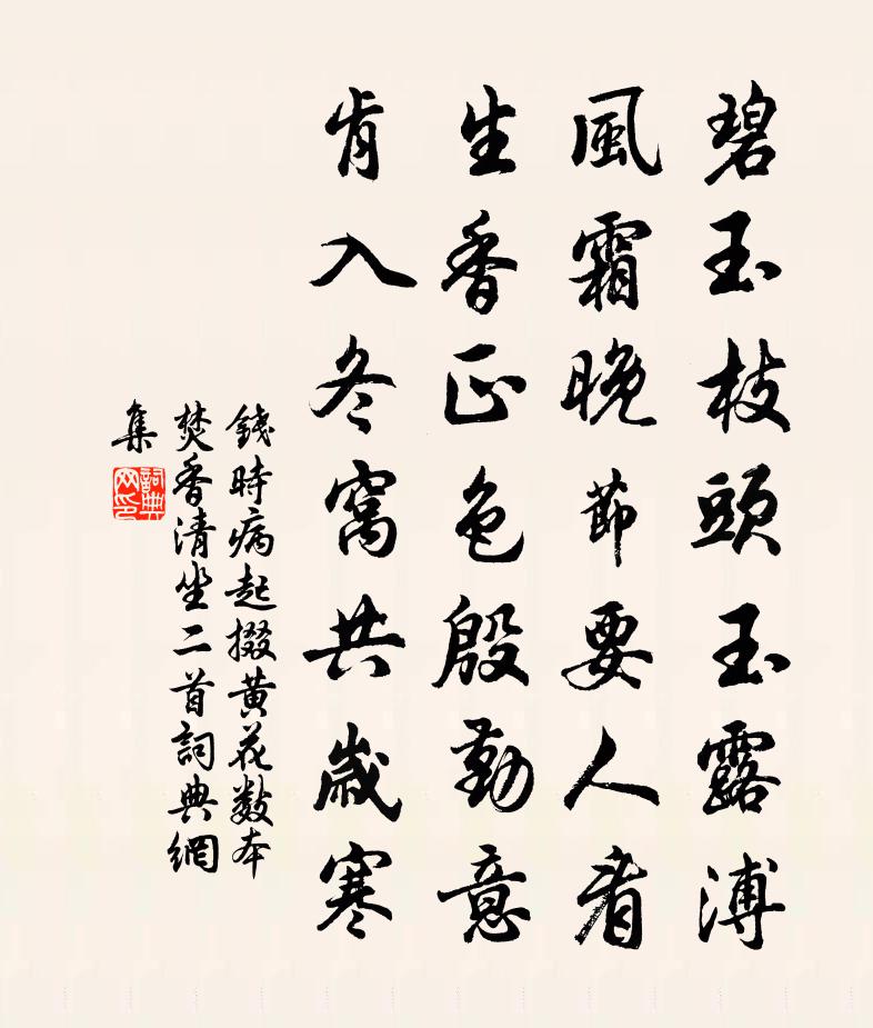 詩詞名句歷史字典書法欣賞書法字典國語詞典說文解字康熙字典古漢語字典標 題 作 者 詩 句 病起掇黃花數本焚香清坐二首作者:錢時 朝代:宋代原文碧玉枝頭玉露溥,風霜晚節要人看。生香正色殷勤意,肯入冬窩共歲寒。詩詞問答問:《病起掇黃花數本焚香清坐二首》的作者是誰?答:錢時問:該詩寫於哪個朝代?答:宋代書法欣賞病起掇黃花數本焚香清坐二首書法作品詩詞推薦夷陵郡內敘別楊衡〔唐代〕禮娶嗣明德,同牢夙所欽。況蒙生死契,豈顧蓬蒿心。雁幣任野薄,恩愛緣義深。同聲若鼓瑟,合韻似鳴琴。將迓秋懷詩五首曾國藩〔清代〕大葉下如雨,西風吹我衣。天地氣一肅,回頭萬事非。虛舟無抵件,恩怨召殺機。年年絆物累,俯仰鄰詬譏。終然春風樓況志寧〔宋代〕晴日遊絲拂畫欄,酒帘輕颺碧雲端。春風蝴蝶知何處,愁切江南曲已殘。陪任漕胡倉登滕王閣秋屏列岫吳芾〔宋代〕滕閣秋屏已快哉,更登列岫少徘徊。溶溶一水檐前去,隱隱千帆坐上來。每恨長年成契闊,頗欣今日得追陪。能並瑞香潘牥〔宋代〕愛極愁風雨,移根入畫檐。色過袍樣紫,香帶蜜脾甜。密葉團團護,幽枝歲歲添。芬芳無著處,一月在書籤。頌古四十五首釋慧遠〔宋代〕毗藍無裹喪佳聲,分手徒勞布惡名。果是一文偷不得,至今虛作不良人。送張謙父往潭州陳藻〔宋代〕八卦重來夢一周,人生列得幾年浮。看君矍鑠猶堪展,似我龍鍾只合休。淮廣早供詞峽興,湖湘留與鬢霜游。還鄉雪夜詹伯尹周少隱見過置酒次伯尹韻李彌遜〔宋代〕春雪花不禁風,花散作六花墮花,方庭截明玉,純白不可唾。枯腸索慳句,喁噞空白過。同襟得二妙,敵我悉城破寓直偶題王禹偁〔宋代〕兩朝書命媿無才,謾逐詞臣侍玉階。病似相如多避事,拙於方朔少詼諧。命奇只合先休退,道在何妨更卷懷。白首蝶戀花王安中〔宋代〕先發看紅梅。青玉一枝紅類吐。粉頰愁寒,濃與胭脂傅。辨杏猜桃君莫誤。天姿不到風塵處。雲破月來花下住。要了了庵頌黃庭堅〔宋代〕方廣庵名了了,了了更著庵庶。又要涪翁作頌,且圖錦上添花。若問只今了未,更須侍者煎茶。古人名詩權德輿〔唐代〕藩宣秉戎寄,衡石崇勢位。年紀信不留,弛張良自愧。樵蘇則為愜,瓜李斯可畏。不顧榮官尊,每陳豐畝利。家林瑞鶴仙(元日朝回)史浩〔宋代〕霽光春未曉。擁絳蠟攢星,霜蹄輕裊。皇居聳雲杪。靄祥煙瑞氣,青蔥繚繞。金門羽葆。聽臚唱、千官併到。慶三句潘大臨〔宋代〕滿城風雨近重陽。浮岡高似孫〔宋代〕山含宿凍未曾銷,鳥去仍回水路遙。千樹梅花三尺雪,一帆風力半江潮。宿城外張氏莊早起入三首楊萬里〔宋代〕燈火頻挑只管殘,雨聲終夜惱空山。幸蒙曉月多情白,又遣東風抵死寒。大晟府擬撰釋奠十四首佚名〔宋代〕大哉聖王,實王生德。作樂以崇,時祀無矣。清酤惟聲,嘉牲孔碩。薦羞神明,庶幾昭格。追和東坡次蔡郎中游湖韻於石〔宋代〕昔年著腳窮深幽,藕花十里煙波秋。騎驢踏月楊柳市,買舟聽雨菰蒲洲。酒樓倚天沸歌管,繁華轉眼如雲浮。山川寄題俞伯南所居希賢陳文蔚〔宋代〕毋為陵學山,當為川學海。尹重貴自任,顏樂誓不改。千秋歲(壽圓北山六十)彭子翔〔宋代〕重陽來未。誰領黃花意。斟玉醑,歌金縷。雲山籠瑞彩,風月溶清氣。北山頂,壽星一點光無際。六十今朝是。甲名句推薦梧桐更兼細雨,到黃昏、點點滴滴。李清照《聲聲慢·尋尋覓覓》 遮莫圓明似前度,不知誰續廣寒游。慧霖《閏中秋玩月》 鐘山抱金陵,霸氣昔騰發。李白《登梅岡望金陵贈族侄高座寺僧中孚》 東風惡,歡情薄。陸游《釵頭鳳·紅酥手》 和氣吹綠野,梅雨灑芳田。李世民《詠雨》 木蘭舟上,何處吳娃越艷:藕花紅照臉。孫光憲《河傳·風颭》 望中酒旆閃閃,一簇煙村,數行霜樹。柳永《夜半樂·凍雲黯淡天氣》 善謀生者,但令長幼內外,勤修恆業,而不必富其家王永彬《圍爐夜話·第九則》 舉杯互敬屠蘇酒,散席分嘗勝利茶。 * 《元旦口占用柳亞子懷人韻》 日暮征帆何處泊,天涯一望斷人腸。孟浩然《送杜十四之江南 / 送杜晃進士之東吳》