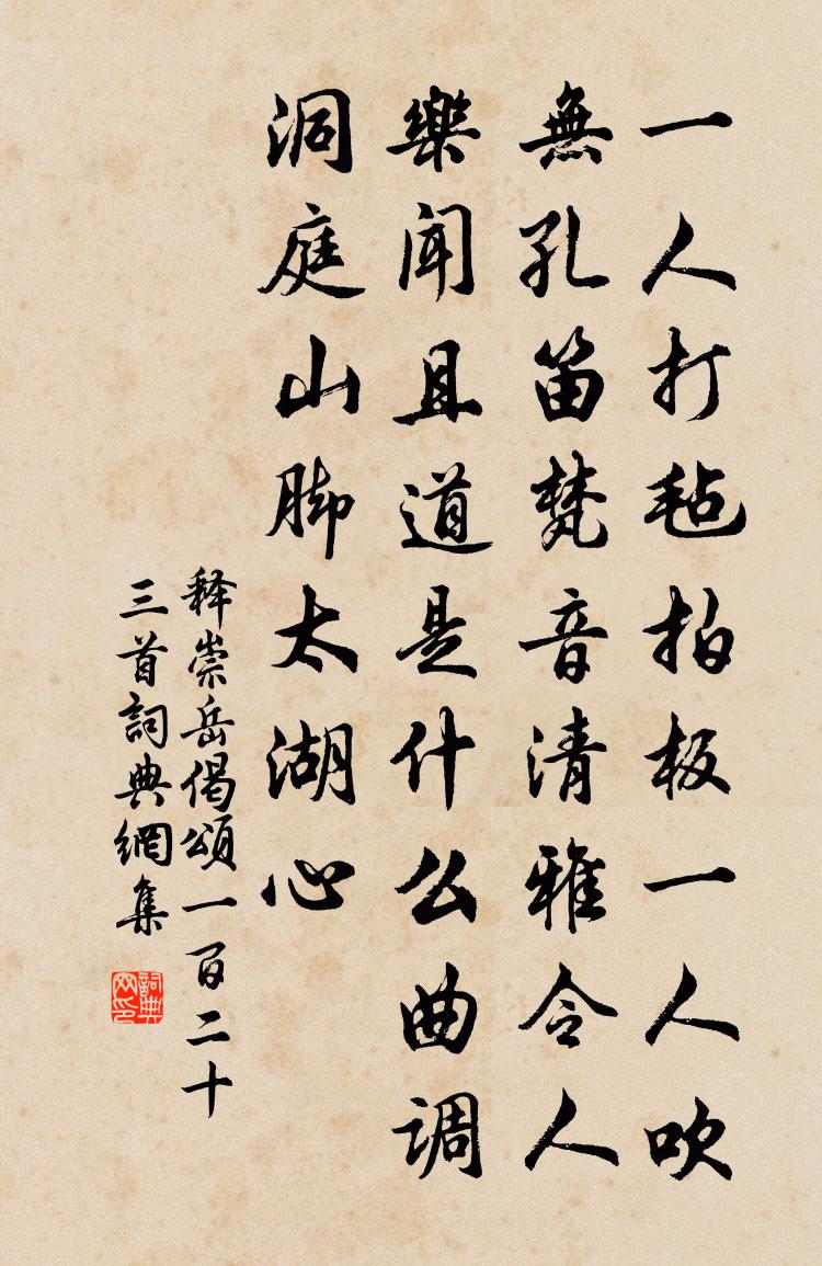 詩詞名句歷史字典書法欣賞書法字典國語詞典說文解字康熙字典古漢語字典標 題 作 者 詩 句 偈頌一百二十三首作者:釋崇岳 朝代:宋代偈頌一百二十三首原文一人打氈拍板,一人吹無孔笛。梵音清雅,令人樂聞。且道是什麼曲調,洞庭山腳太湖心。詩詞問答問:偈頌一百二十三首的作者是誰?答:釋崇岳問:偈頌一百二十三首寫於哪個朝代?答:宋代釋崇岳偈頌一百二十三首書法欣賞偈頌一百二十三首書法作品詩詞推薦三光會合 繼重陽韻馬鈺〔元代〕鄉關不住。謹依教語。脫身要歸去。何思何慮。略而分訴。任他魔阻。丹誠顯露。真心定處。去朋霞友聚。修行美上閩帥范石湖五首敖陶孫〔宋代〕丁年口伐真奇事,一代詩鳴不救貧。大手欲推浯水頌,群酋曾折石湖巾。乃今謝傳還初志,其奈王陽是故人。獨有清平樂朱敦儒〔宋代〕春寒雨妥。花萼紅難破。繡線金針慵不作。要見鞦韆無那。西鄰姊妹丁寧。尋芳更約清明。畫個丙丁帖子,前階後十月見菊二首趙蕃〔宋代〕黃花狼籍晚猶香,冷蝶頻來著意忙。不見東籬千載士,自應埋沒老風霜。挽胡季昭李庭芝〔宋代〕玉李當春孟,公書以訃聞,但期同氣骨,不作異鄉墳。豈料鱗音後,俄傳蝶夢雲。想教寧越水,恨不識朱雲。蘇侍郎紫薇庭各賦一物得芍藥張九齡〔唐代〕仙禁生紅藥,微芳不自持。幸因清切地,還遇艷陽時。名見桐君籙,香聞鄭國詩。孤根若可用,非直愛華滋。春前一日還家方回〔宋代〕最險王乾三嶺路,加之雨滑馬行遲。忽驚山客俱來迓,誰報家人已預知。飣果待斟分歲酒,剪蔬先賦立春詩。春聞謝趙生惠芍藥三首陳師道〔宋代〕鬱郁芬芬十里薰,紅妅白白數枝春。要將結習惱鶖子,送與毗耶彼上人。歸來曲侯善淵〔元代〕修真理,何在*禪機。廣念葛藤空廝*,多參功案總虛脾。爭似悟無為。開道眼,一性出昏迷。竹密不妨流水過,玉樓春(贈李都監侍兒,是夕歌六么)胡銓〔宋代〕十年目斷鯨波闊。萬里相逢歌怨咽。髻鬟春霧翠微重,眉黛秋山煙雨抹。小槽旋滴真珠滑。斷送一生花十八。醉中重送李逢原歸蘇州梅堯臣〔宋代〕吳客歸從楚,霜華著馬蹄。倦童持弊橐,呼艇過寒溪。索寞區中飯,依稀日午雞。張儀猶舌在,不必愧於妻。贈趙舍人趙善括〔宋代〕季父英名上玉津,瞿曇抱送石麒麟。龍文寶冊傳青瑣,鳳閣鸞坡近紫宸。親老侍行知有子,才高見忌豈無人。洪崖次韻道夫待制萬象亭李彌遜〔宋代〕不見三秋若望霓,寒亭今得共攀躋。眼中遠樹兩行直,腳底孤煙百尺低。幻出璜台輝舊觀,旋安銀榜快新題。細聽熱華岳〔宋代〕翠微家在大江東,五月鞭驢入建中。雲烈火車天穀雨,汗淹香葛扇無風。不求殿閣千間庇,卻喜岩泉一線通。為汲丙寅元日李沂〔清代〕老屋河乾漸不支,年來河伯故相欺。頹檐缺壁還風雪,濁酒辛盤自歲時。浪把一生供敝帚,獨留雙眼看殘棋。陽回漁家邵定〔宋代〕漁家臨水住,春盡無花開。年年謝流水,流得好花來。期盧嵩,枉書稱日暮無馬不赴,以詩答韋應物〔唐代〕佳期不可失,終願枉衡門。南陌人猶度,西林日未昏。庭前空倚杖,花里獨留樽。莫道無來駕,知君有短轅。偈頌一百二十三首釋普度〔宋代〕老瞿曇,眼孔小。一星半星容不得,說迷說悟何時了。衲僧分上那有許多般,雪晴海闊千峰曉。留別白居易〔唐代〕秋涼卷朝簟,春暖撤夜衾。雖是無情物,欲別尚沉吟。況與有情別,別隨情淺深。二年歡笑意,一旦東西心。獨留雪中講堂賜酒二首楊萬里〔宋代〕袖手垂鞭出帝闉,萬花欄馬舞新春。是時也有青油繖,天上歸來雪滿身。名句推薦志以淡泊明,而節從肥甘喪矣。洪應明《菜根譚·概論》 有耳莫洗潁川水,有口莫食首陽蕨李白《行路難三首》 得閉口時須閉口,得放手時須放手。馮夢龍《醒世恆言·卷六》 壚邊人似月,皓腕凝霜雪。韋莊《菩薩蠻·人人盡說江南好》 冰炭不同器而久,寒暑不兼時而至韓非及後人《韓非子·顯學》 下謀上以術,術有窮者以力。來俊臣《羅織經·謀劃卷第九》 數畝荒園留我住,半瓶濁酒待君溫。蘇軾《正月二十日往岐亭郡人潘古郭三人送余於女王城東禪莊院》 巧而好度,必節;勇而好同,必勝;知而好謙,必賢。荀子《荀子·仲尼》 旅館寒燈獨不眠,客心何事轉悽然。高適《除夜作》 燕燕輕盈,鶯鶯嬌軟,分明又向華胥見。姜夔《踏莎行·自沔東來丁未元日至金陵江上感夢而作》