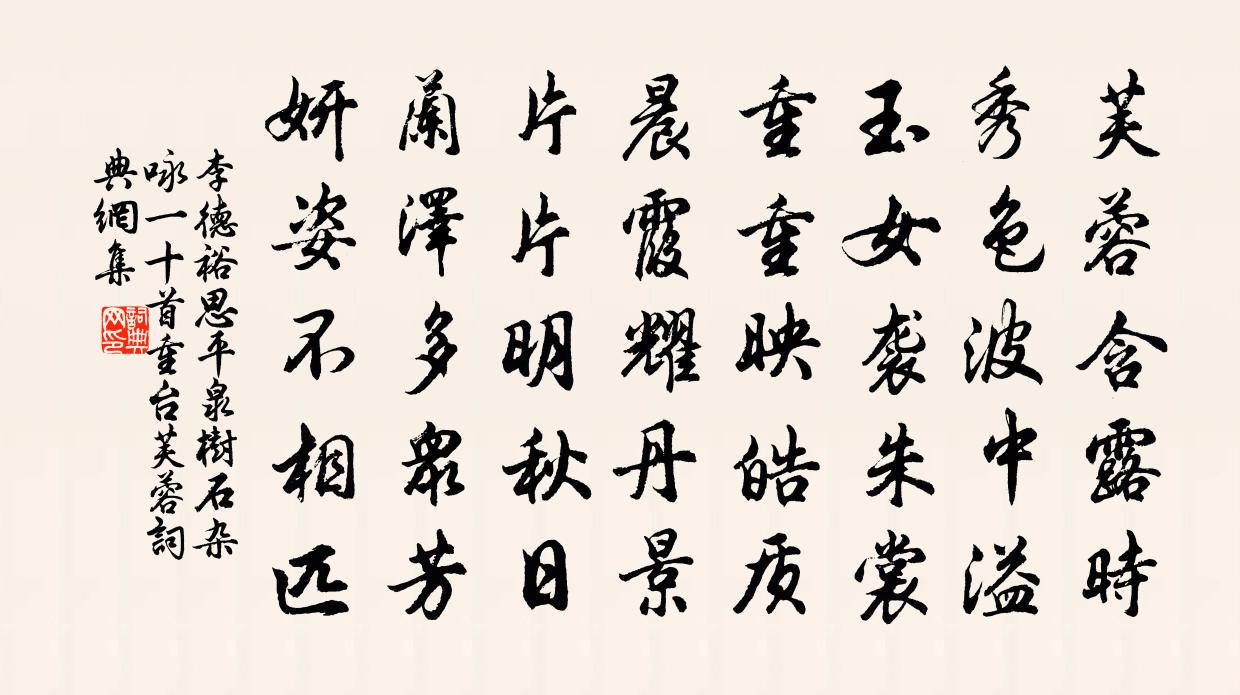 詩詞名句歷史字典書法欣賞書法字典國語詞典說文解字康熙字典古漢語字典標 題 作 者 詩 句 思平泉樹石雜詠一十首重台芙蓉作者:李德裕 朝代:唐代原文芙蓉含露時,秀色波中溢。玉女襲朱裳,重重映皓質。晨霞耀丹景,片片明秋日。蘭澤多眾芳,妍姿不相匹。詩詞問答問:《思平泉樹石雜詠一十首重台芙蓉》的作者是誰?答:李德裕問:該詩寫於哪個朝代?答:唐代書法欣賞思平泉樹石雜詠一十首重台芙蓉書法作品注釋全唐詩:卷475-101詩詞推薦題福州天王閣徐夤〔唐代〕絕境宜棲獨角仙,金張到此亦忘還。三門裡面千層閣,萬井中心一朵山。江拗碧灣盤洞府,石排青壁護禪關。有時滿庭芳(胡汝明罷帥歸,坐間次韻作)葛立方〔宋代〕江國麾幢,邊城鼓角,溢川幾報嚴更。笑談油幕,英傑為時生。腹貯六韜三略,新詩就、矛槊頻橫。功名事,他年劍客慕幽〔唐代〕去住知何處,空將一劍行。 * 雖取次,為事愛公平。戟立嗔髭鬢,星流忿眼睛。曉來湘市說,拂曙別遼城。禪人並化主寫真求贊釋正覺〔宋代〕霜洗斗魁,秋生河漢。形夭矯而長松參雲,氣澄明而余潦退岸。閒居述事邵雍〔宋代〕清歡少有虛三日,劇飲未嘗過五分。相見心中無別事,不評興廢即論文。句王曾〔宋代〕明朝知是天中節,旋刻菖蒲要辟邪。出嶺曾幾〔宋代〕乞得身閒又御魑,干戈瘴癘兩危機。三年似涉新冰過,十口今持舊璧歸。天靜不憂鴻北向,月明休詠鵲南飛。只應酬白雲張道士惠詩王炎〔宋代〕不但學仙仍學詩,年來古錦富珠璣。卻疑汗漫騎鯨李,誤向天台訪子微。和楊秋止酒韻陳宓〔宋代〕快意誠甘疢,折肱知妙方。飯餘書可讀,茗過味偏長。南浦煙雲密,東皋耒耜忙。青春深幾許,明日又流觴。投宿清福寺趙蕃〔宋代〕落日迷墟落,林霏隔樹林。入門疑寺近,出谷聽鍾深。墐戶覓安寢,隔籬謀濁斟。不眠還耿耿,百眠攪予心。問答梅堯臣〔宋代〕青雲梯,尺木為階行勿迷。勤修道業生羽翼,天門九襲須攀隮。淳熙七年春帖子崔敦詩〔宋代〕天上春光別,東皇管領來。初從旗氣轉,旋逐蹕聲回。晚晴見終南諸峰賈島〔唐代〕秦分積多峰,連巴勢不窮。半旬藏雨里,此日到窗中。圓魄將升兔,高空欲叫鴻。故山思不見,碣石泬寥東。水調歌頭 黃州快哉亭贈張偓佺蘇軾〔宋代〕落日繡簾卷,亭下水連空。知君為我新作,窗戶濕青紅。長記平山堂上,欹枕江南煙雨,杳杳沒孤鴻。認得醉翁語代內蘇泂〔宋代〕孟光書寄與梁鴻,薪粲年年幸可同。觸熱忘歸渾細事,笑人應有北窗風。感事四首歐陽修〔宋代〕仙境不可到,誰知仙有無。或乘九斑◇,或駕五雲車。朝倚扶桑枝,暮游崑崙墟。◇來幾萬里,誰復遇諸塗。富貴天育二老禪惠示經佛偈答以十詩鄭清之〔宋代〕老胡無聖亦無言,驀指虛空喚作禪。掌血條痕無著處,教誰白地患青顛。朱康叔郎中棄宮求母於金州因會華清宮作此詩文同〔宋代〕蟠桃實在枝,蟠桃花已飛。相隔五十春,一旦還相依。康叔視金龜,解去如糞土。徒步入嶢關,金州取其母。古人日本照禪者欲得數徑以述懷贈之釋智愚〔宋代〕世路多巘險,無思不研窮。平生見諸老,今日自成翁。認字眼猶綻,過譚耳尚聾。洞庭秋月楊公遠〔宋代〕月色湖天浸岳城,盧花渺渺白鋪汀。玻瓈萬頃清無滓,只有君山一點青。名句推薦勝概日相與,思君心鬱陶。岑參《鞏北秋興寄崔明允》 隔戶楊柳弱裊裊,恰似十五女兒腰。杜甫《絕句漫興九首·其一》 遙憐小兒女,未解憶長安。杜甫《月夜》 積善逢善,積惡逢惡。馮夢龍《喻世明言·卷二十六》 驪山四顧,阿房一炬,當時奢侈今何處?張養浩《山坡羊·驪山懷古》 北山白雲里,隱者自怡悅孟浩然《秋登萬山寄張五/九月九日峴山寄張子容》 君埋泉下泥銷骨,我寄人間雪滿頭。白居易《夢微之》 舍近謀遠者,勞而無功范曄《後漢書·列傳·吳蓋陳臧列傳》 但遠山長,雲山亂,曉山青。蘇軾《行香子·過七里瀨》 淡淡橫朝煙,脈脈深秋思。劉道著《湘江秋曉》