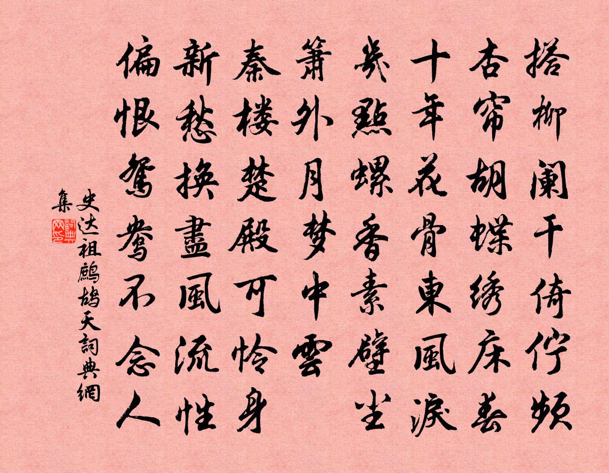 結句“偏恨鴛鴦不念人”,愁緒 * ,餘韻不盡。全詞和婉工巧,綺麗動目。