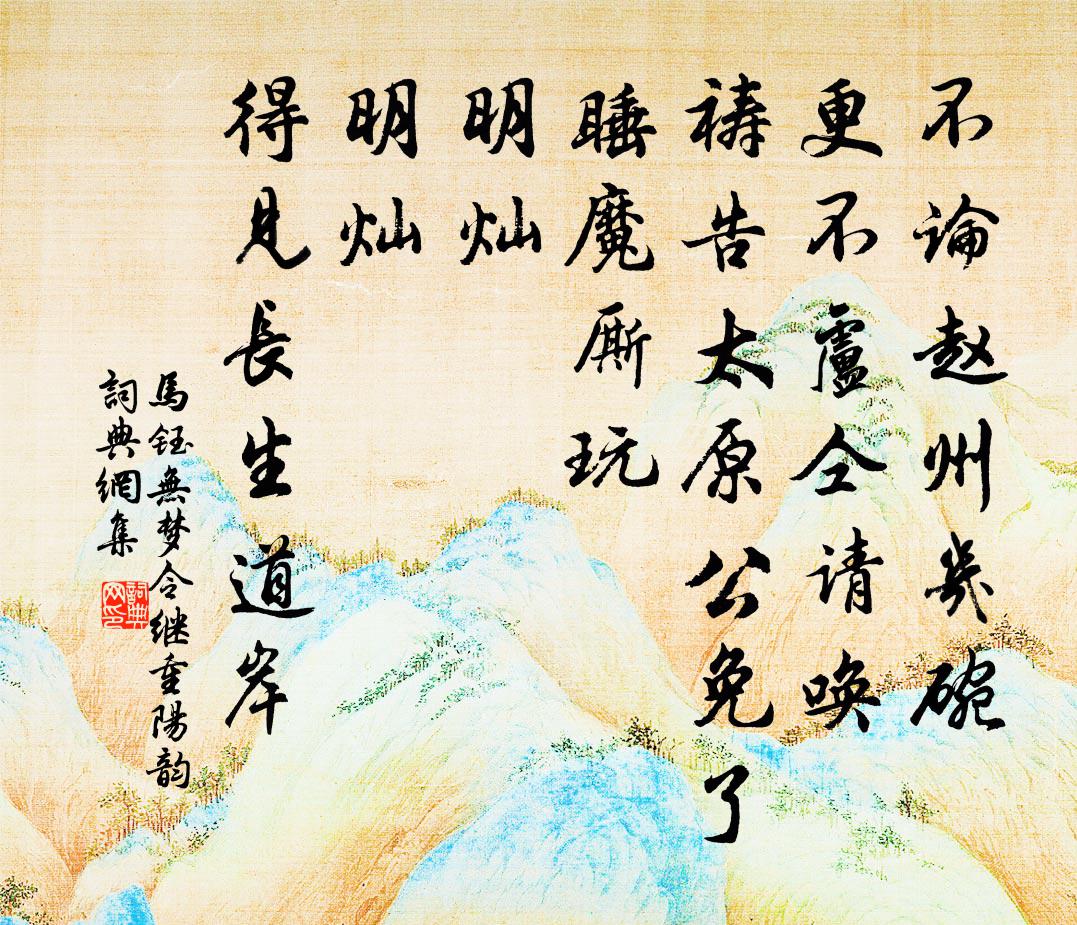 詩詞名句歷史字典書法欣賞書法字典國語詞典說文解字康熙字典古漢語字典標 題 作 者 詩 句 無夢令 繼重陽韻作者:馬鈺 朝代:元代無夢令 繼重陽韻原文不論趙州幾碗。更不盧仝請喚。禱告太原公,免了睡魔廝玩。明燦。明燦。得見長生道岸。詩詞問答問:無夢令 繼重陽韻的作者是誰?答:馬鈺問:無夢令 繼重陽韻寫於哪個朝代?答:元代問:無夢令 繼重陽韻是什麼體裁?答:詞馬鈺無夢令 繼重陽韻書法欣賞無夢令 繼重陽韻書法作品詩詞推薦題竹牟融〔唐代〕瀟灑碧玉枝,清風追晉賢。數點渭川雨,一縷湘江煙。不見鳳凰尾,誰識珊瑚鞭。柯亭丁相遇,驚聽奏鈞天。為章道祖頗及葛藤錦薰闔葛立方〔宋代〕窈窕軒窗小闔深,種花卜得半晴陰。眼根忽隨錦繡谷,鼻觀如游檐卜林。莫問花枝有開落,須知法性勿來今。色香送魯玉太博輓詞三首梅堯臣〔宋代〕試問於天下,誰從百歲心。短長從所盡,禍福乃相尋。只以名賓實,那論古至今。未能忘物境,空復嘆人琴。賦黃任道韓乾馬王令〔宋代〕天寶天子監天廄,吐蕃入馬上天壽。紫衣馭吏偏坐前,騎入都門不容驟。西極苜蓿得氣肥,六閒飛黃臥嗟瘦。千秋侯家鷓鴣鄭谷〔唐代〕江天梅雨濕江蘺,到處煙香是此時。苦竹嶺無歸去日,海棠花落舊棲枝。春宵思極蘭燈暗,曉月啼多錦幕垂。唯有枕簟入林僻花瓜留客遲十韻葉茵〔宋代〕數面成骨肉,子歸將何之。長嘯盼天外,雲意俱遲遲。雪中送黃希聲西歸陳起〔宋代〕可是歸心急,行裝冒雪夫。向來期重任,未可羨先鞭。人事虧盈月,煙波遠近船。明時困英特,此別又三年。寄王滌貫休〔唐代〕梅月多開戶,衣裳潤欲滴。寂寥雖無形,不是小讎敵。地虛草木壯,雨白桃李赤。永日無人來,庭花苦狼藉。吟高泛湖有作強至〔宋代〕不比危湍急瀨船,平湖慢槳恰相便。蓬飄萍泛真吾事,舞袖歌鬟付少年。和永叔內翰戲答梅堯臣〔宋代〕從他舞姝笑我老,笑終是喜不是惡。固勝兔子固勝鶴,四蹄撲握長啄啄。任看色與月光混,只欲走飛情意薄。拘之夢中作林景熙〔宋代〕珠鳧玉雁又成埃,斑竹臨江首重回。猶憶年時寒食祭,天家一騎捧香來。題雪竇千丈岩鄭清之〔宋代〕並海危峰駕六灶,招提深處綠周遭。樛松直上睡龍起,怒瀑飛來風虎啤。坐向亭空雲作伴,待看身與月爭高。山靈題人州礱岩胡寅〔宋代〕蓋山限華夷,夷水不得出。澗壑相奮撞,竟朽此山骨。想其初洞達,借勢有神物。臂開青石壁,黤黮烏龍窟。奔流光啟三年人日逢鹿司空圖〔唐代〕浮世仍逢亂,安排賴佛書。勞生中壽少,抱疾上升疏。日暖人逢鹿,園荒雪帶鋤。知非今又過,蘧瑗最憐渠。雨中贈尹少稷王洋〔宋代〕滯雨昏風漲野田,旅亭猶幸竊高眠。閉門不為辭賓客,開卷端如揖聖賢。夢裡壯周花里蝶,醉中徐邈酒中仟。老來百花橋況志寧〔宋代〕波光清淺玉虹橫,過客誰題柱上名。錦銹鋪張春色滿,小車花下麗人行。讀水雲丙子集聶守真〔宋代〕宇宙倉皇過一春,鶯花無主亦銷魂。冰霜不入狼頭帽,風雨偏凌犢鼻褌。擊楫當年無祖逖,聞雞中夜有劉琨。五陵謝仲適坐上送王敏仲北使蘇軾〔宋代〕衝風振河朔,飛霧失太行。相逢不相識,下馬鬚眉黃。洗眼忽驚笑,見此玉節郎。喜有賢主人,共此殘燭光。聚散代書寄吉十一張說〔唐代〕一雁雪上飛,值我衡陽道。口銜離別字,遠寄當歸草。目想春來遲,心驚寒去早。憶鄉乘羽翮,慕侶盈懷抱。零落護國寺秋吟八首白玉蟾〔宋代〕香篆孤煙裊,燈龕寸火微。夢和明月冷,心與白雲飛。名句推薦千里之馬時一有,其利緩;駑馬日售,其利急。韓非及後人《韓非子·說林下》 一日不作,百日不食。司馬遷《史記·三十世家·趙世家》 願妾身為紅菡萏。年年生在秋江上。歐陽修《漁家傲·近日門前溪水漲》 春種一粒粟,秋收萬顆子。李紳《古風二首 / 憫農二首》 芳樹無人花自落,春山一路鳥空啼。李華《春行即興》 不充詘於富貴,不遑遑於所欲。姚察、姚思廉《梁書·列傳·卷五十》 豈能無意酬烏鵲,惟與蜘蛛乞巧絲。李商隱《辛未七夕》 扁舟去作江南客,旅雁孤雲。朱敦儒《採桑子·彭浪磯》 事諸父,如事父。事諸兄,如事兄。李毓秀《弟子規·出則弟》 昔日芙蓉花,今成斷根草。李白《妾薄命》