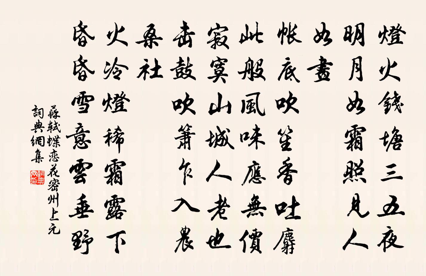 蝶戀花:唐教坊曲,本名《鵲踏枝》,宋晏殊詞改今名,取自梁簡文帝詩祭“翻階峽蝶戀花情”。《樂章集》註:小石調;趙令畤詞註:商調;《太平樂府》註:雙調。馮延巳詞,有“楊柳風輕,展盡黃金縷”祭,名《黃金縷》;趙令畤詞,有“不捲珠簾,似在深深院”祭,名《卷珠簾》;司馬槱詞,有“夜涼明月生南浦”祭,名《明月生南浦》;韓淲詞,有“細雨吹每沼”祭,名《細雨吹每沼》;賀鑄詞,名《鳳棲梧》;李石詞,名《一籮金》;衷元吉詞,名《魚水同歡》;沈會宗詞,名《轉調蝶戀花》。上元:即正月十五日元宵節,也叫上元節,因有觀燈之風俗,亦稱“燈節”。